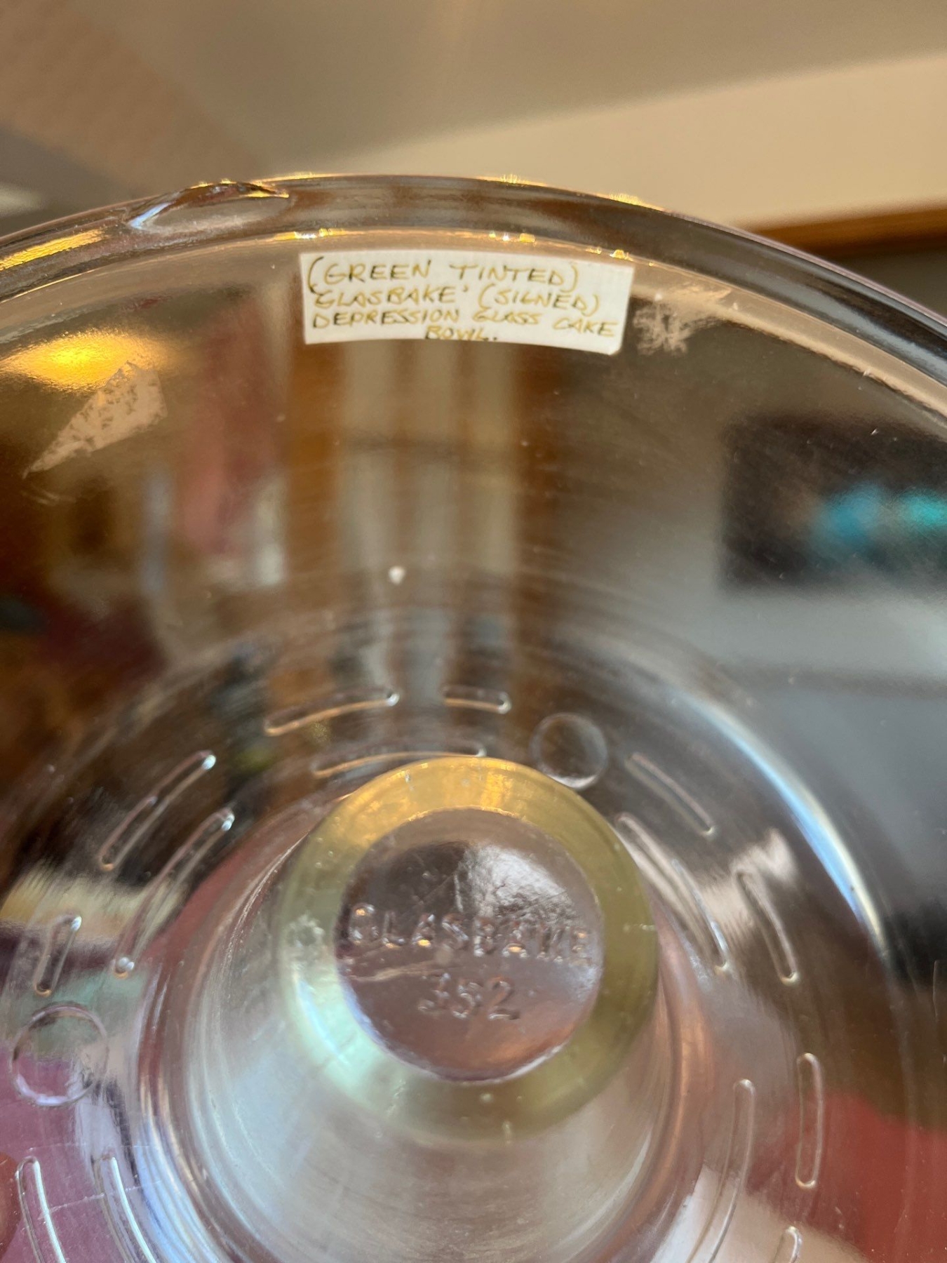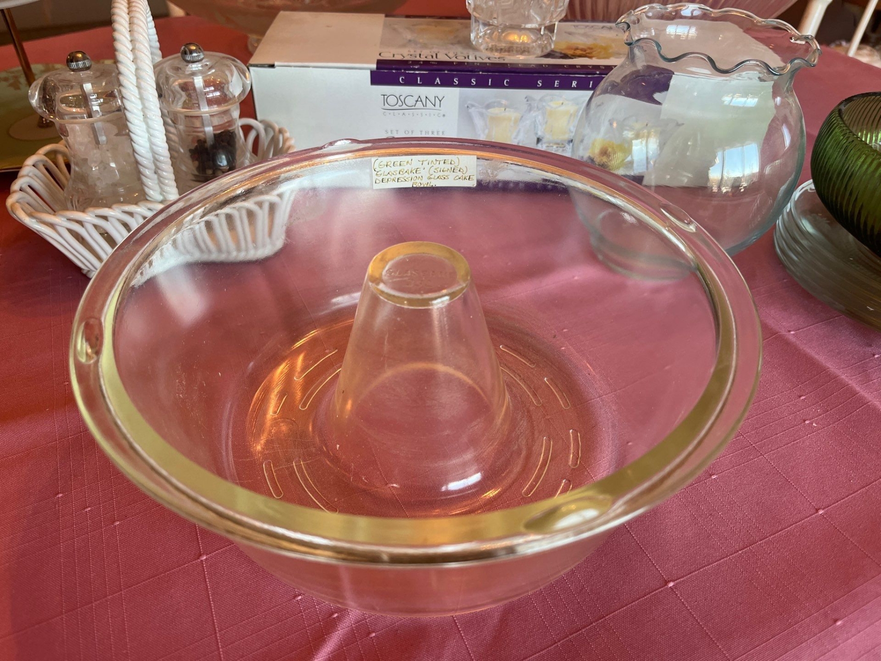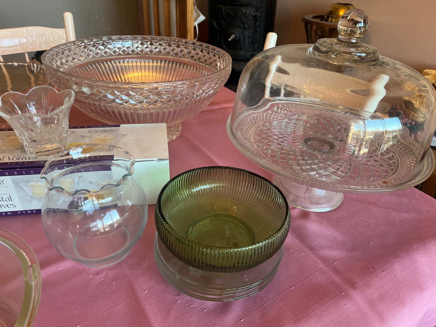 large punch bowls, serving dishes, salt, and pepper, shaker cake, bowl 2 tier mint green pastry plate made in England and Glasbake depression glass cake pan. Green color .
