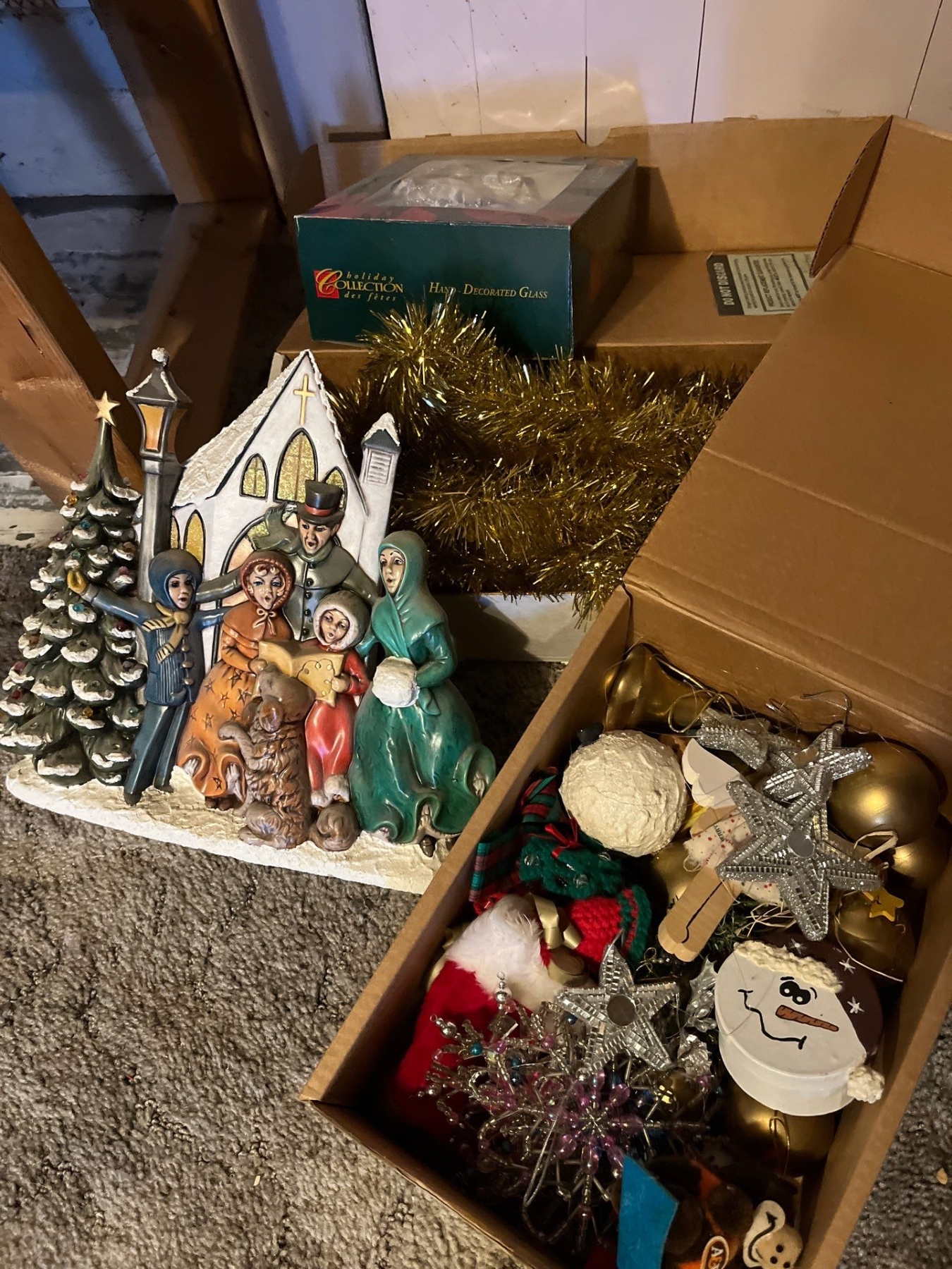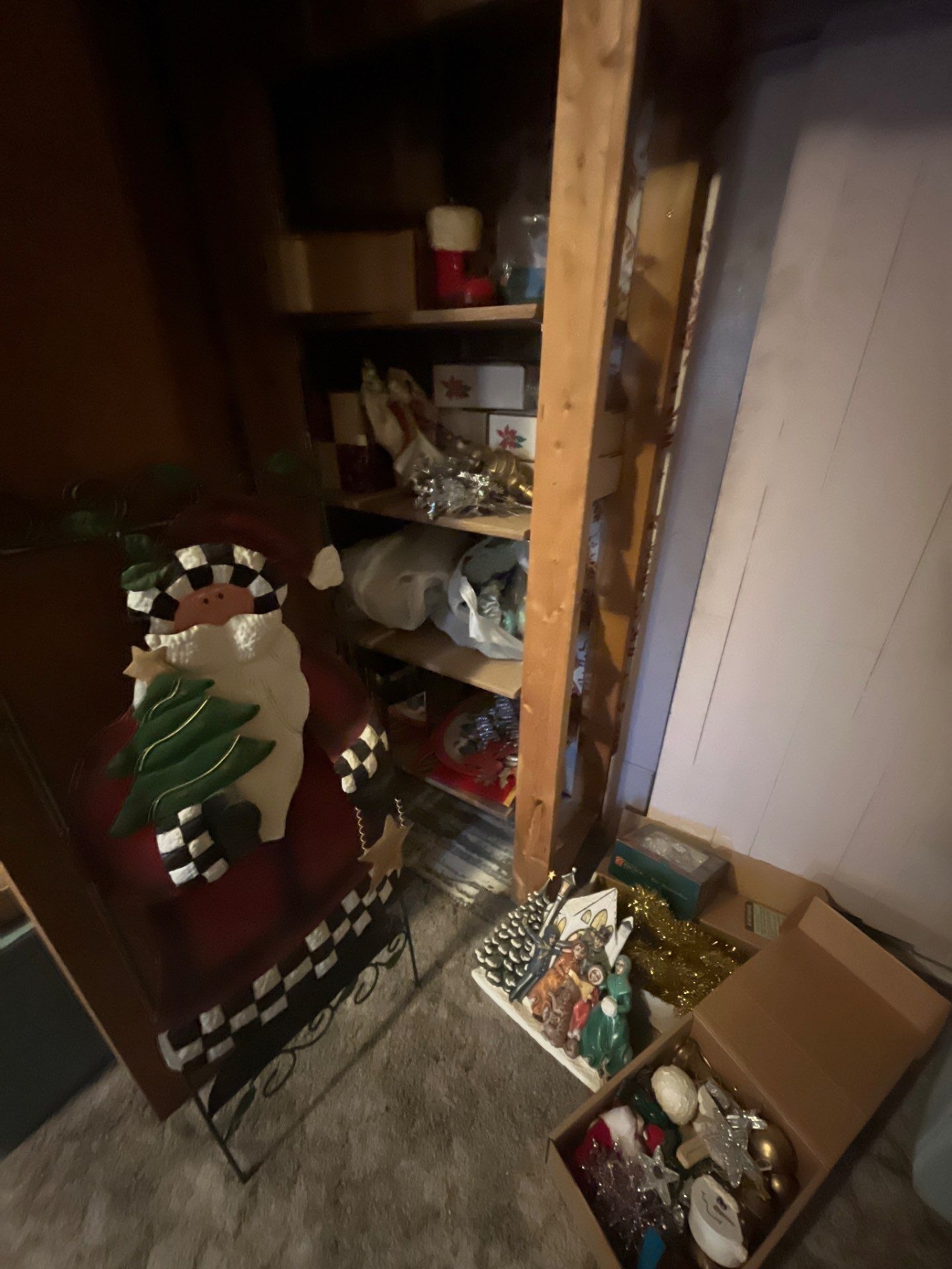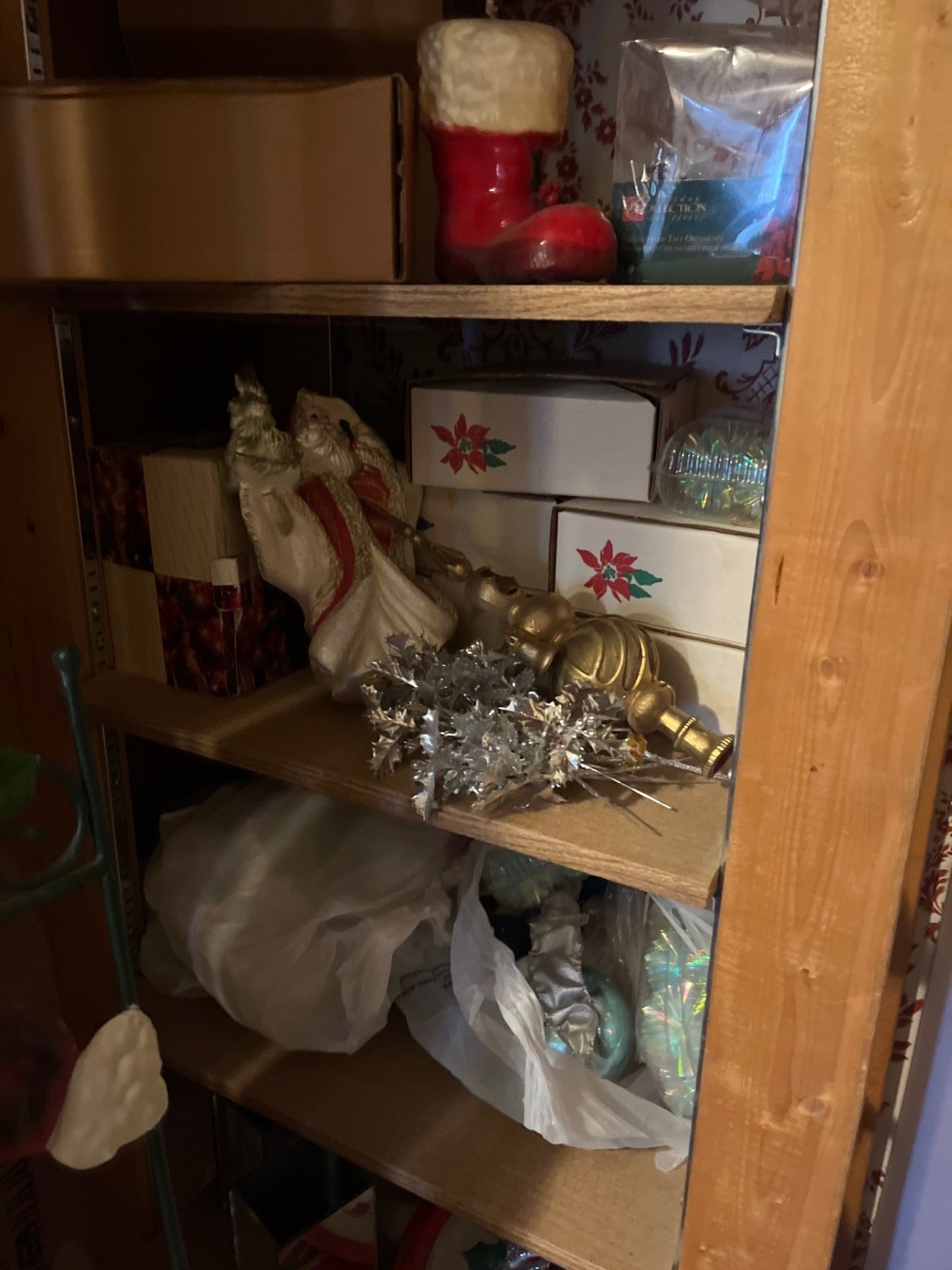 large shelf with vintage Christmas decorations