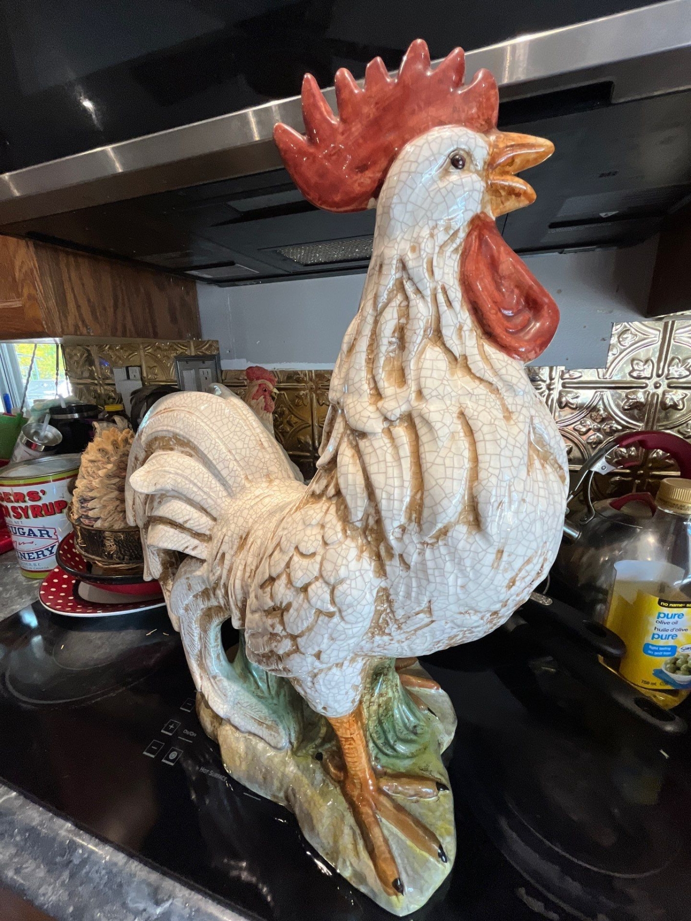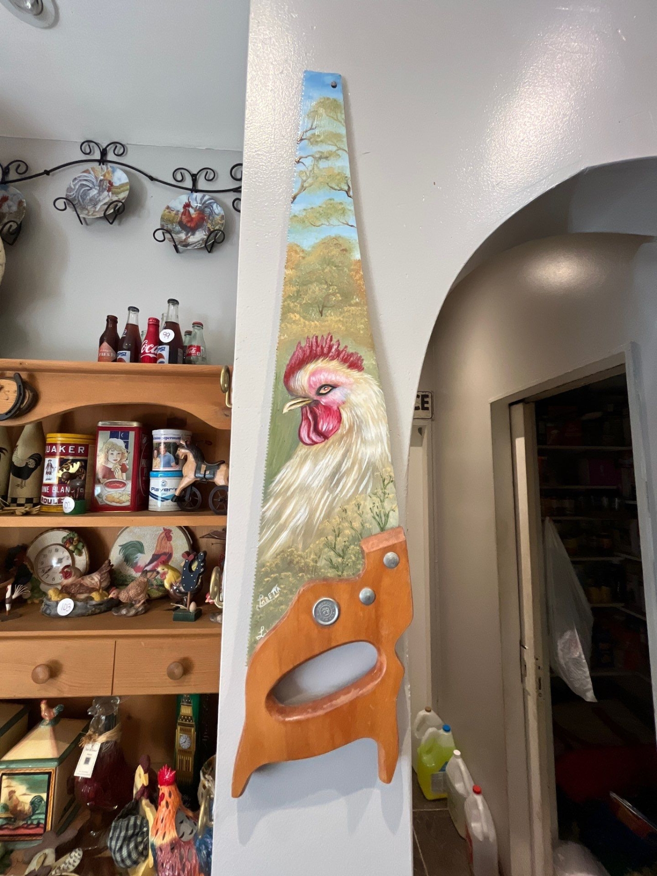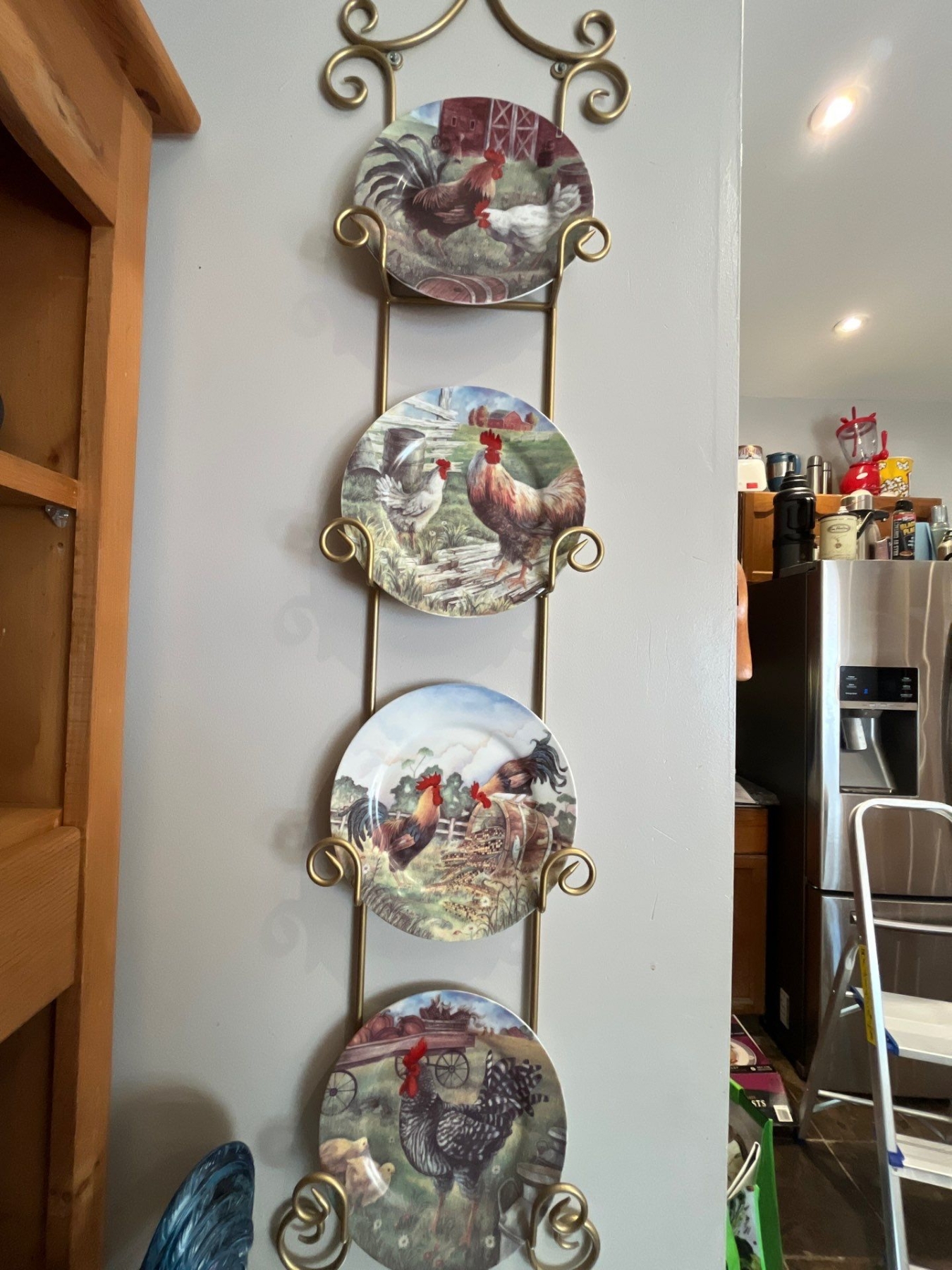 large white ceramic rooster With 4 collectors plates including rack and hand painted Roster Saw