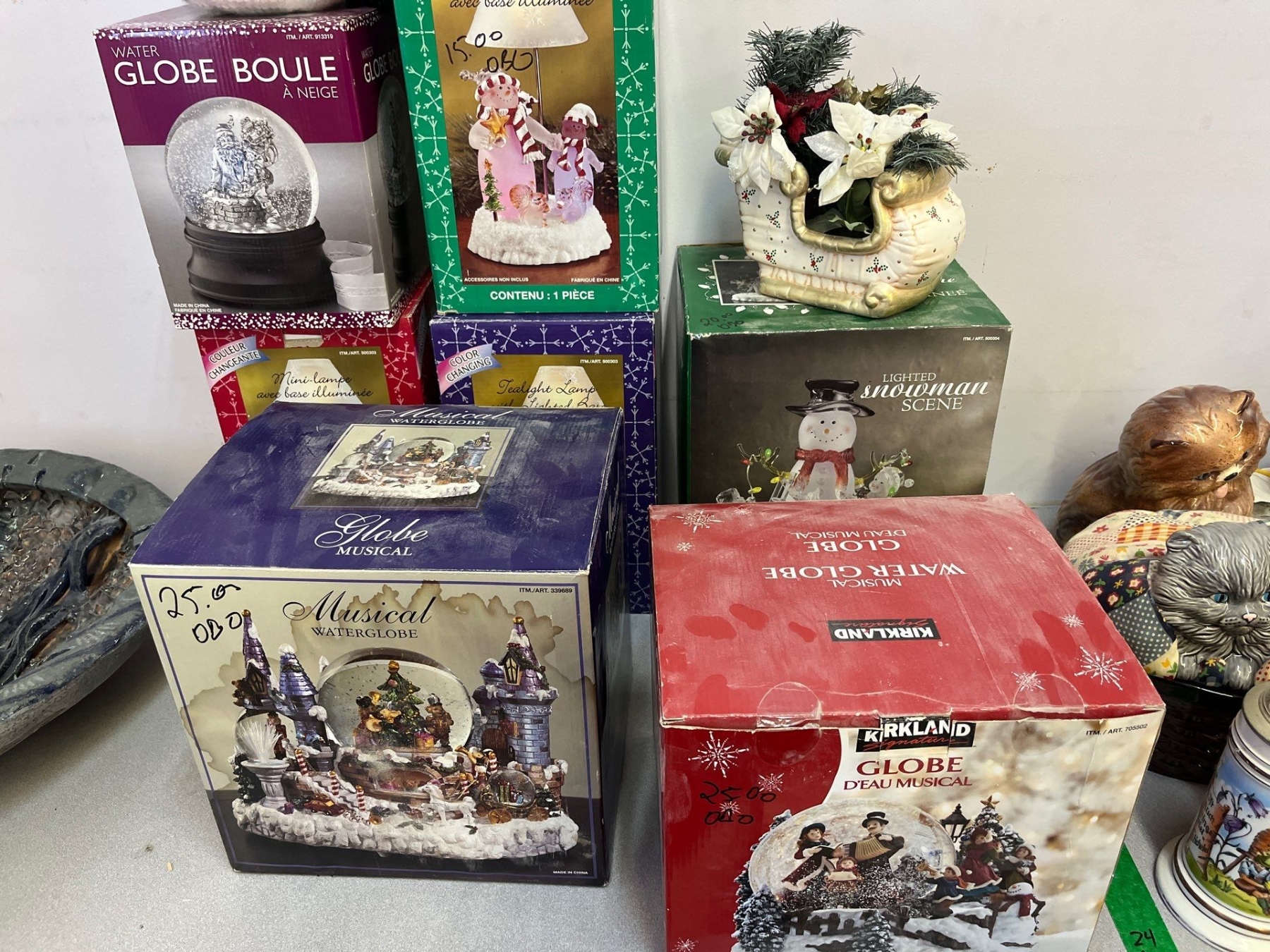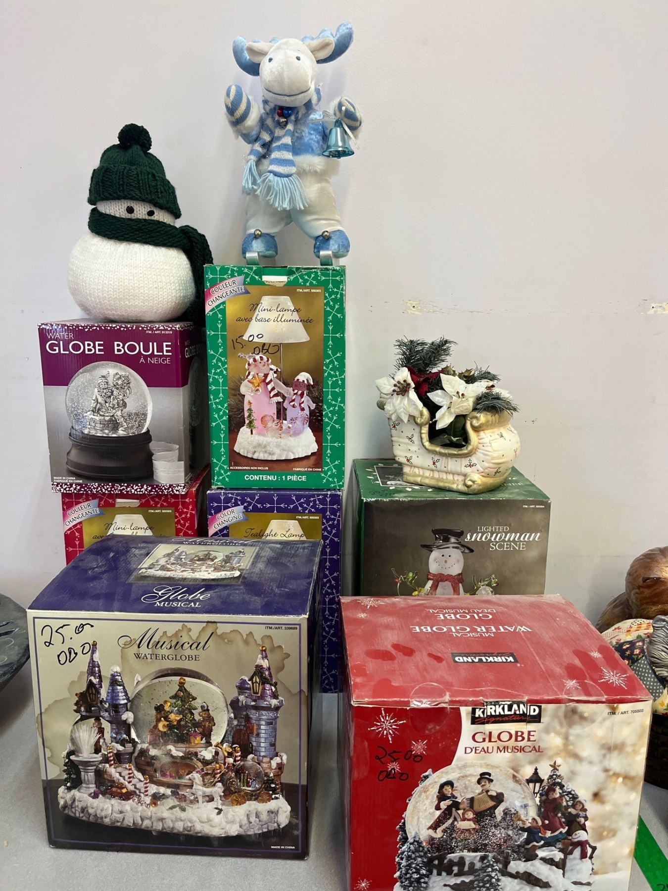 lighted snowman scene, one three water, globes, musical and 3T light lamps
