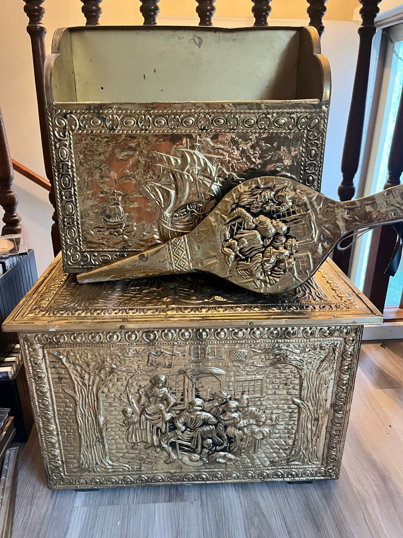 ornate brass wood box, paper box and blower