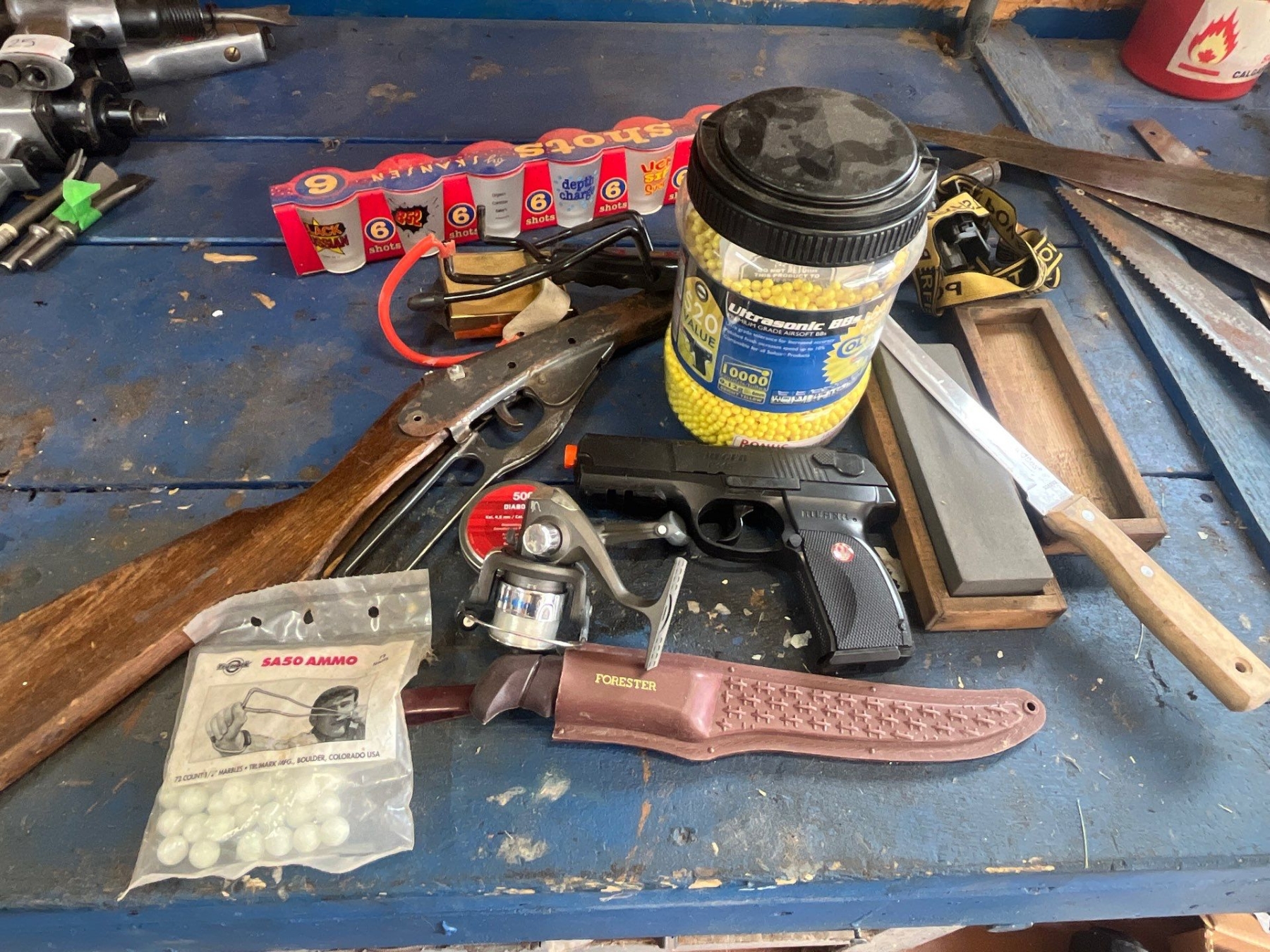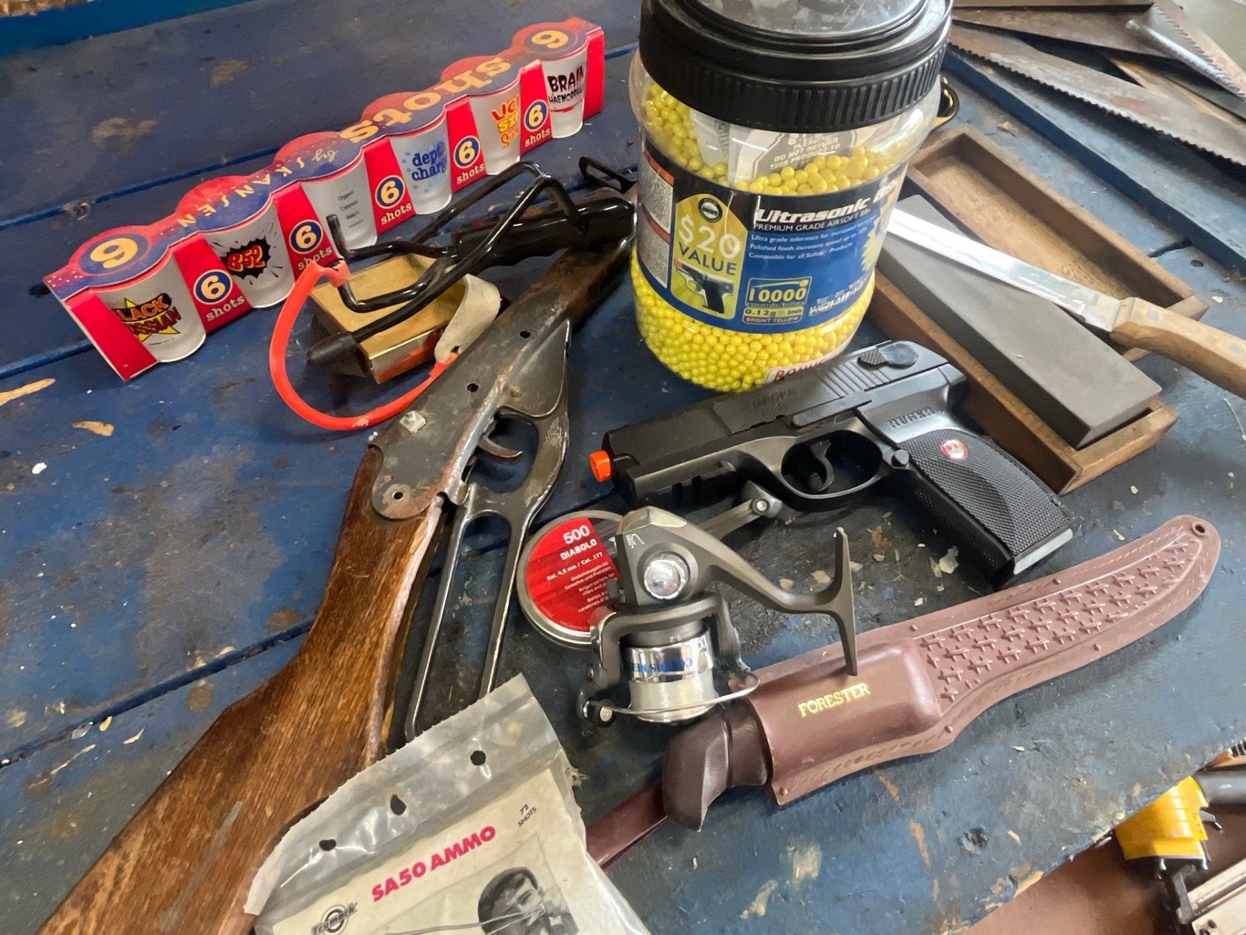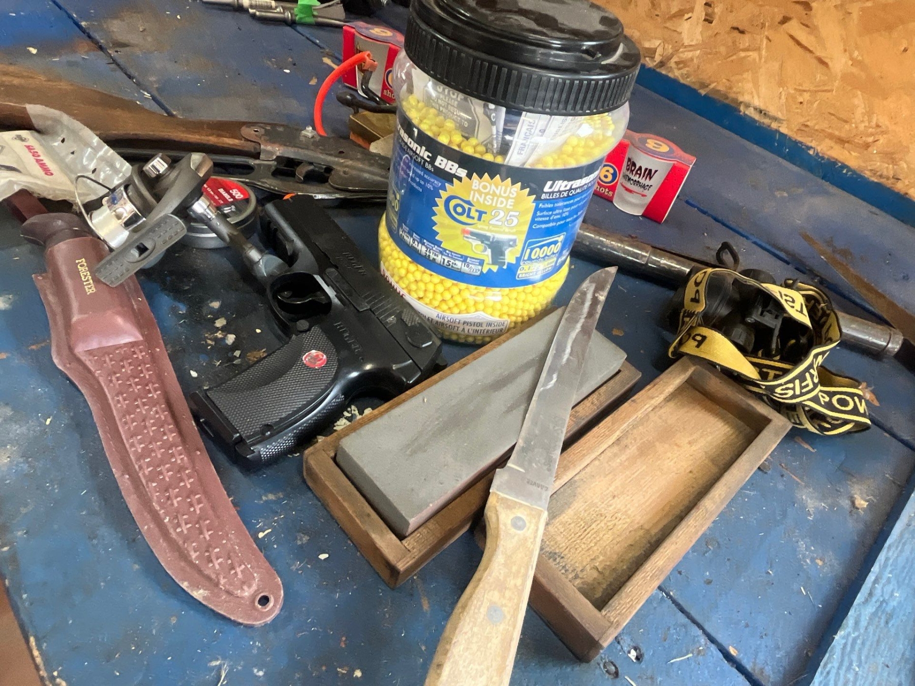 pellet, guns, fillet knives, fishing reel shot glass collection, and a vintage sharpening stone