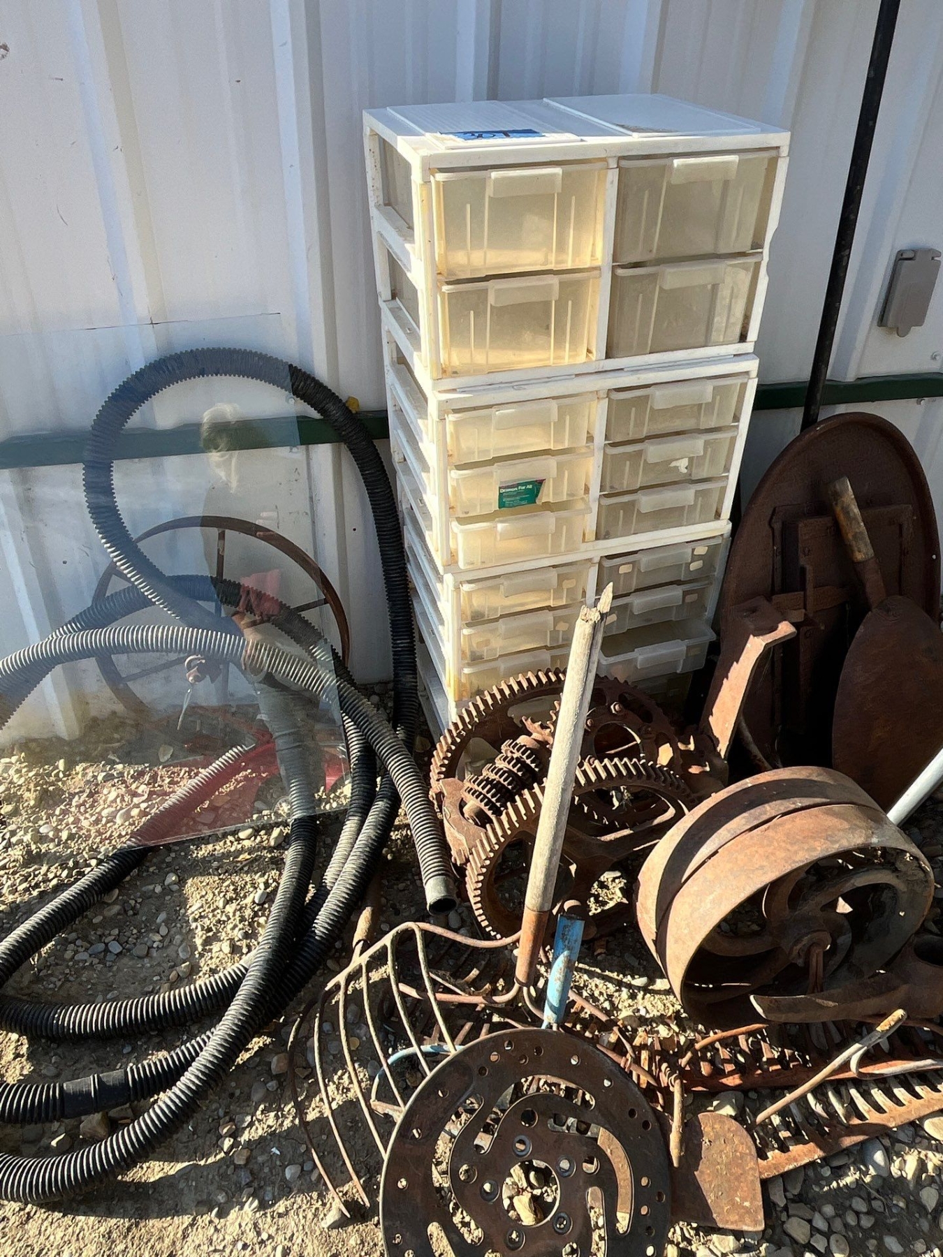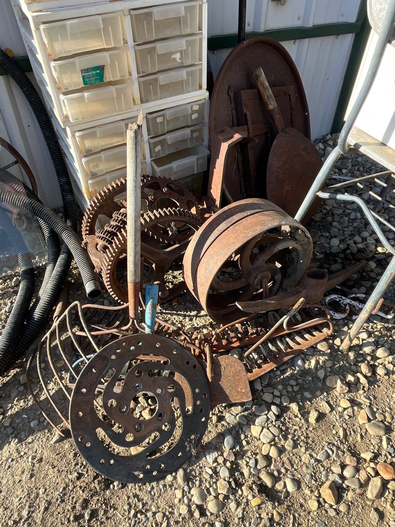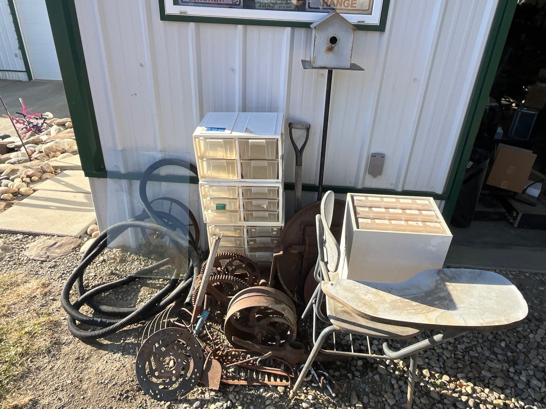 selection of cast-iron pieces, birdhouse, old school desk, and a number of other items to make yard birds and another yard art