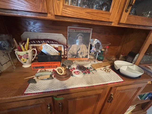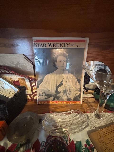 selection, serving dishes, collectable items, placemats hot pads and a star weekly from 1951 with the queen on it