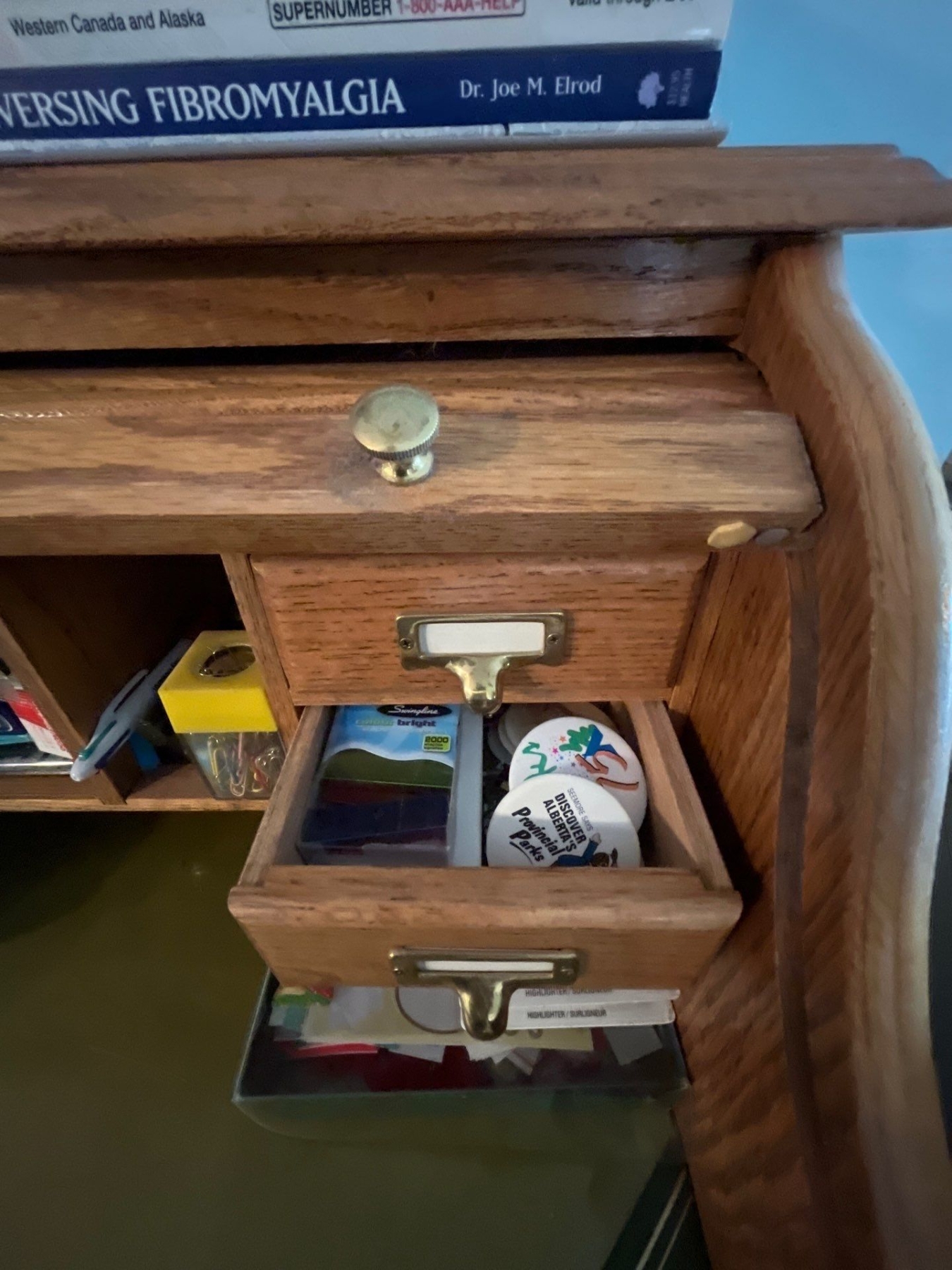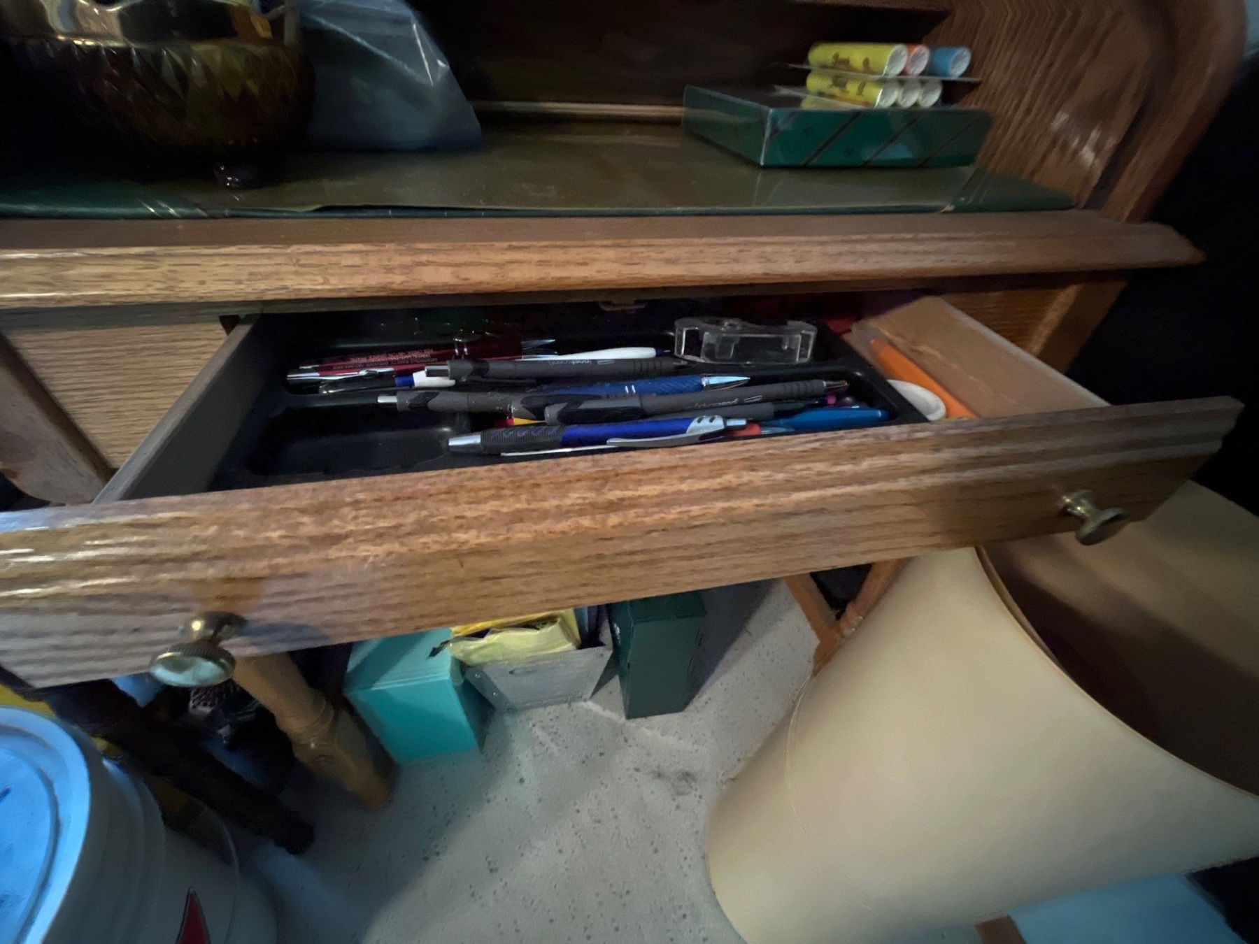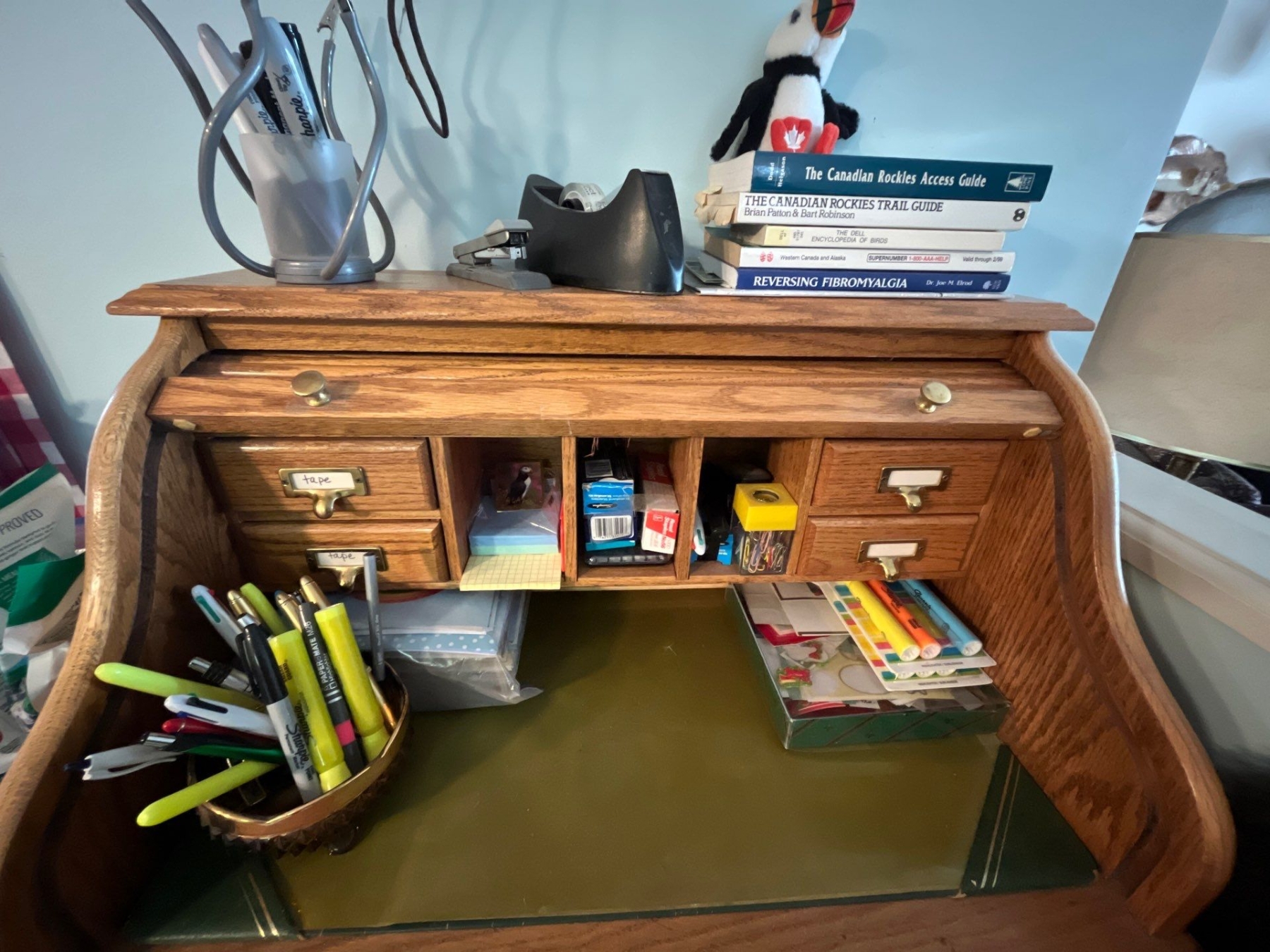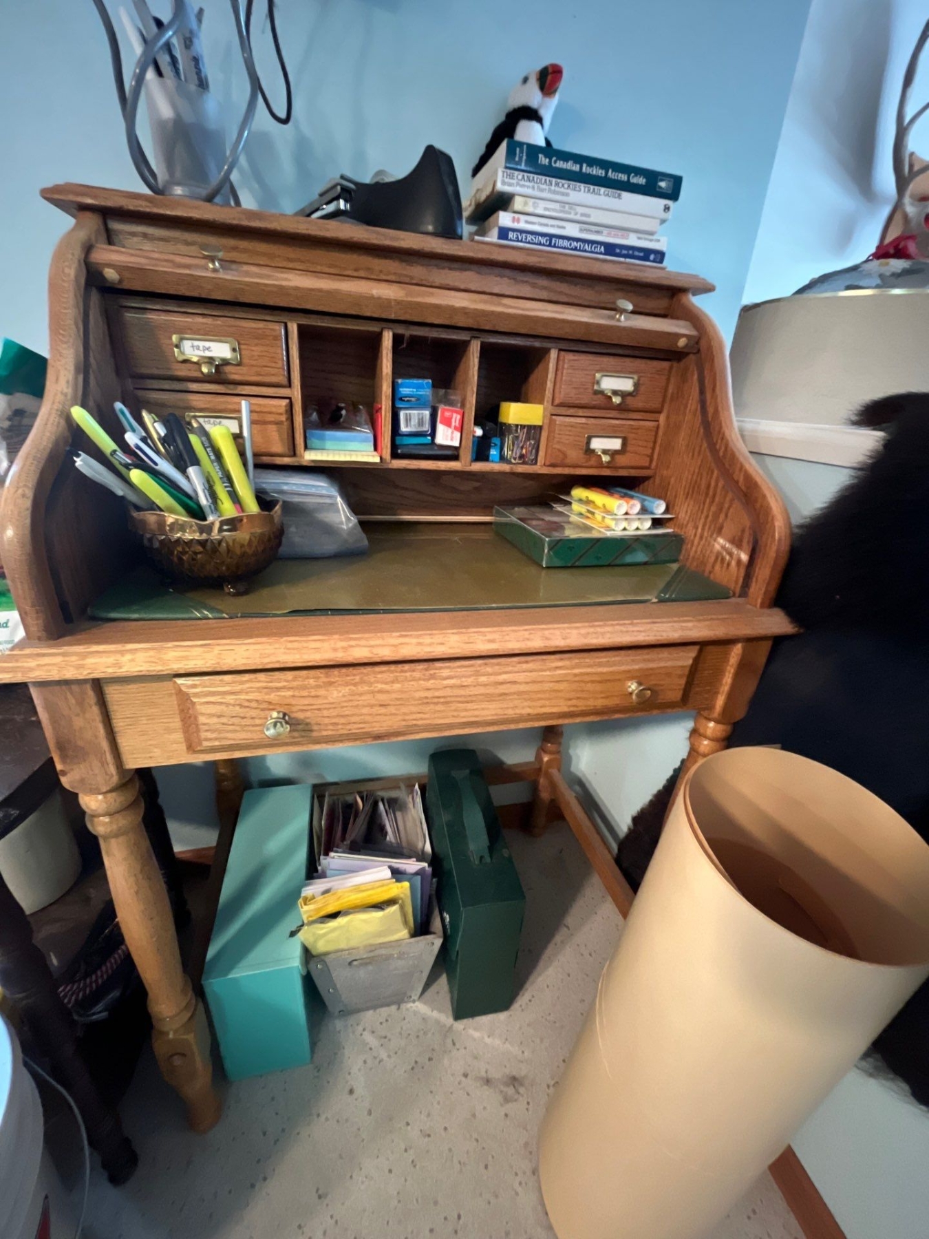 small oak wood roll top desk, including all contents 42”H 18”d 28”