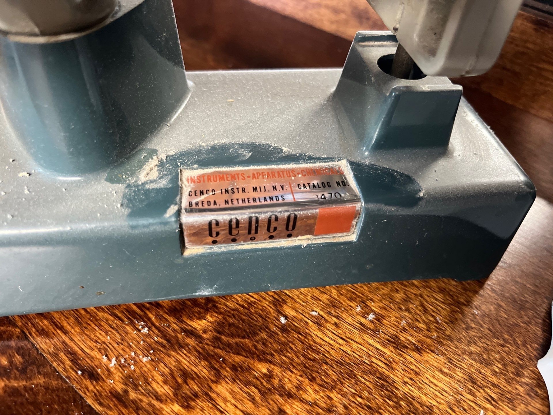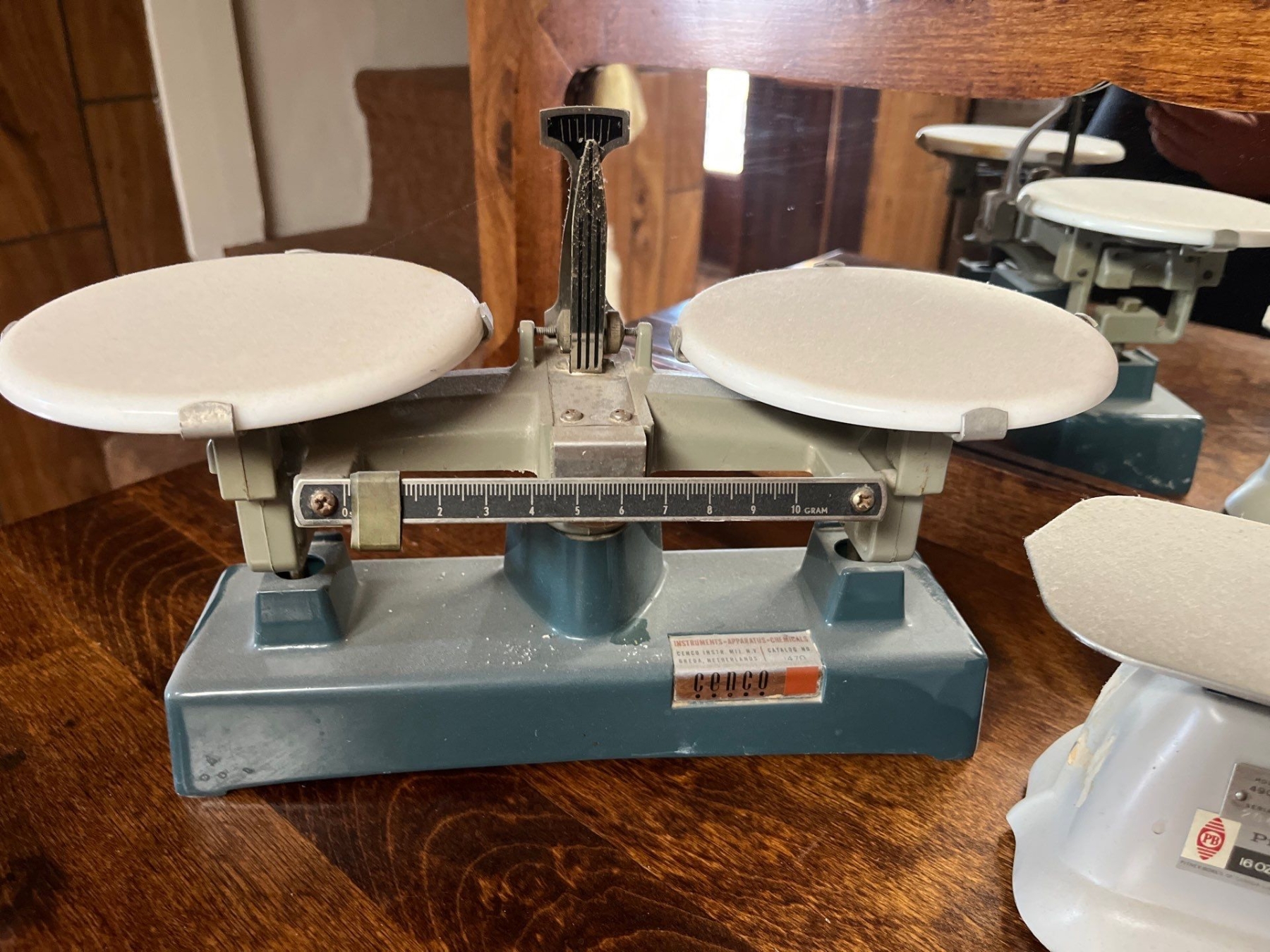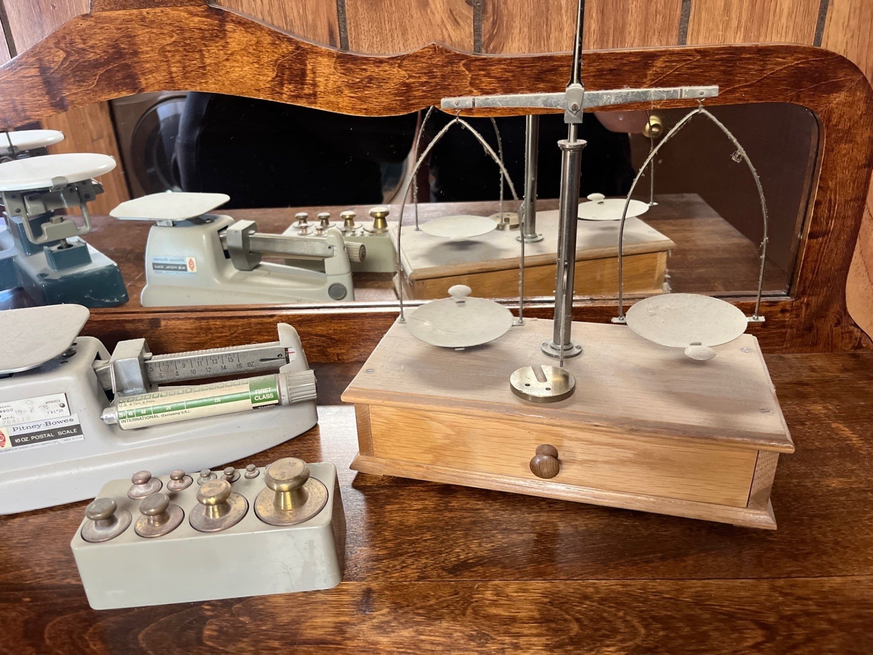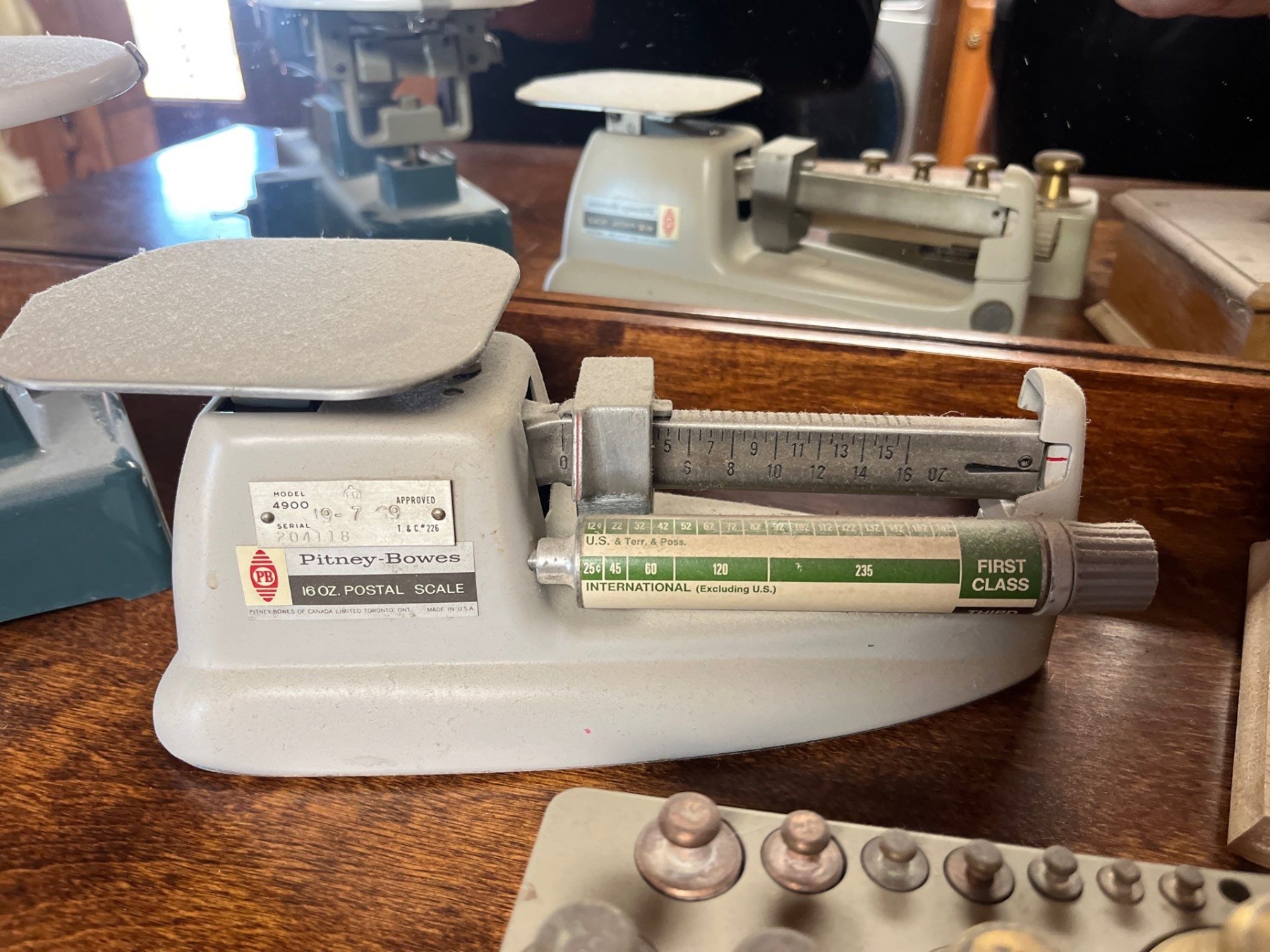 three antique scales by Pitney Brown, 16 ounce postal scale Cenco scale and a two phase hanging scale