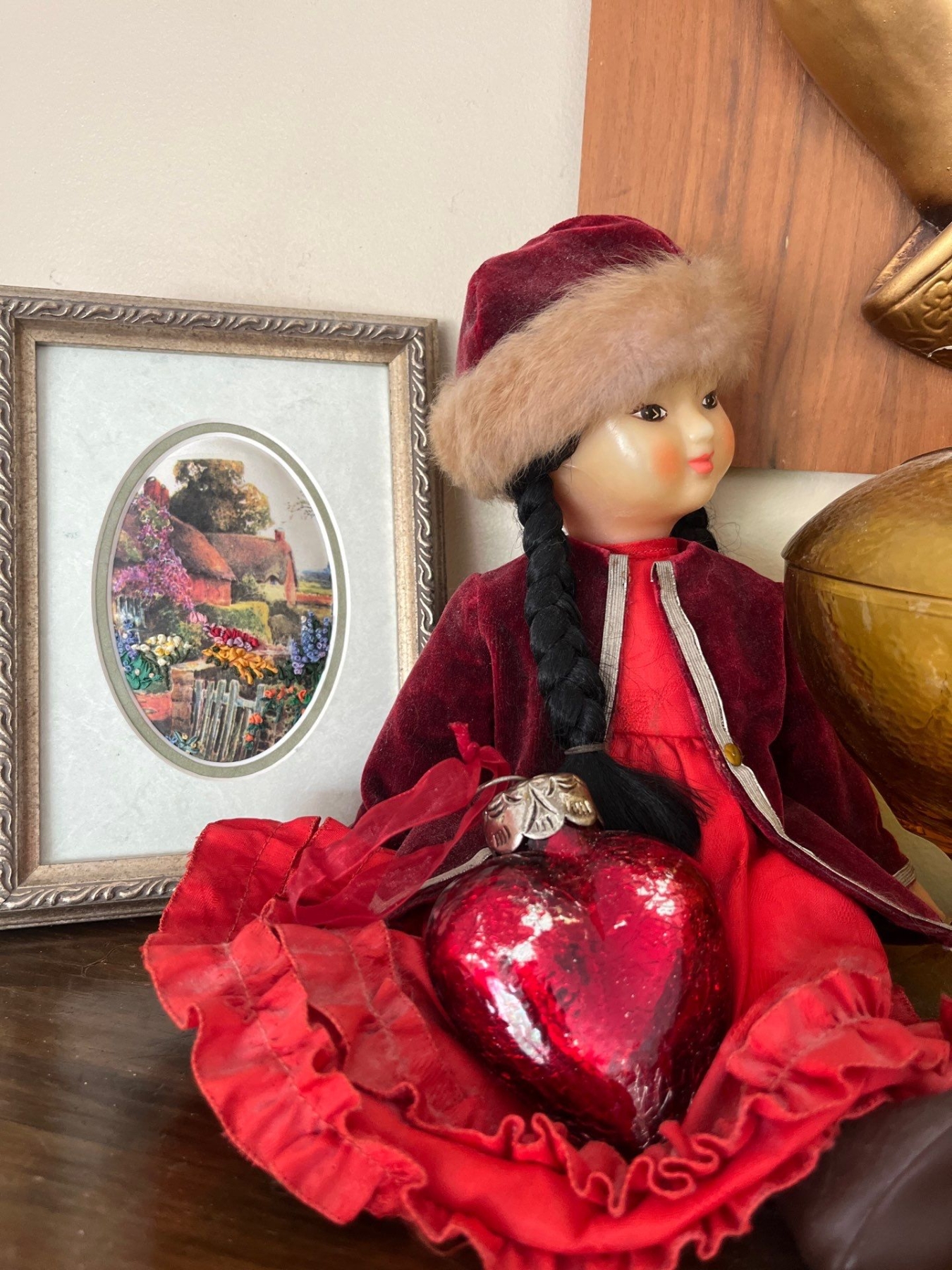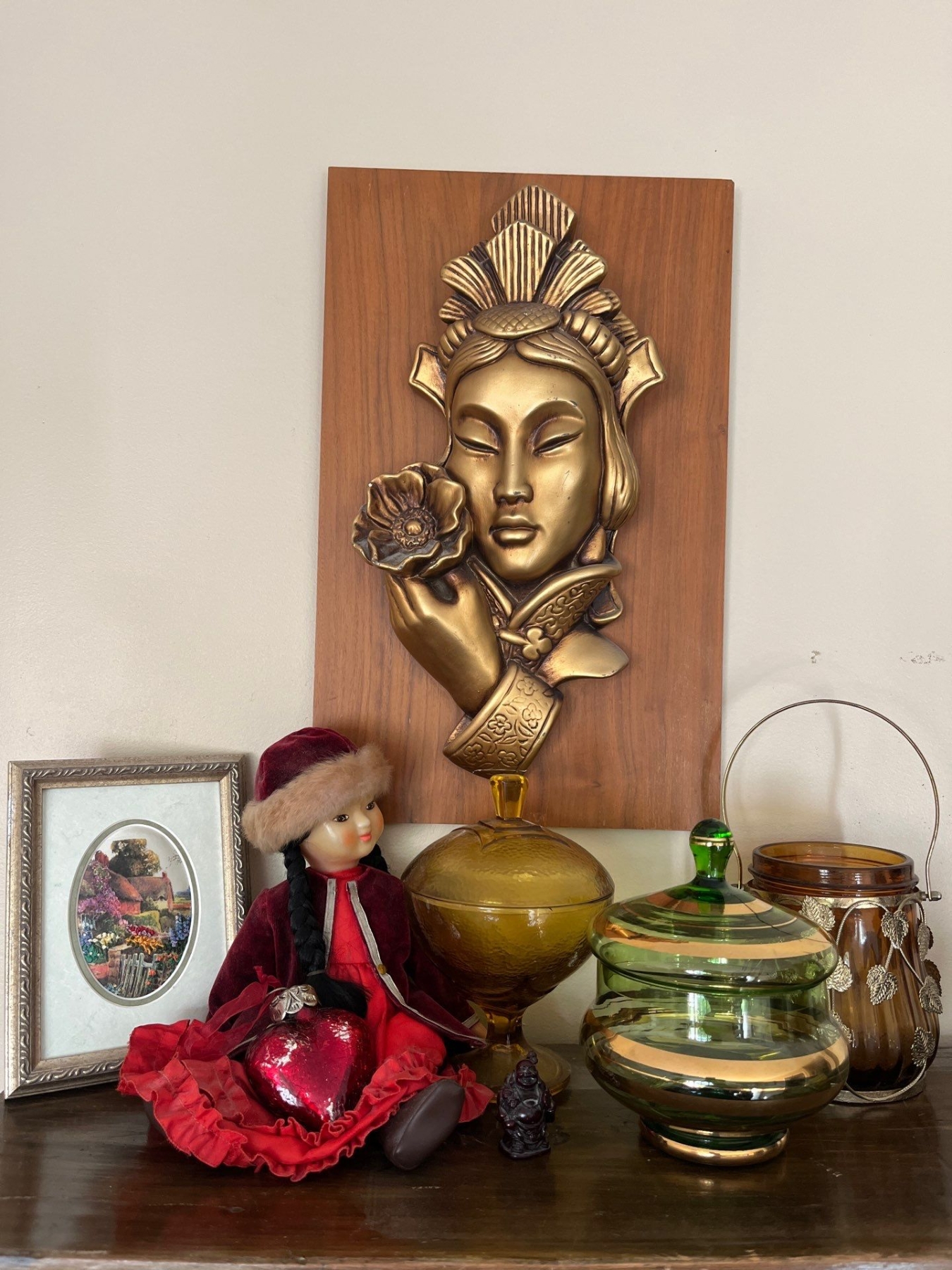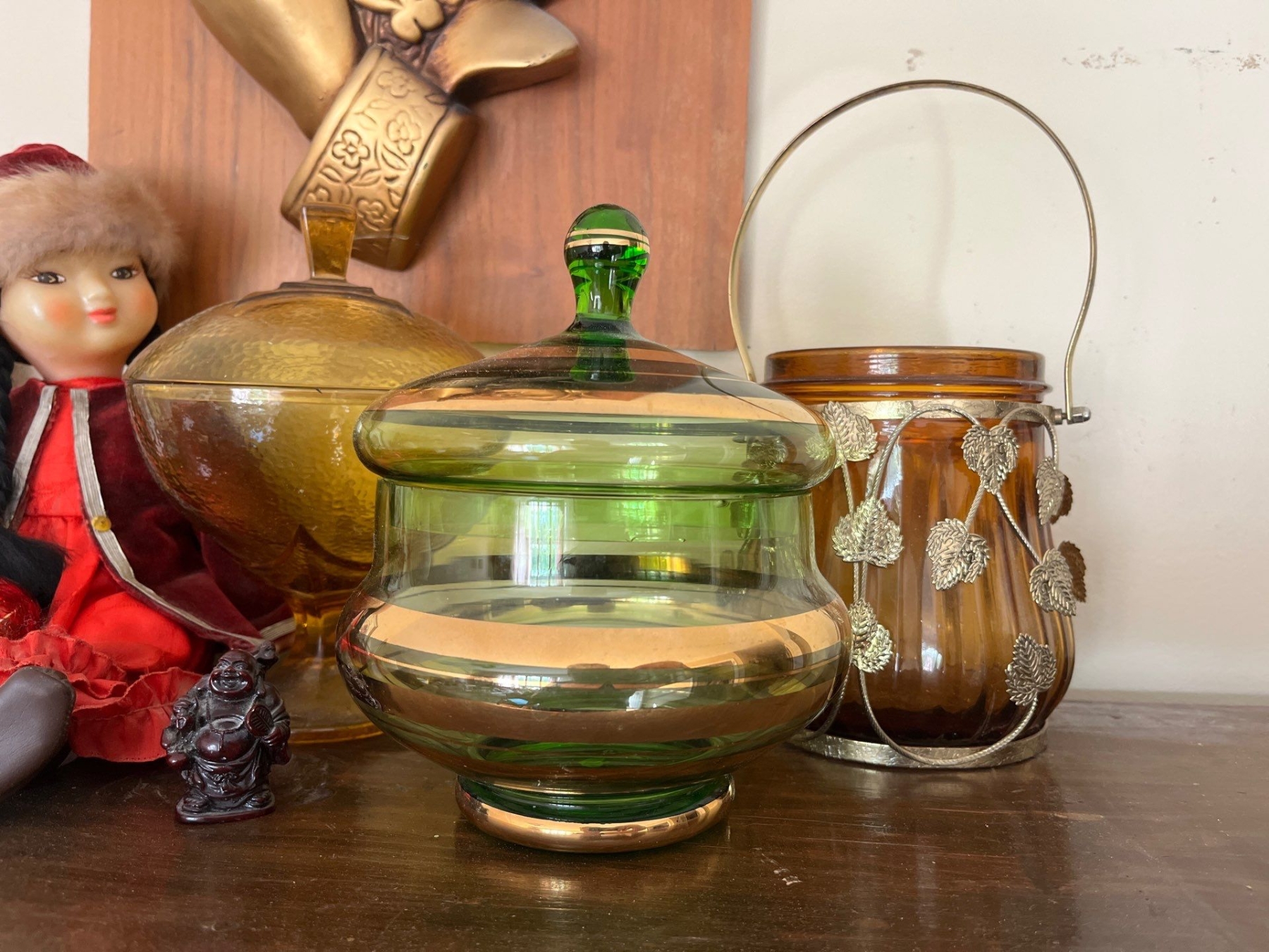Three coloured glass candy dishes with art, deco, picture, and vintage flower picture