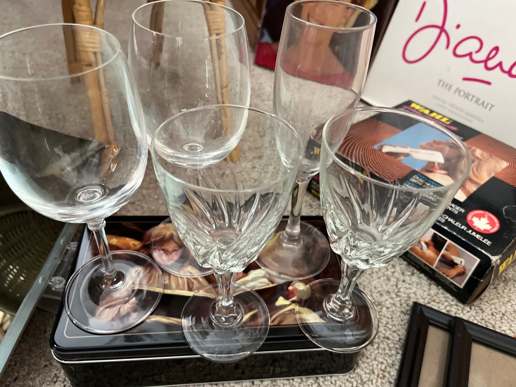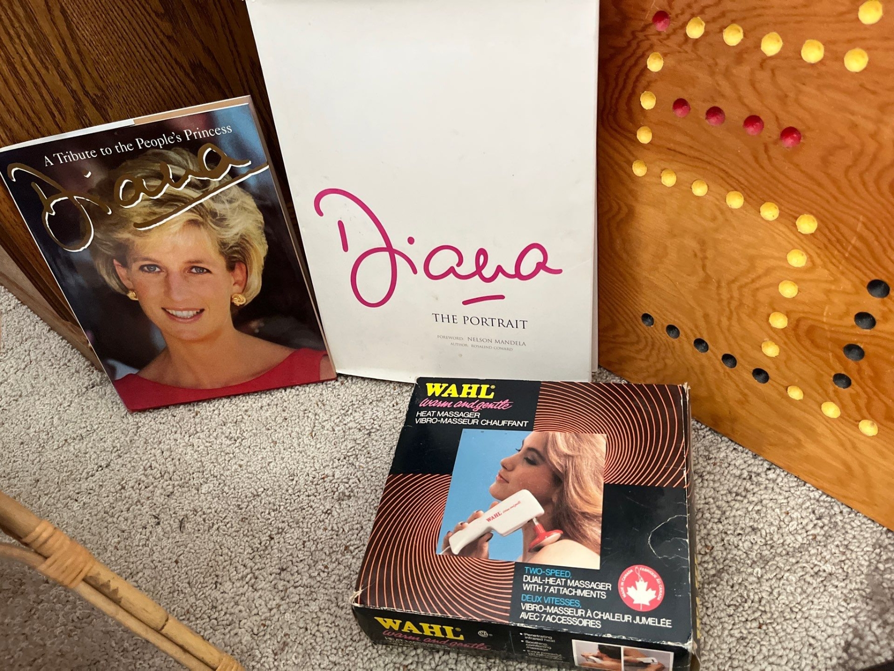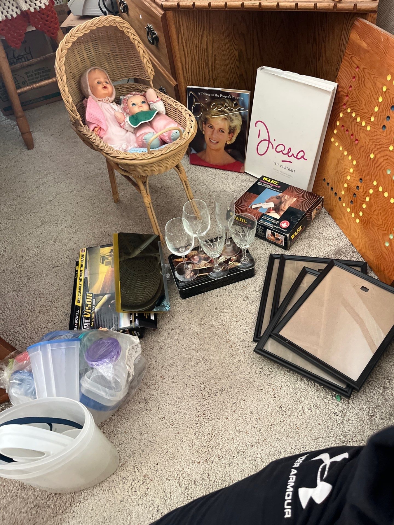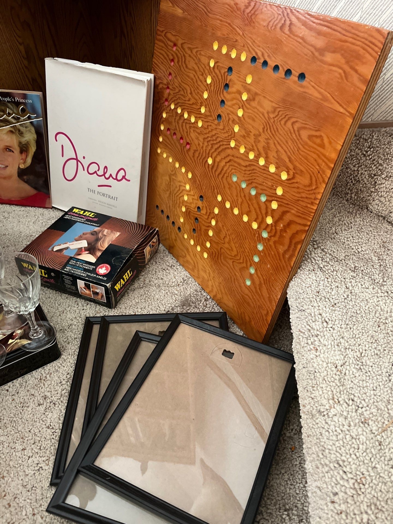 two vintage blankets with wicker cradle books whale vintage massager visor for day night car vision Tupperware/Rubbermaid wine, glasses and picture frames