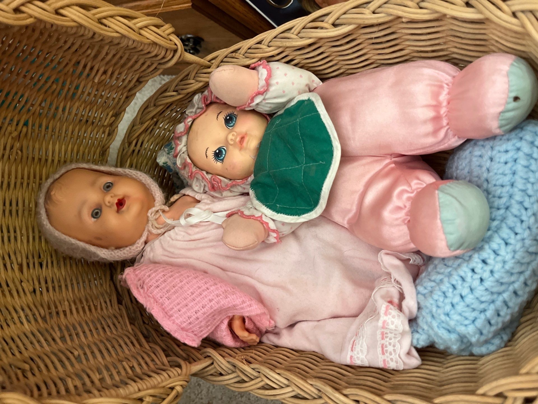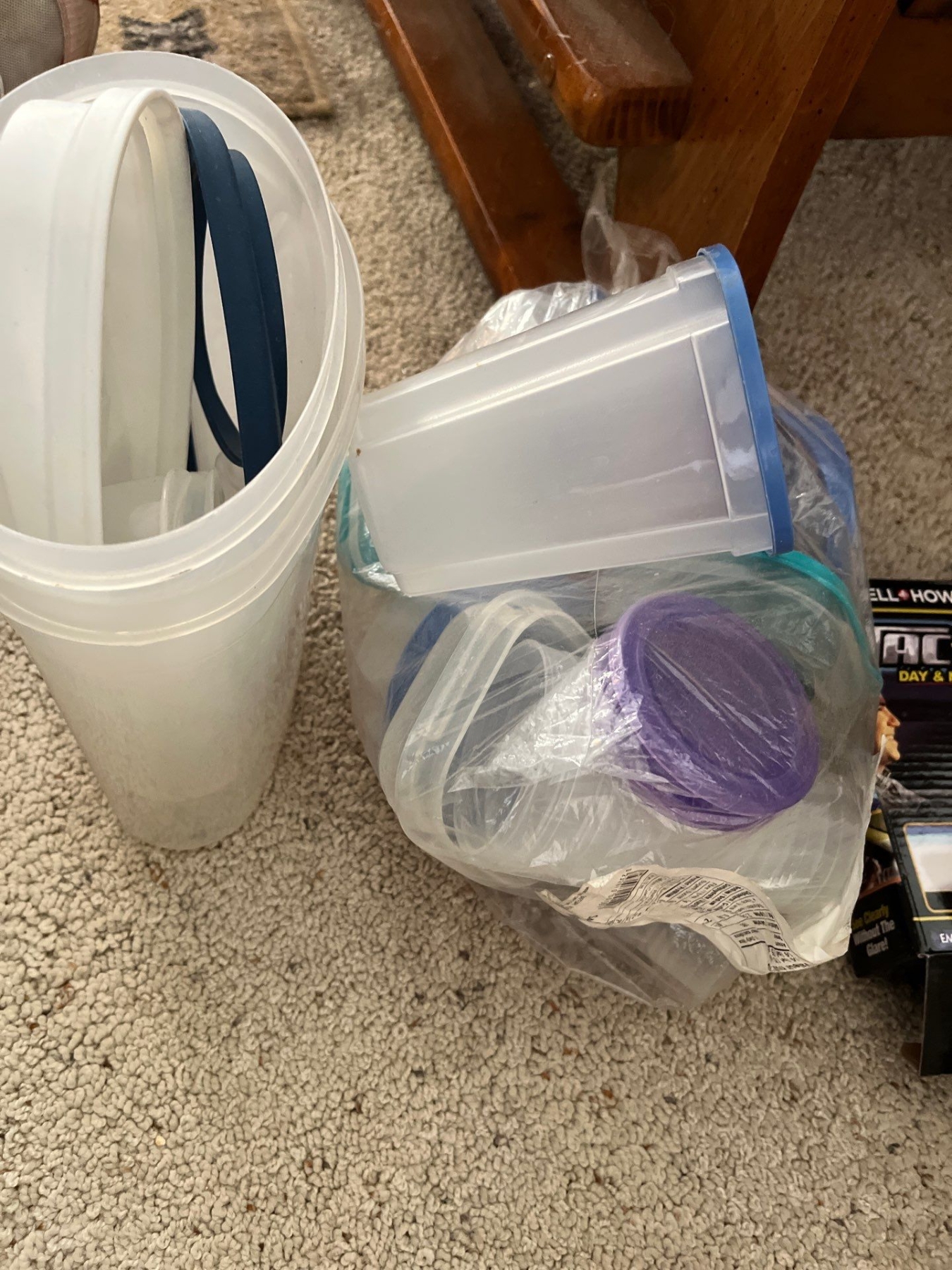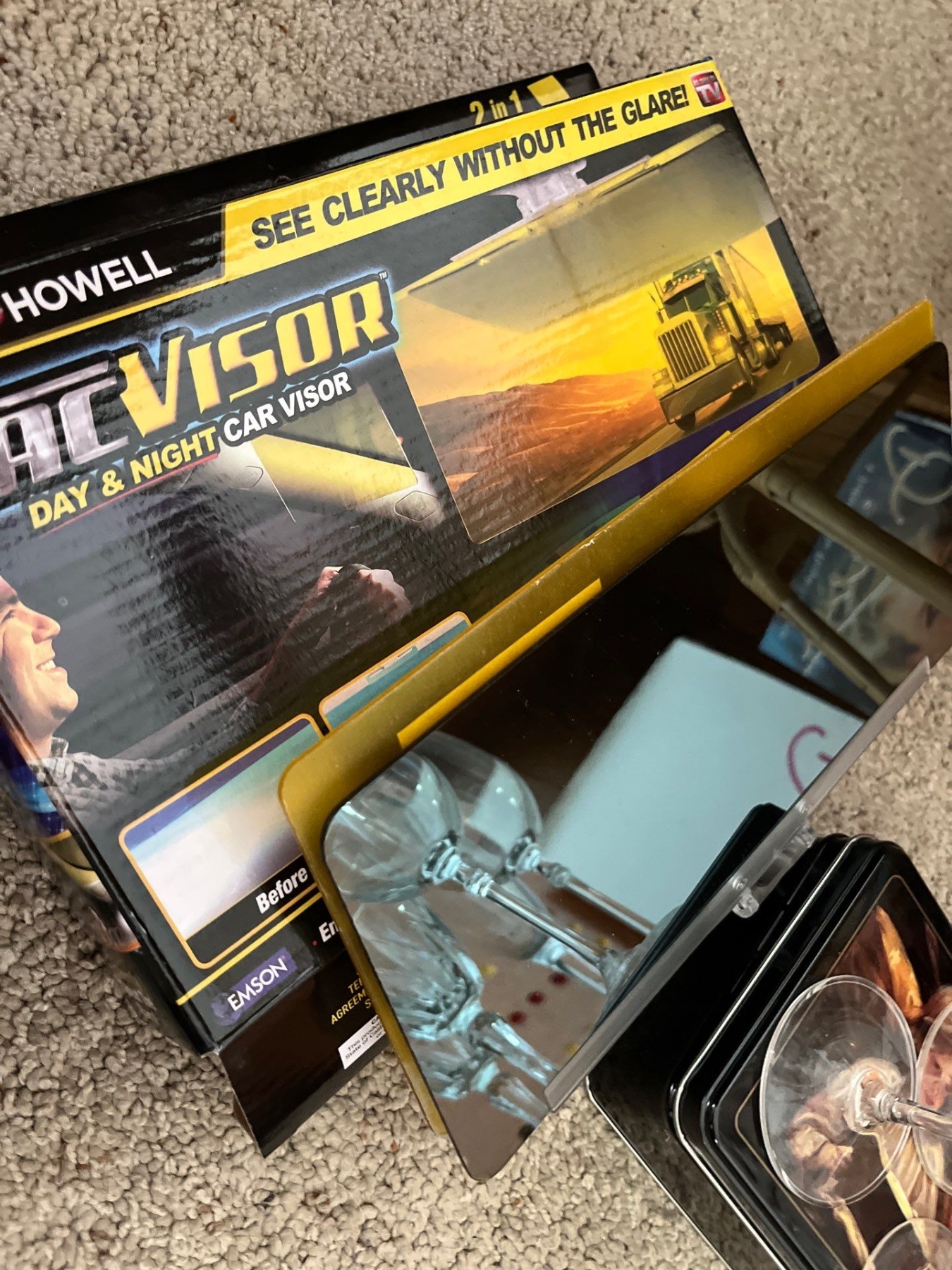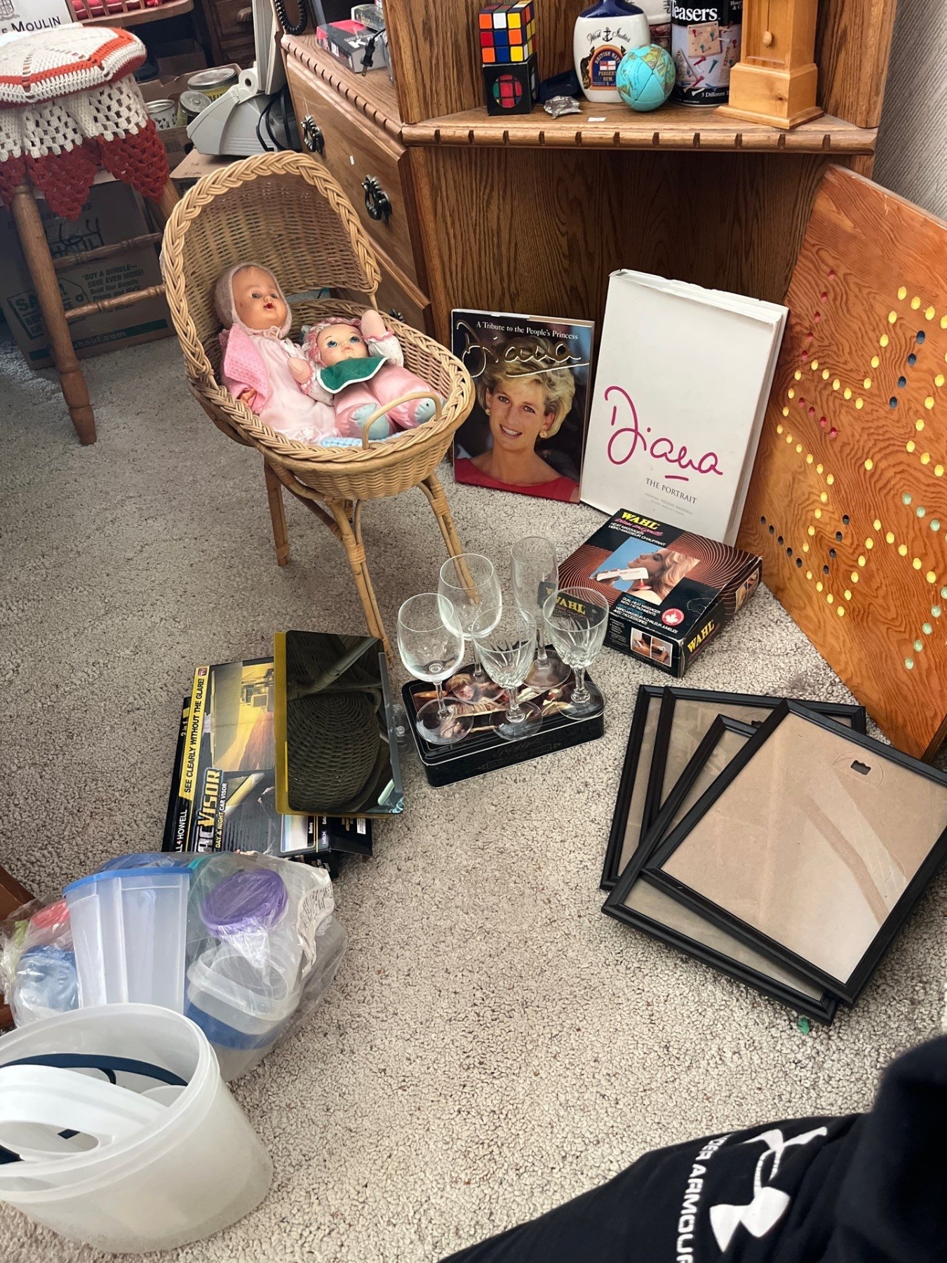 two vintage blankets with wicker cradle books whale vintage massager visor for day night car vision Tupperware/Rubbermaid wine, glasses and picture frames