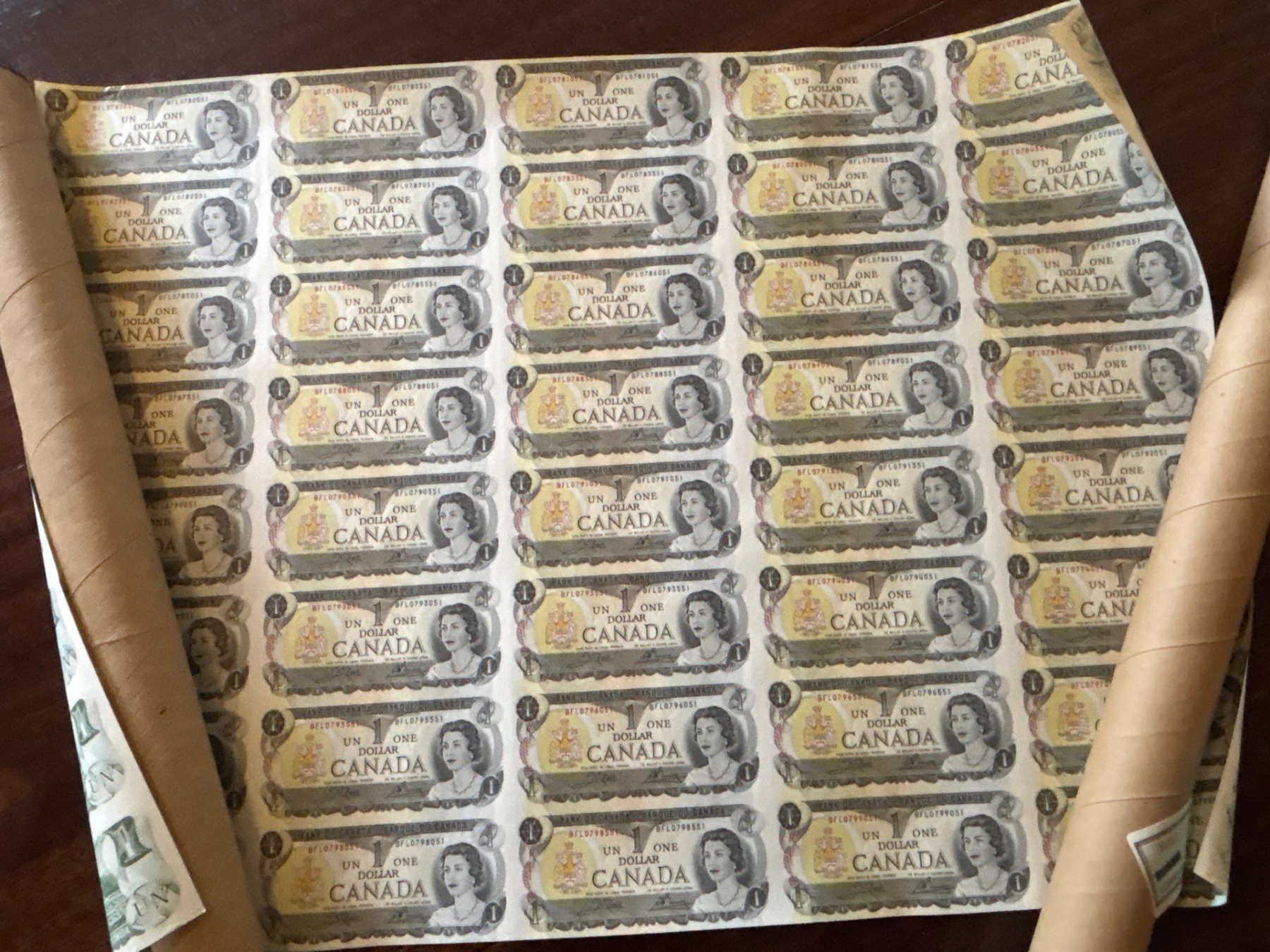 uncut sheet of Canadian 1$ notes Great For any Collection