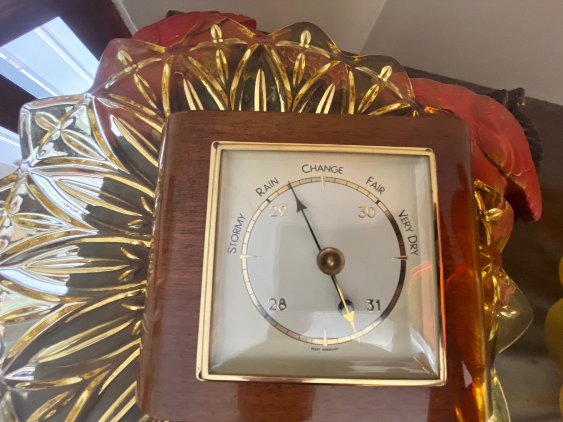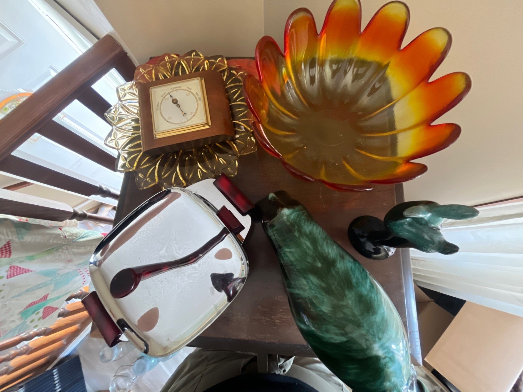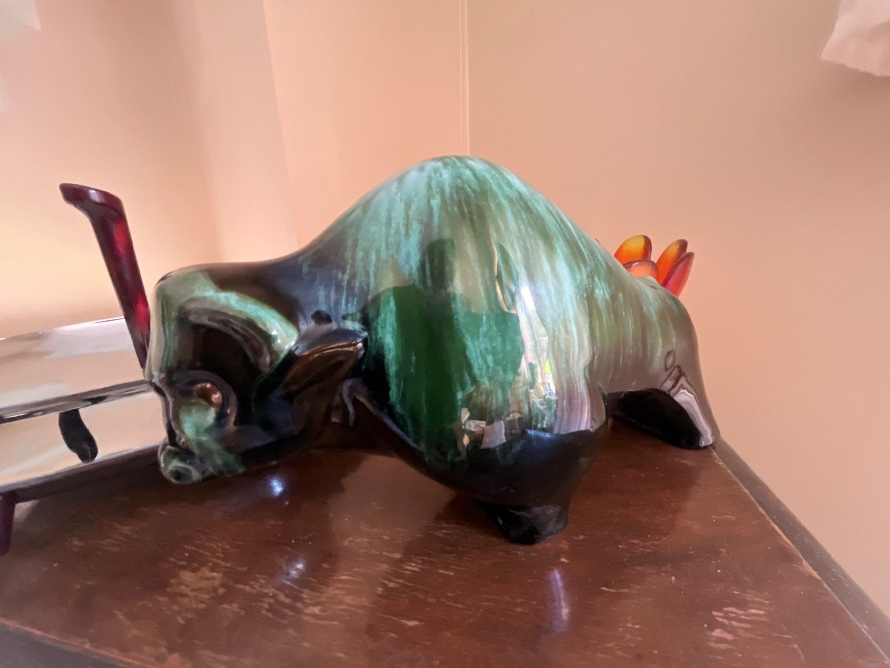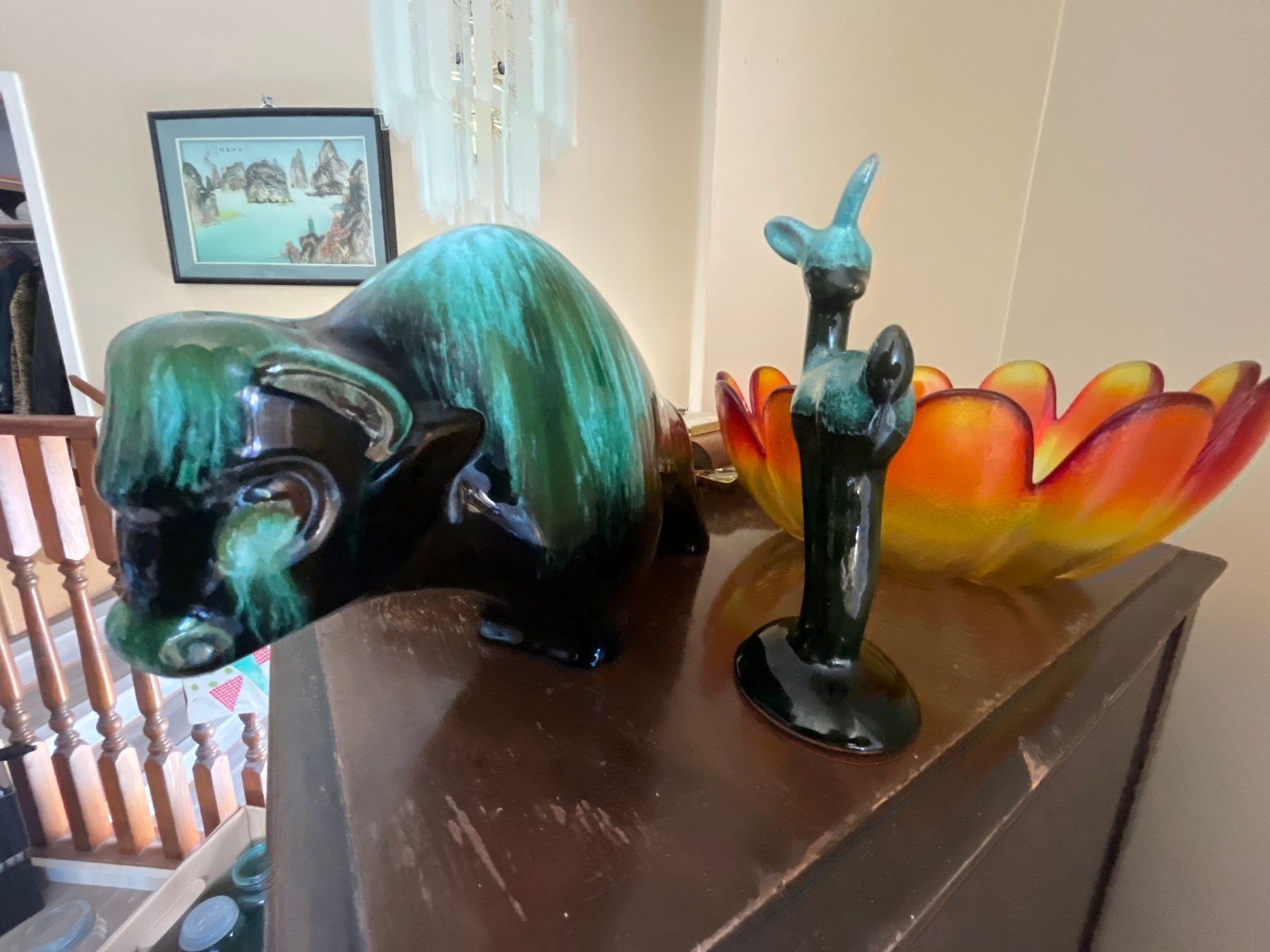 vintage Blue Mountain Pottery bison or buffalo figurine with carnival glass, serving dish, retro, serving trays and blue Mountain deer
