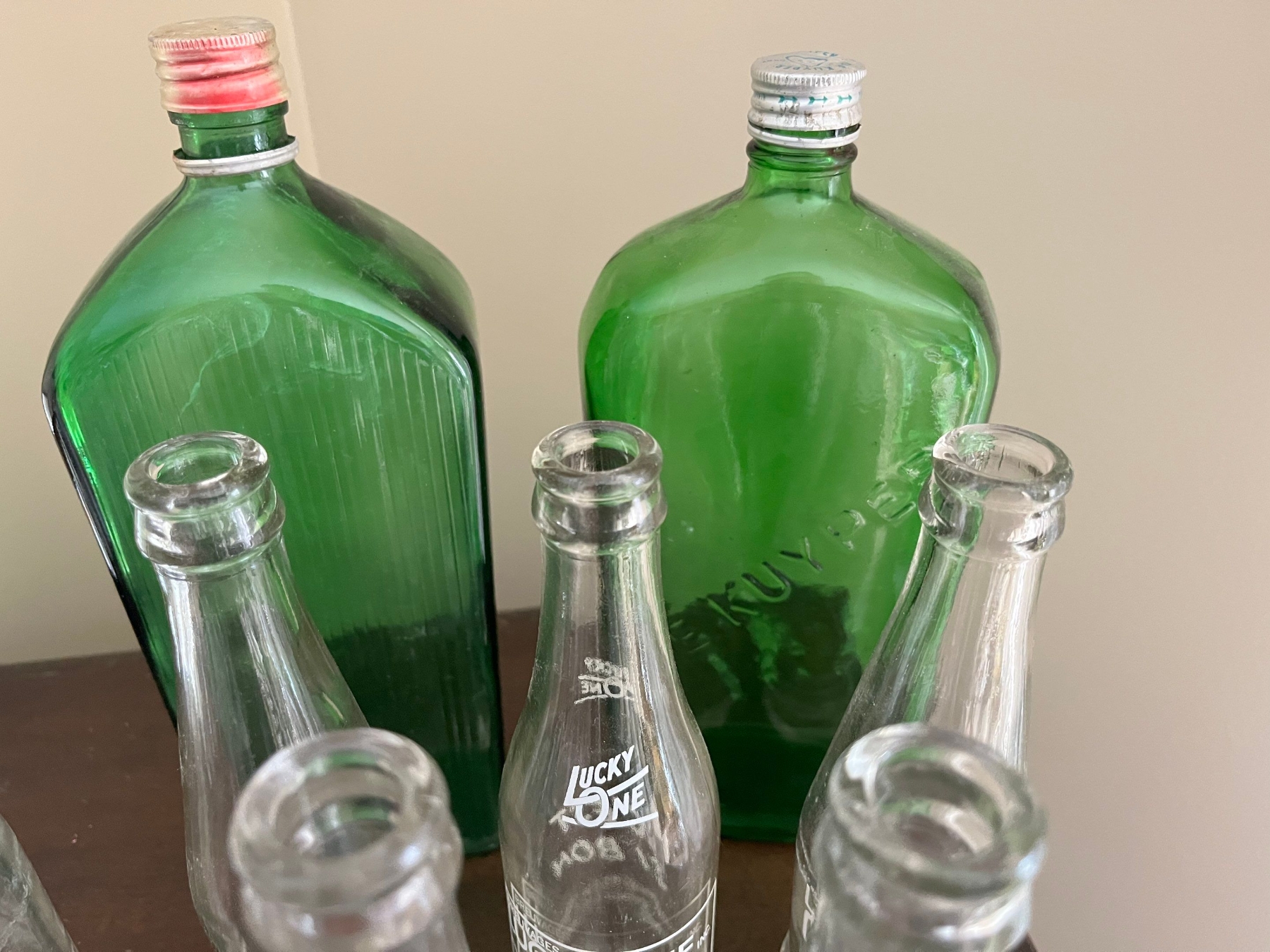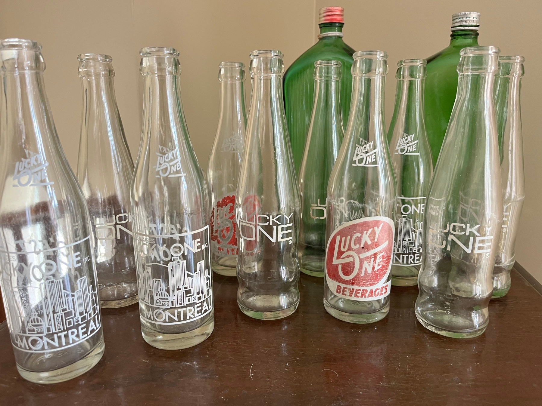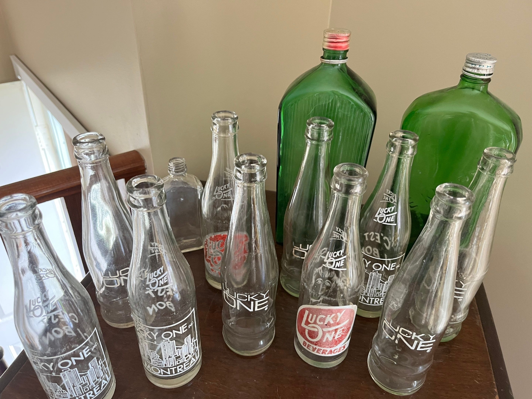 vintage Lucky One beverage bottles, likely from the 1970s10 in total usually $15 each 2 vintage gin bottles, and one small vintage medicine bottle