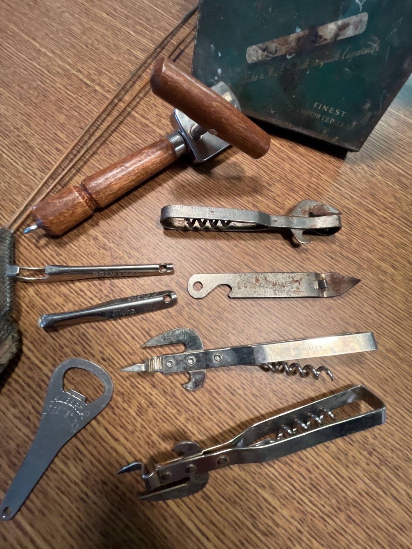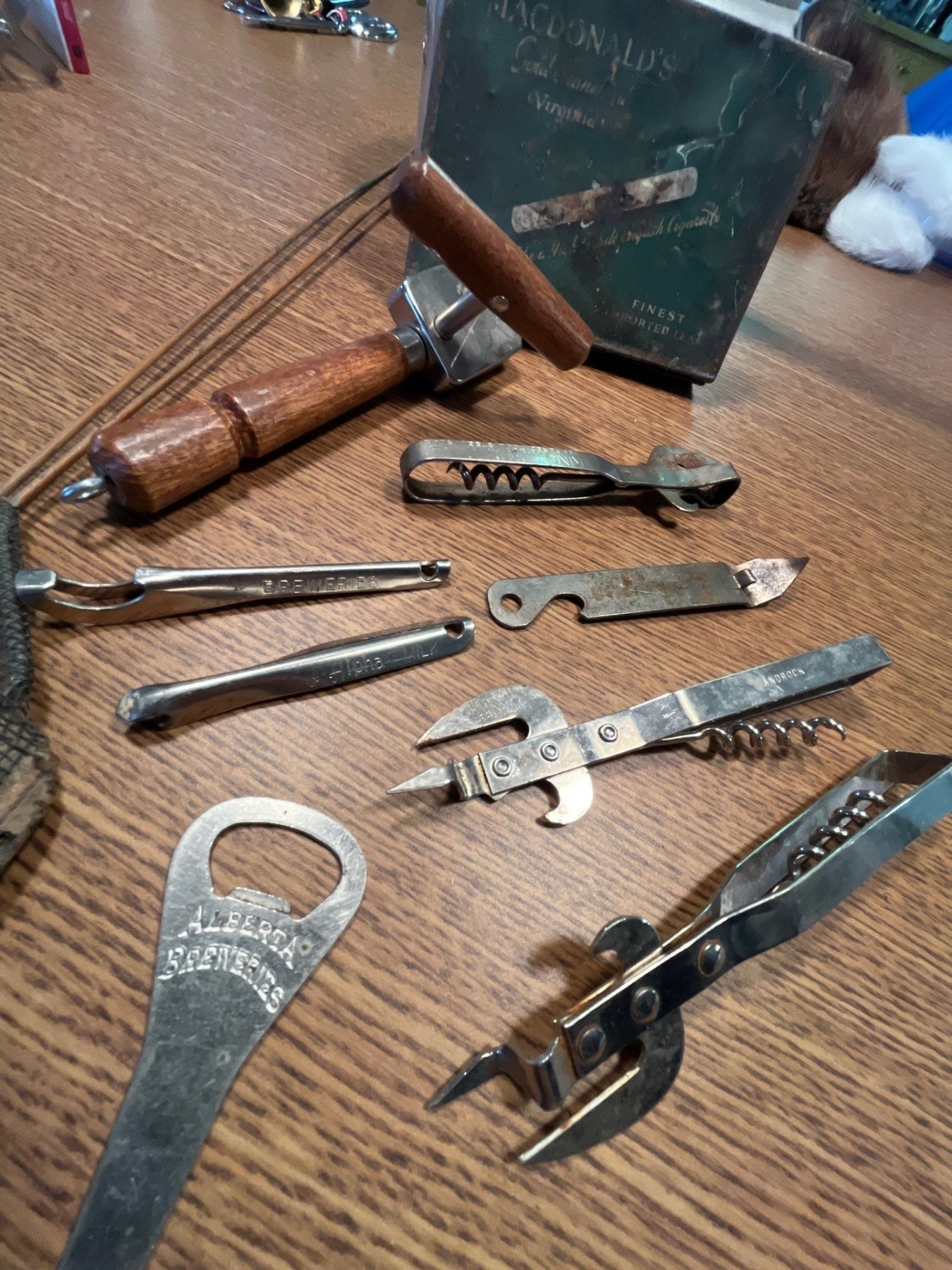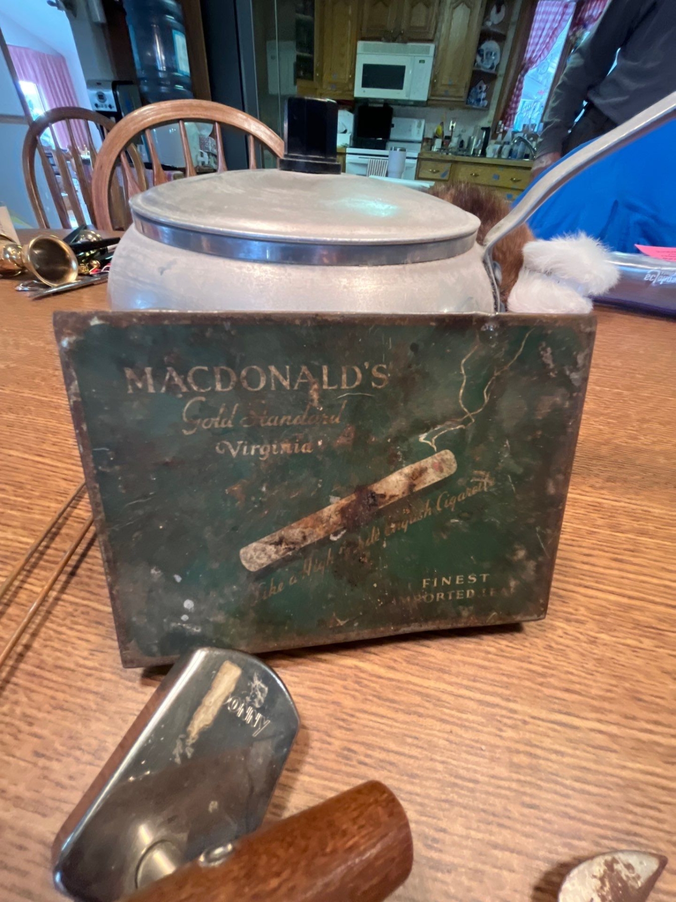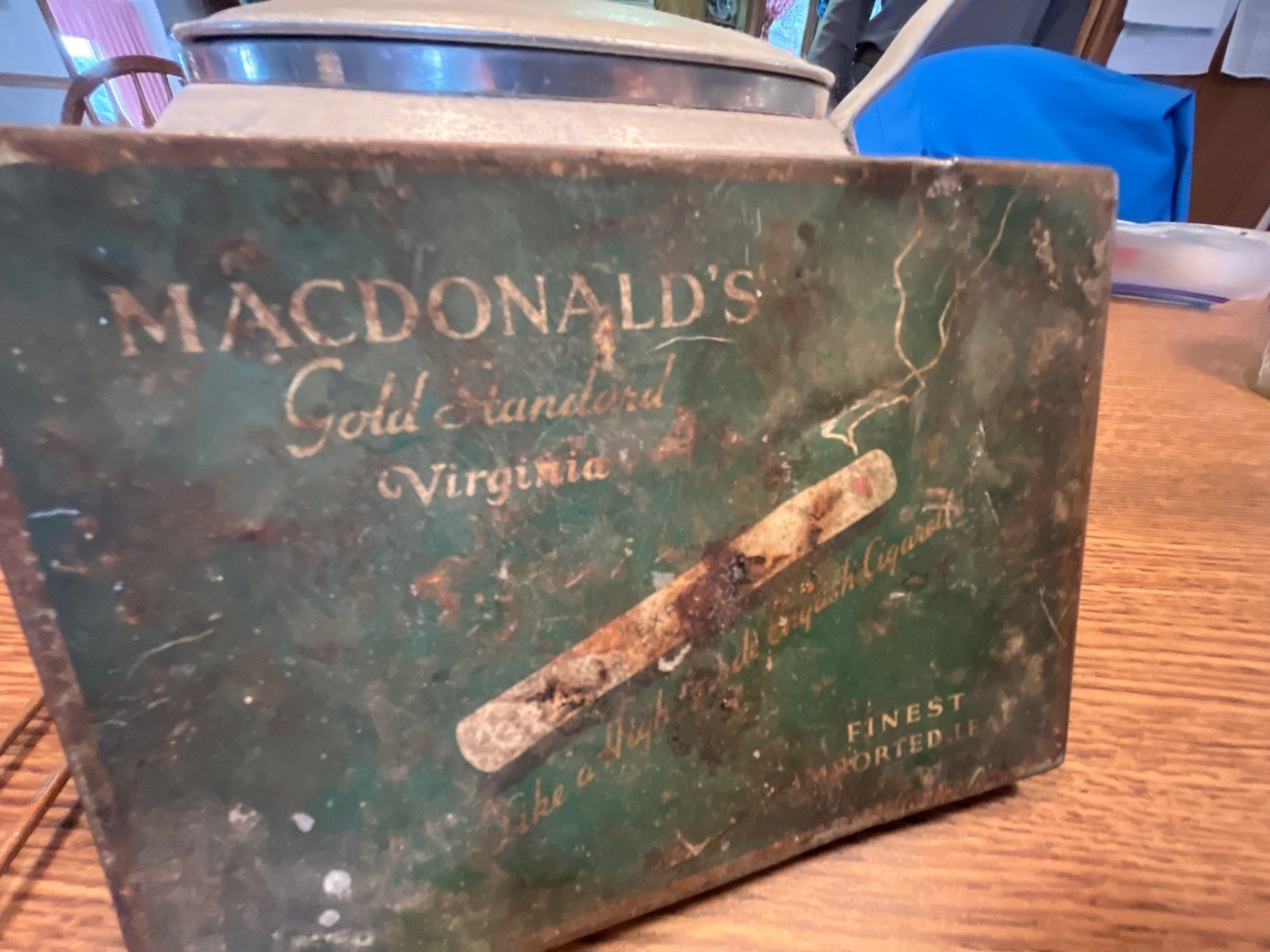vintage MacDonald’s, finest imported, cigarette container, several vintage bottle openers and a ant