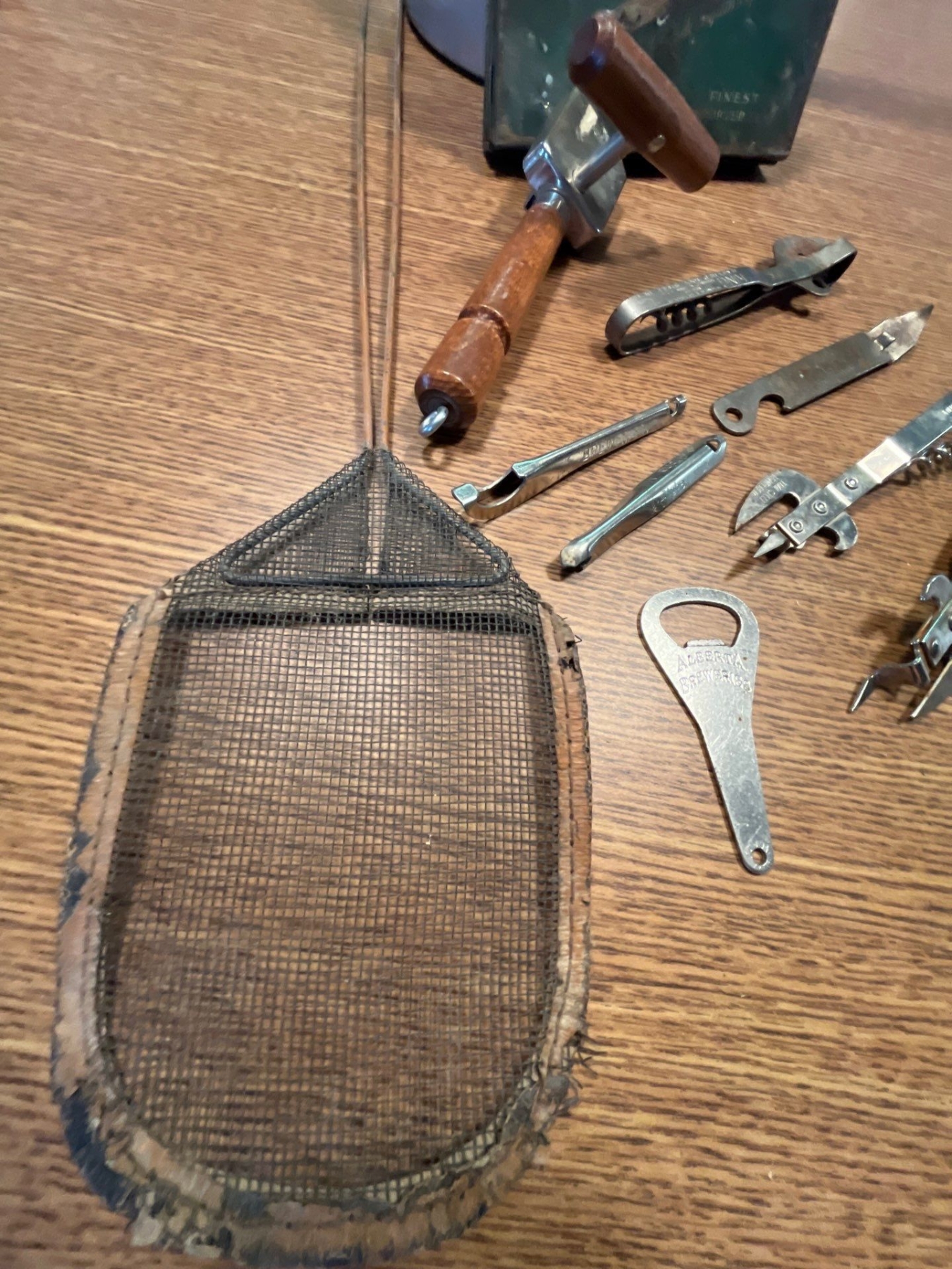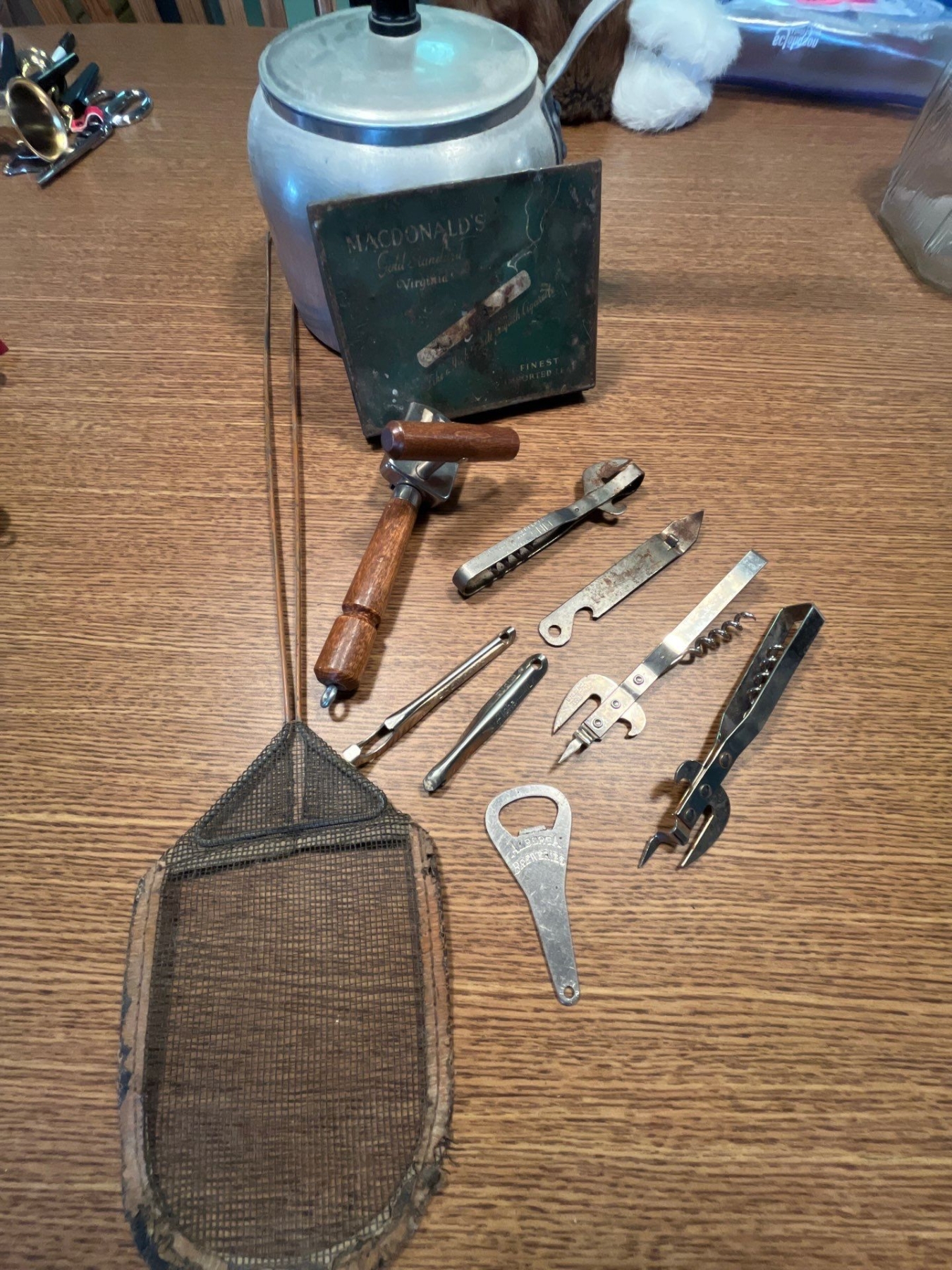 vintage MacDonald’s, finest imported, cigarette container, several vintage bottle openers and a antique flyswatter