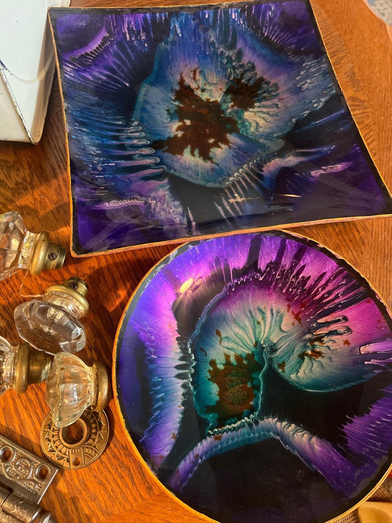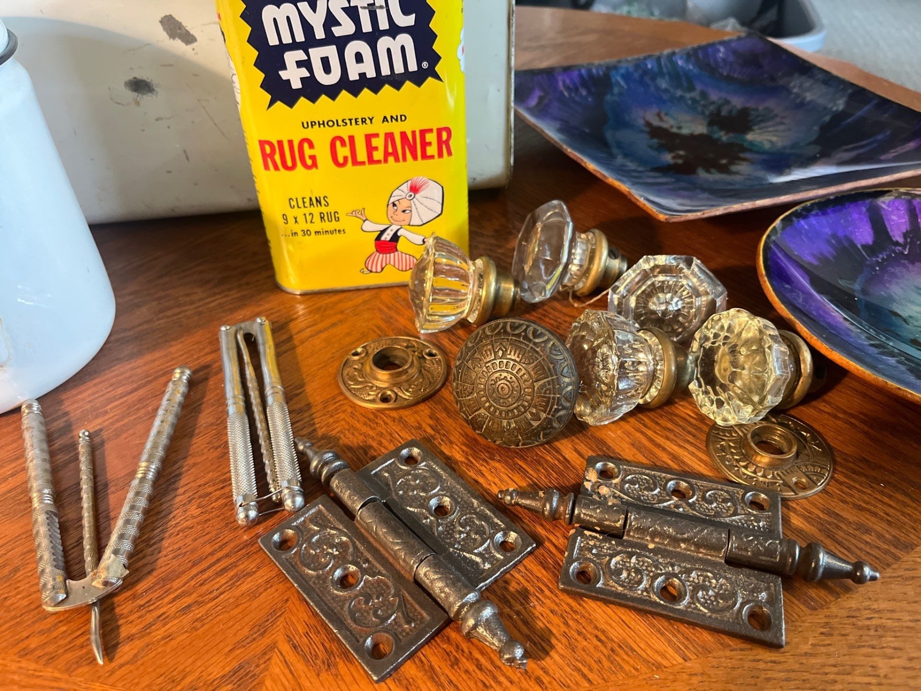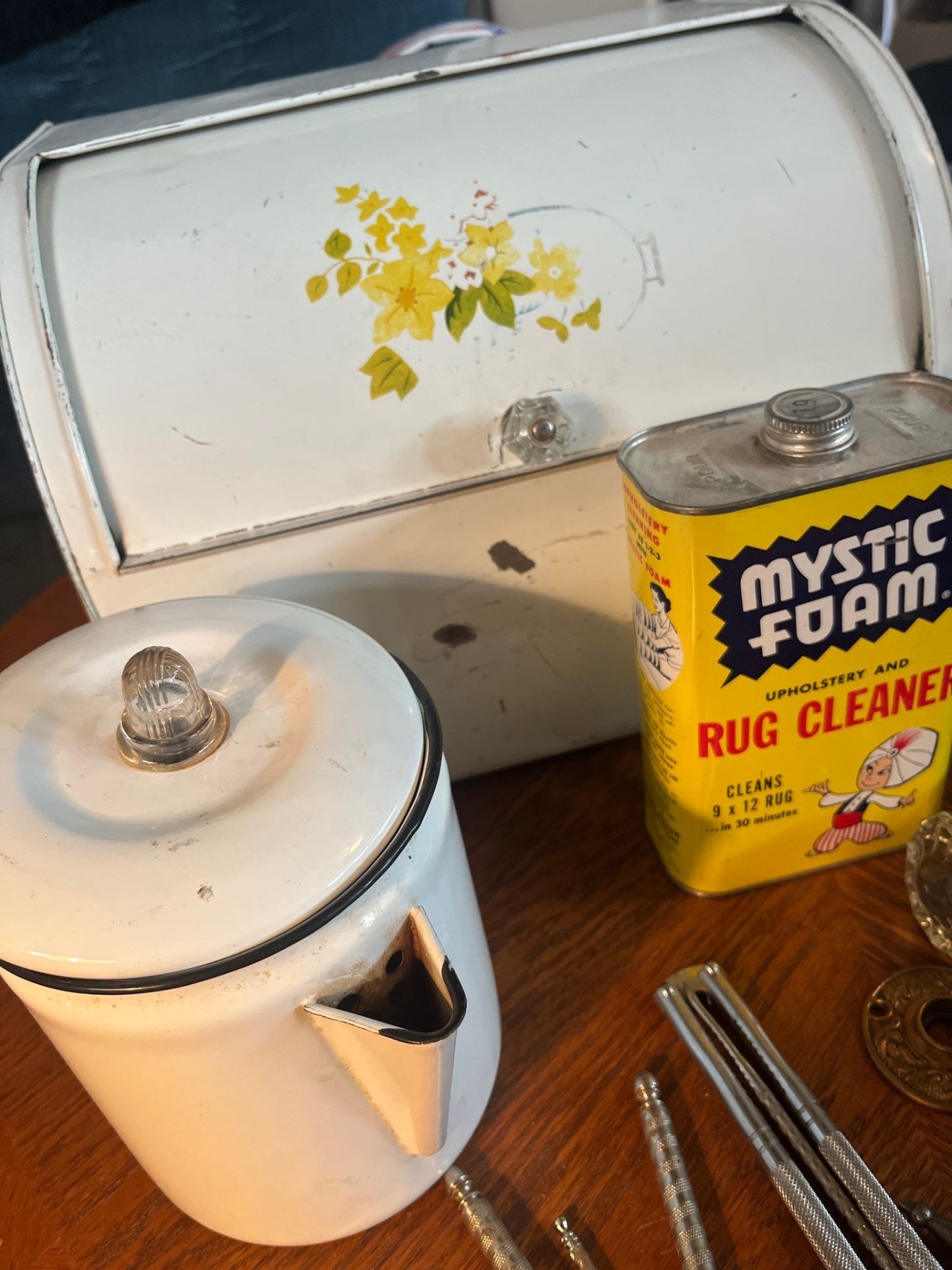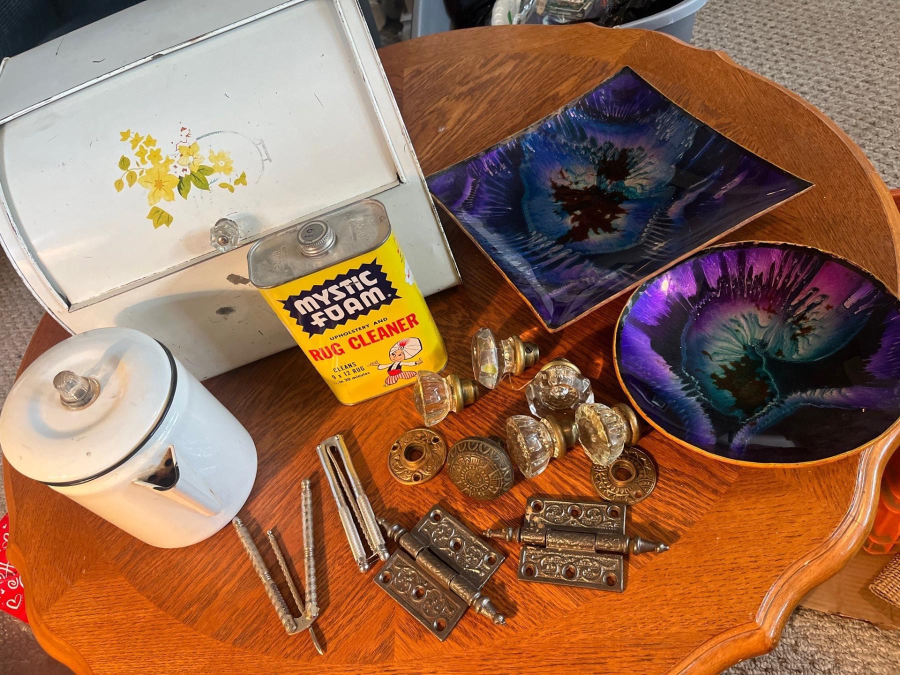 vintage art, deco square plate and round with poor art on it bread bin, vintage tea, pot door, knobs, and handles with door, hardware and collector tin