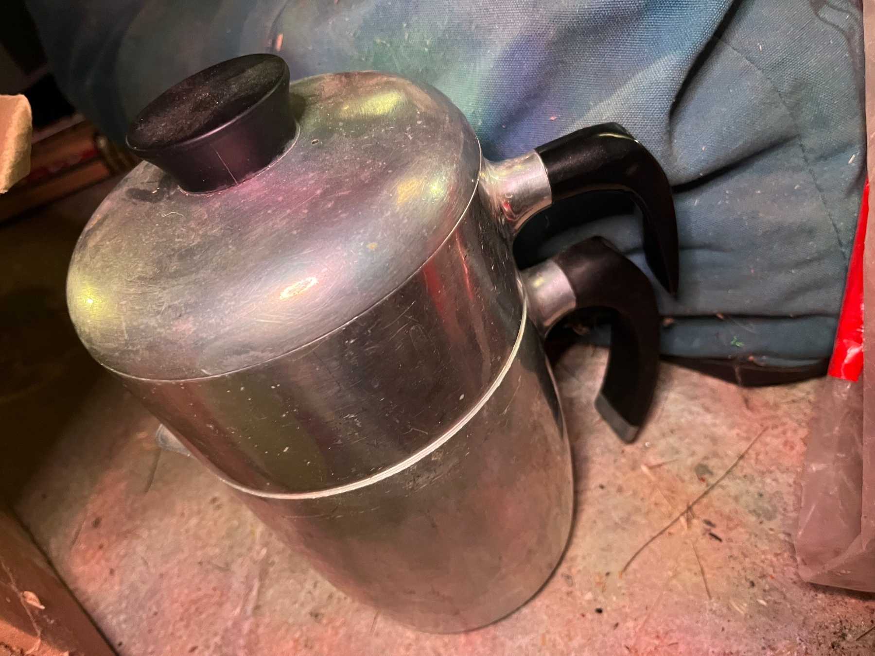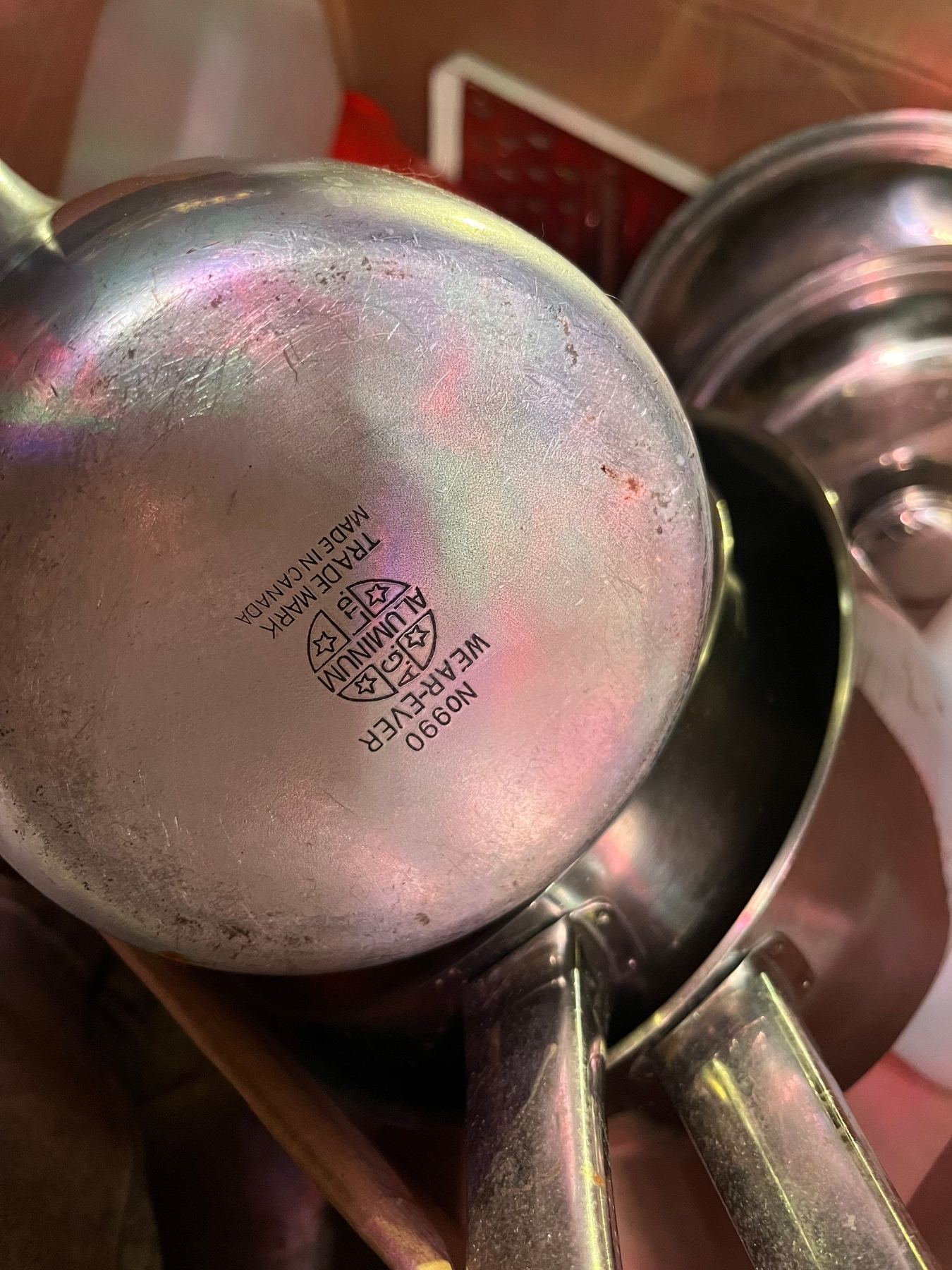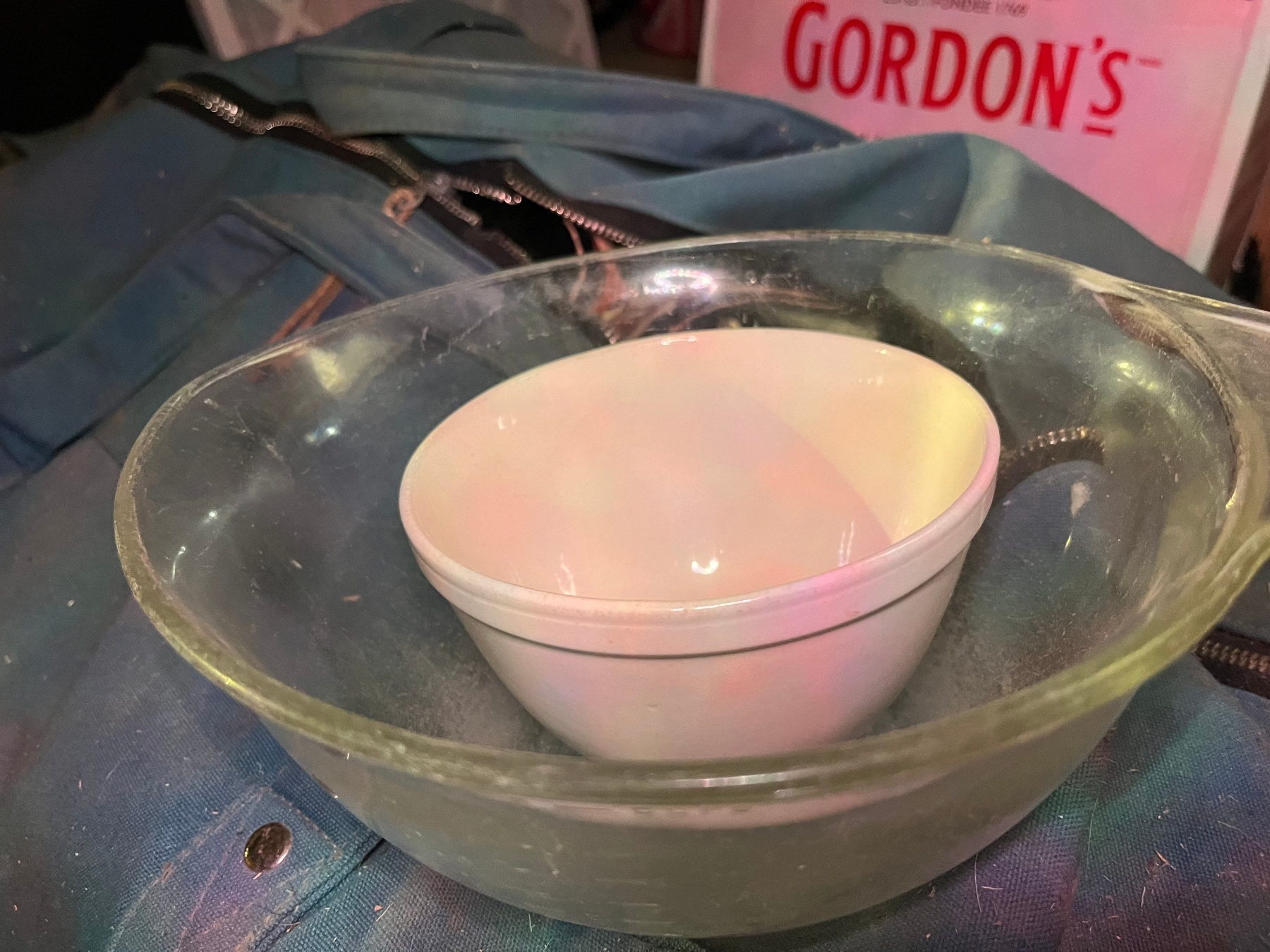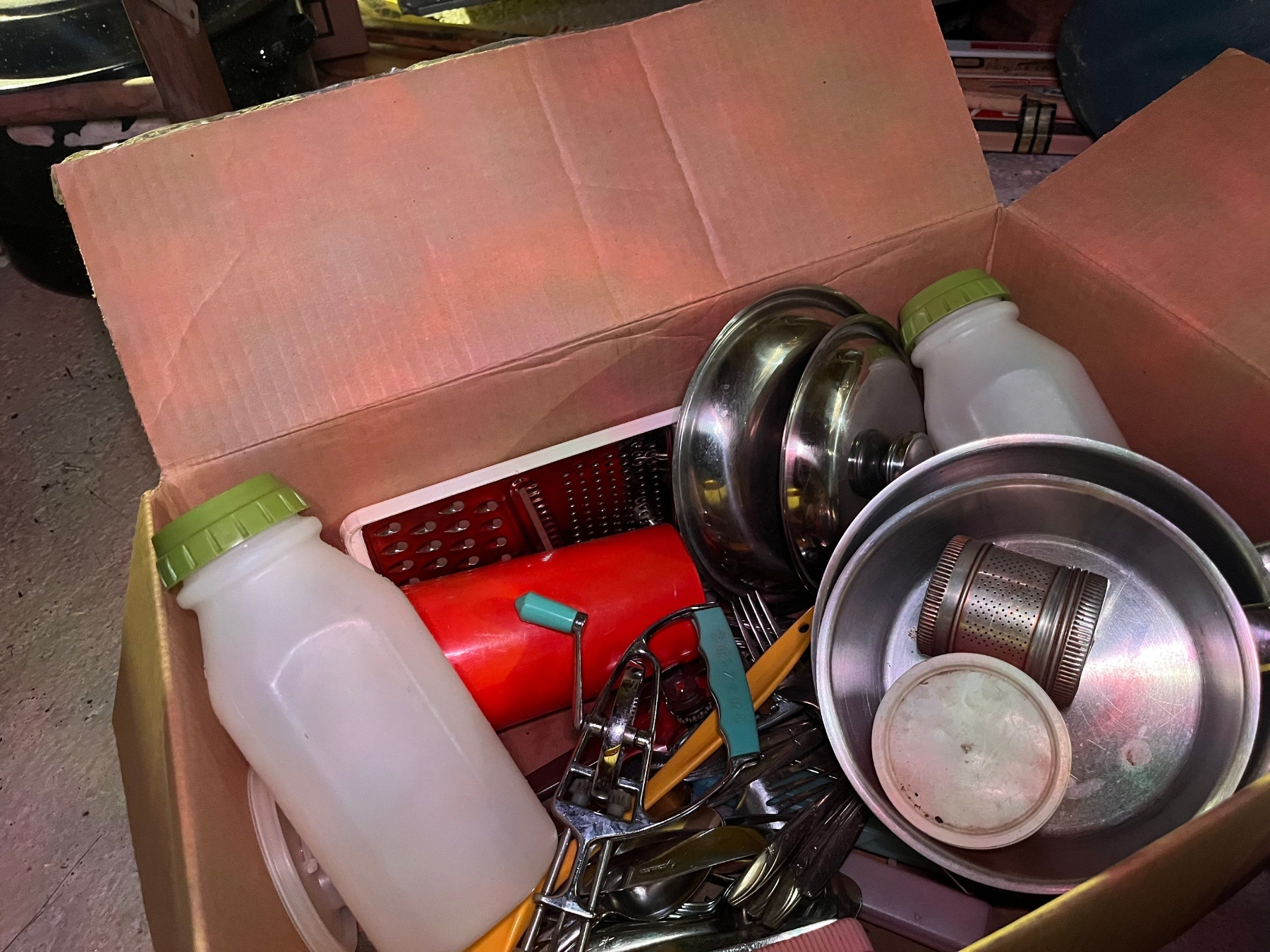 vintage dishes, real Tupperware bins pots wherever coffee pot along with cutlery a Pyrex glass mixing bowl.