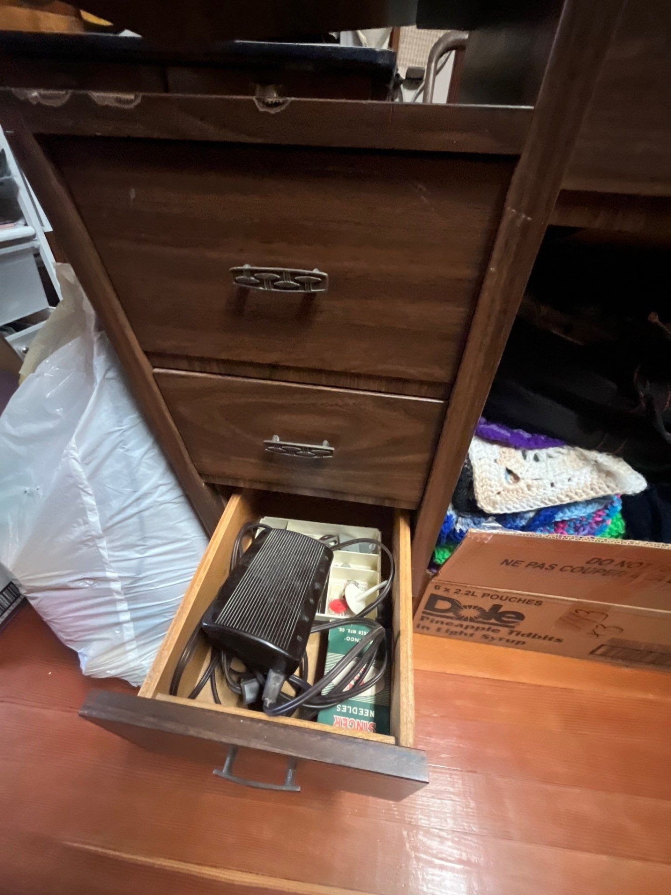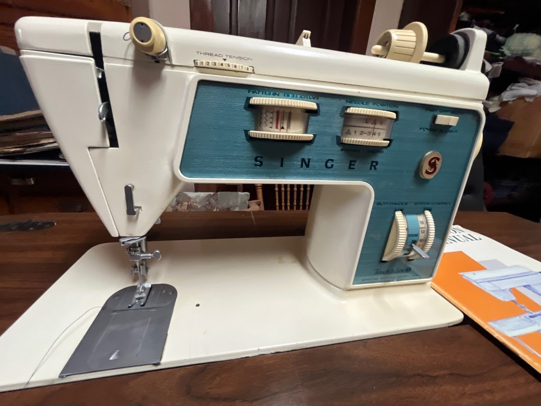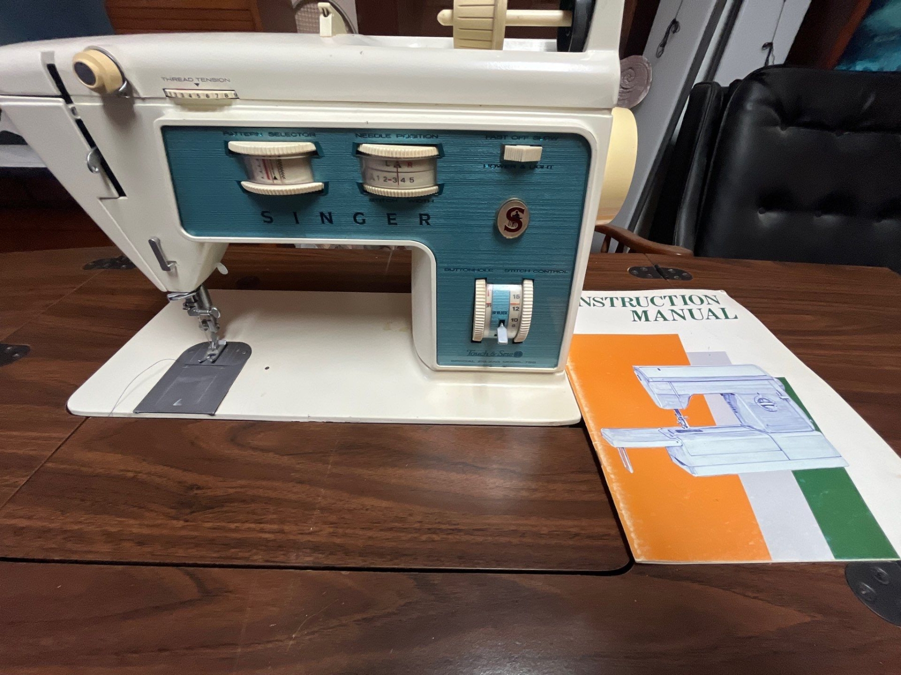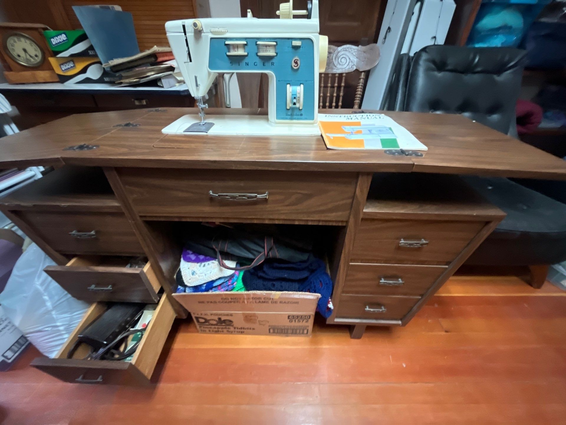 vintage electric, singer, sewing machine with retro sewing machine table with a number of drawers and all attachments and working condition