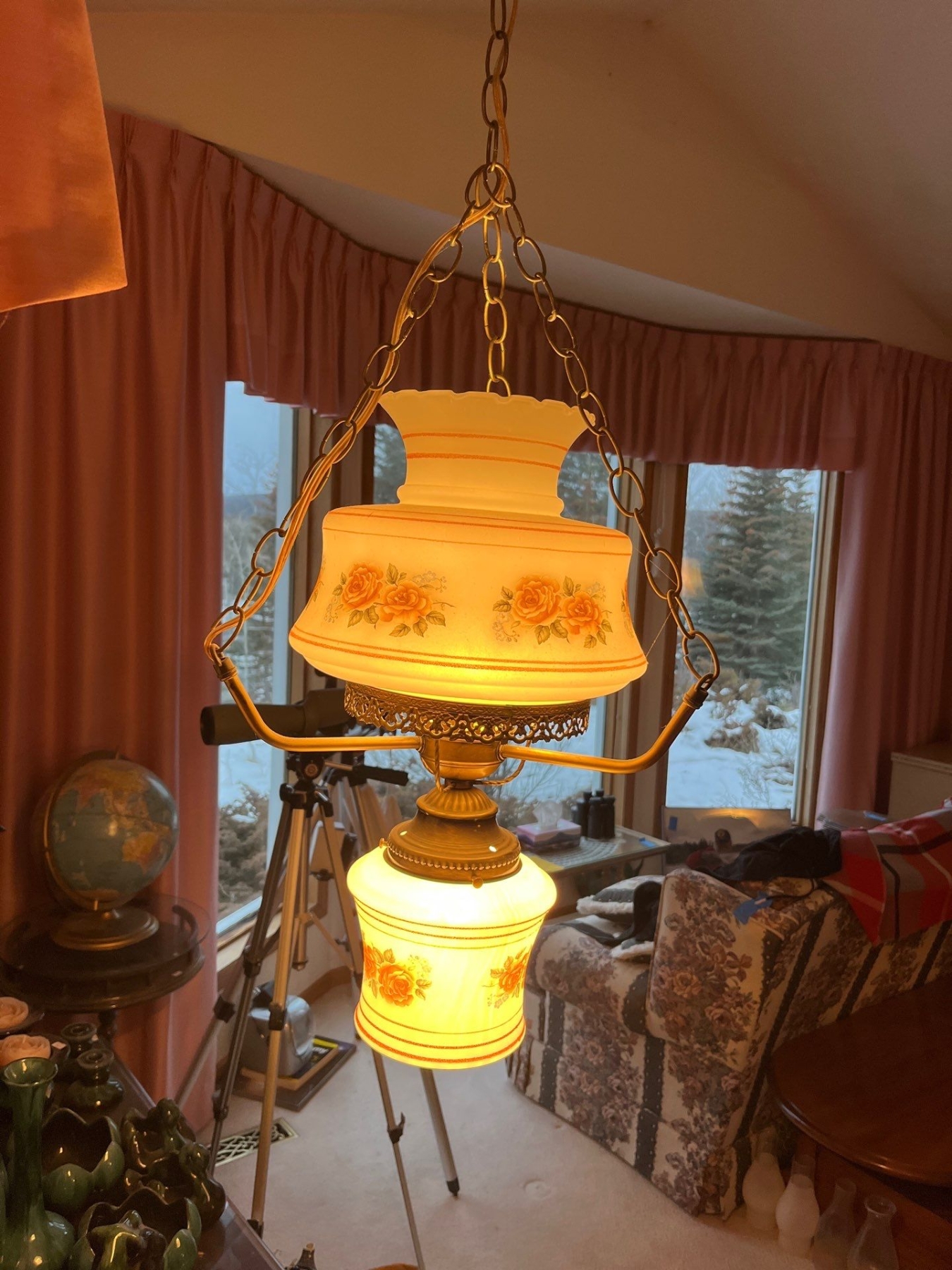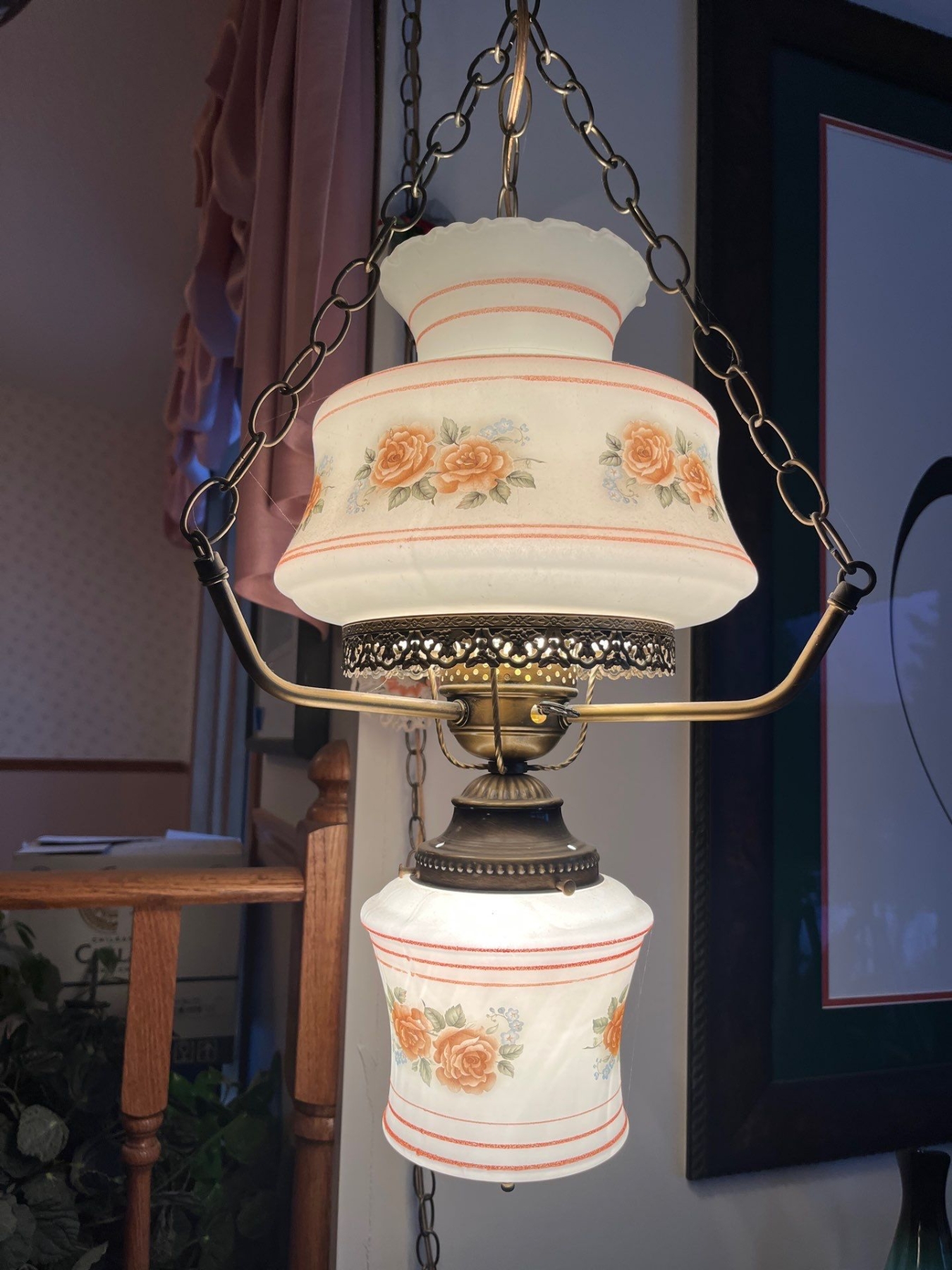 vintage hand-painted hurricane-style hanging lamp with a floral glass globe and brass-toned metal accents. in great condition, all lights work