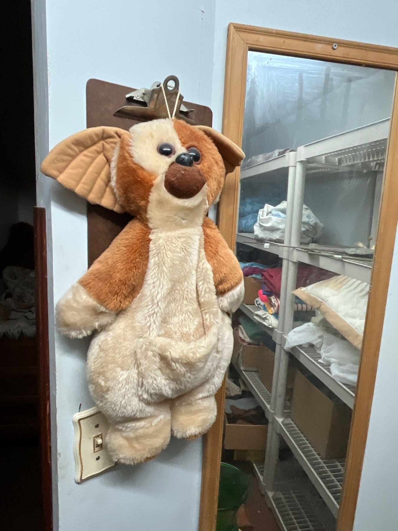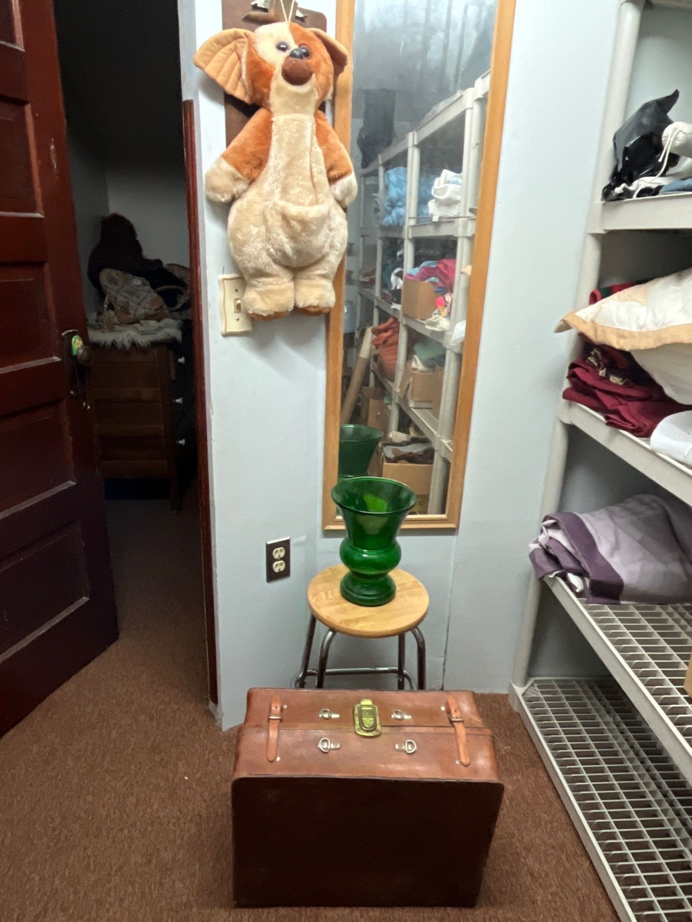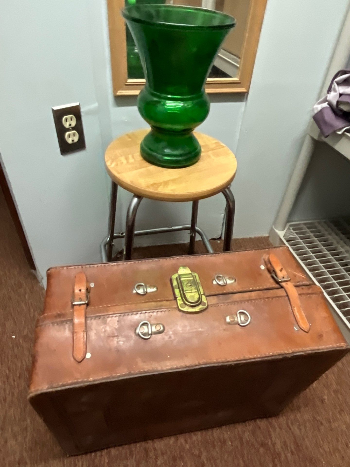 vintage leather briefcase, small stool, green vase, and gizmo stuffy with mirror