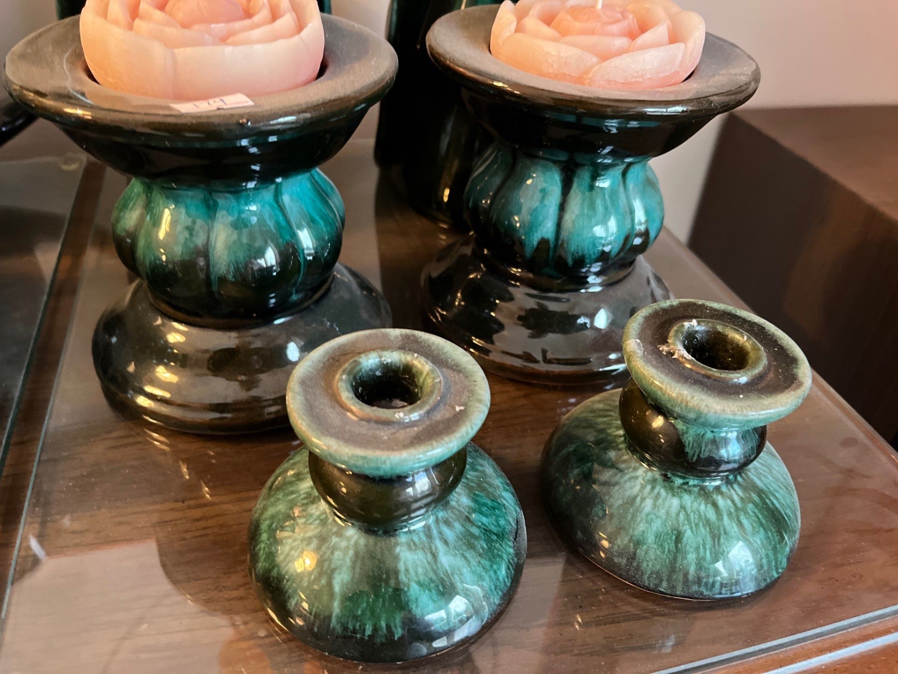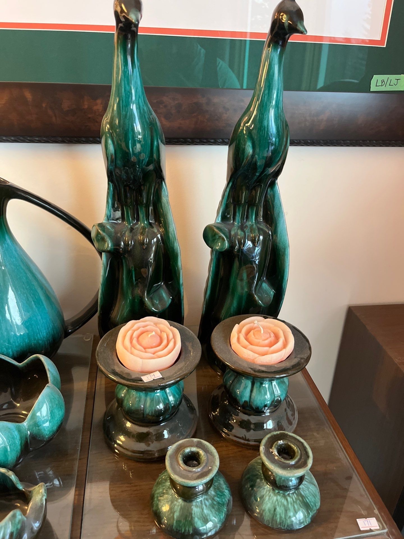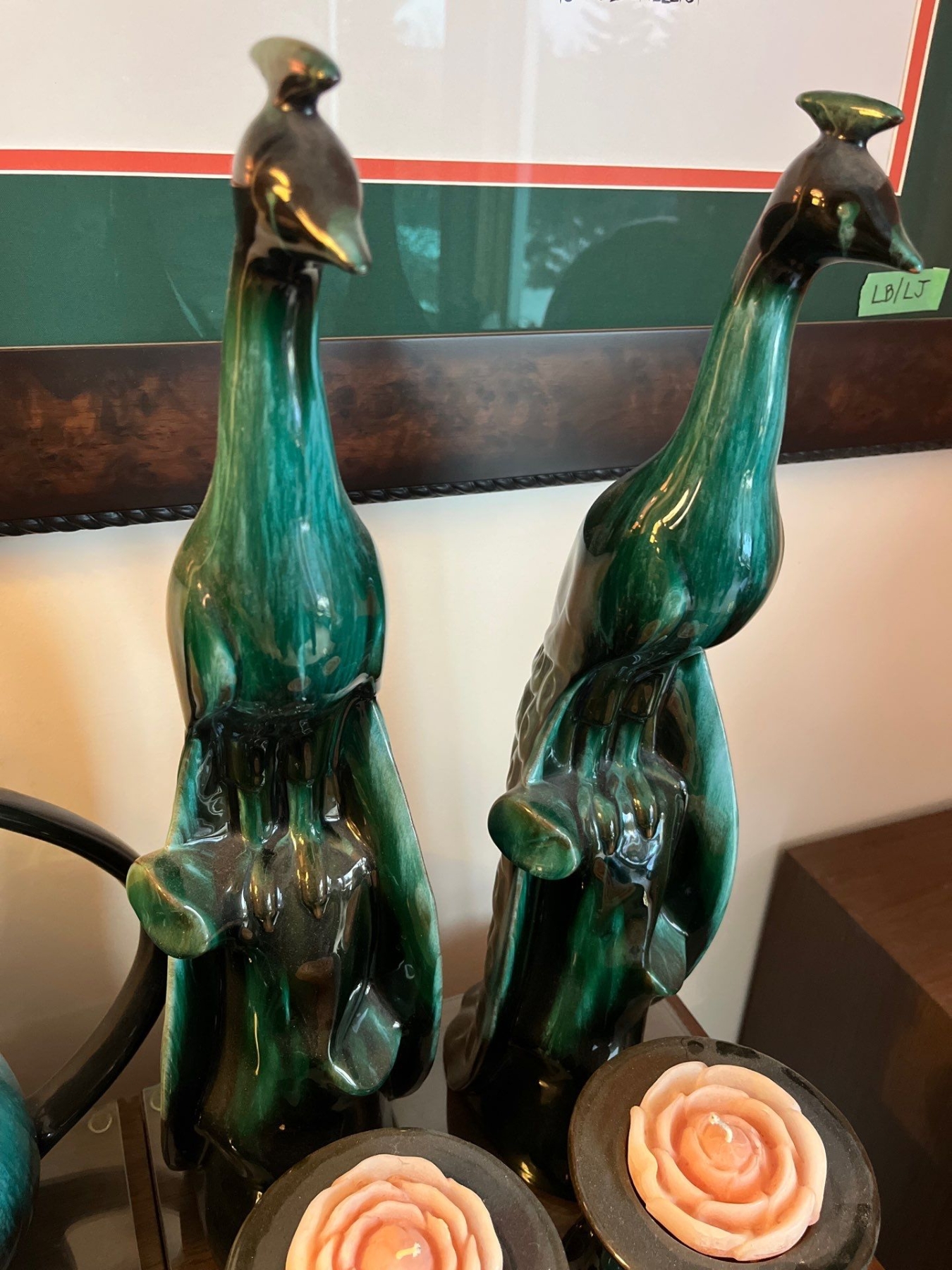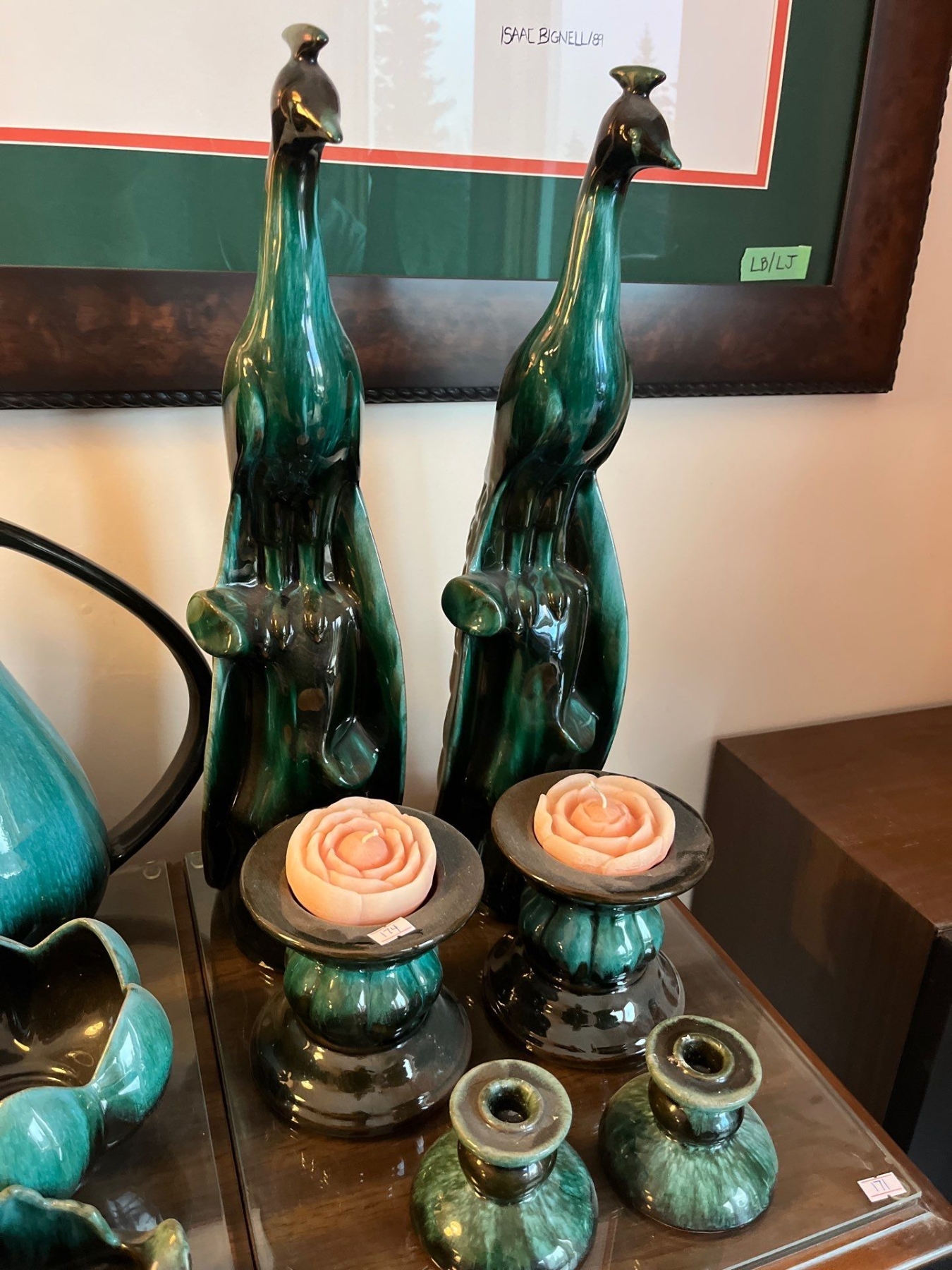 Two large peacocks, two medium size candle holders with rose candles, and two small candle holders