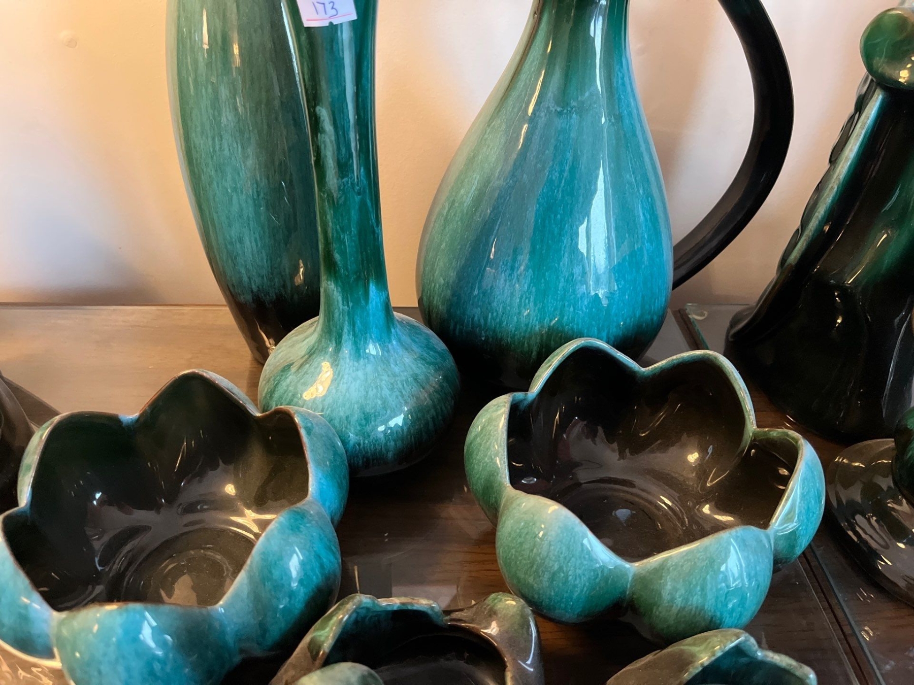 vintage mid-century modern Blue Mountain Pottery two tall water jugs, one vase, two candy dishes, an