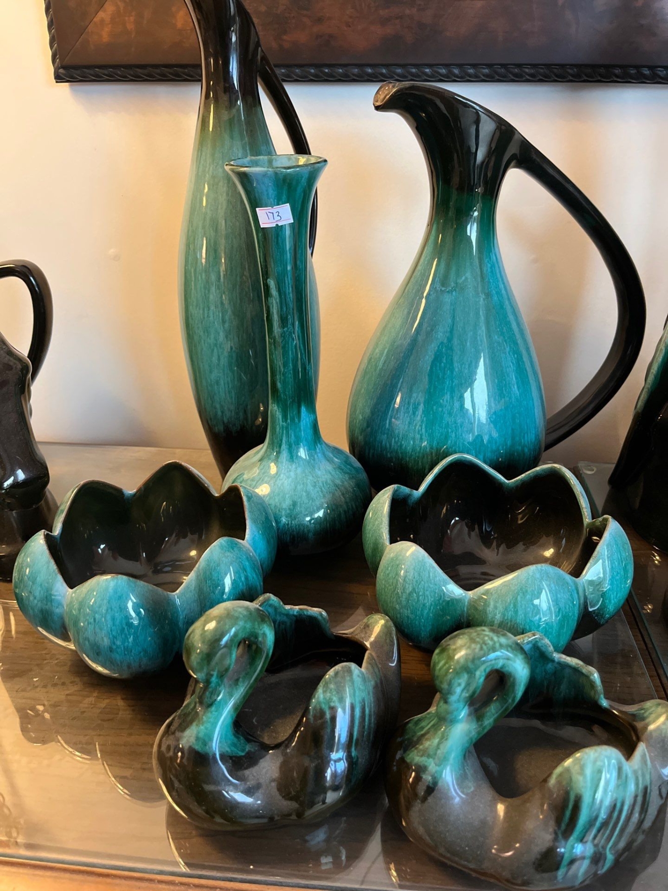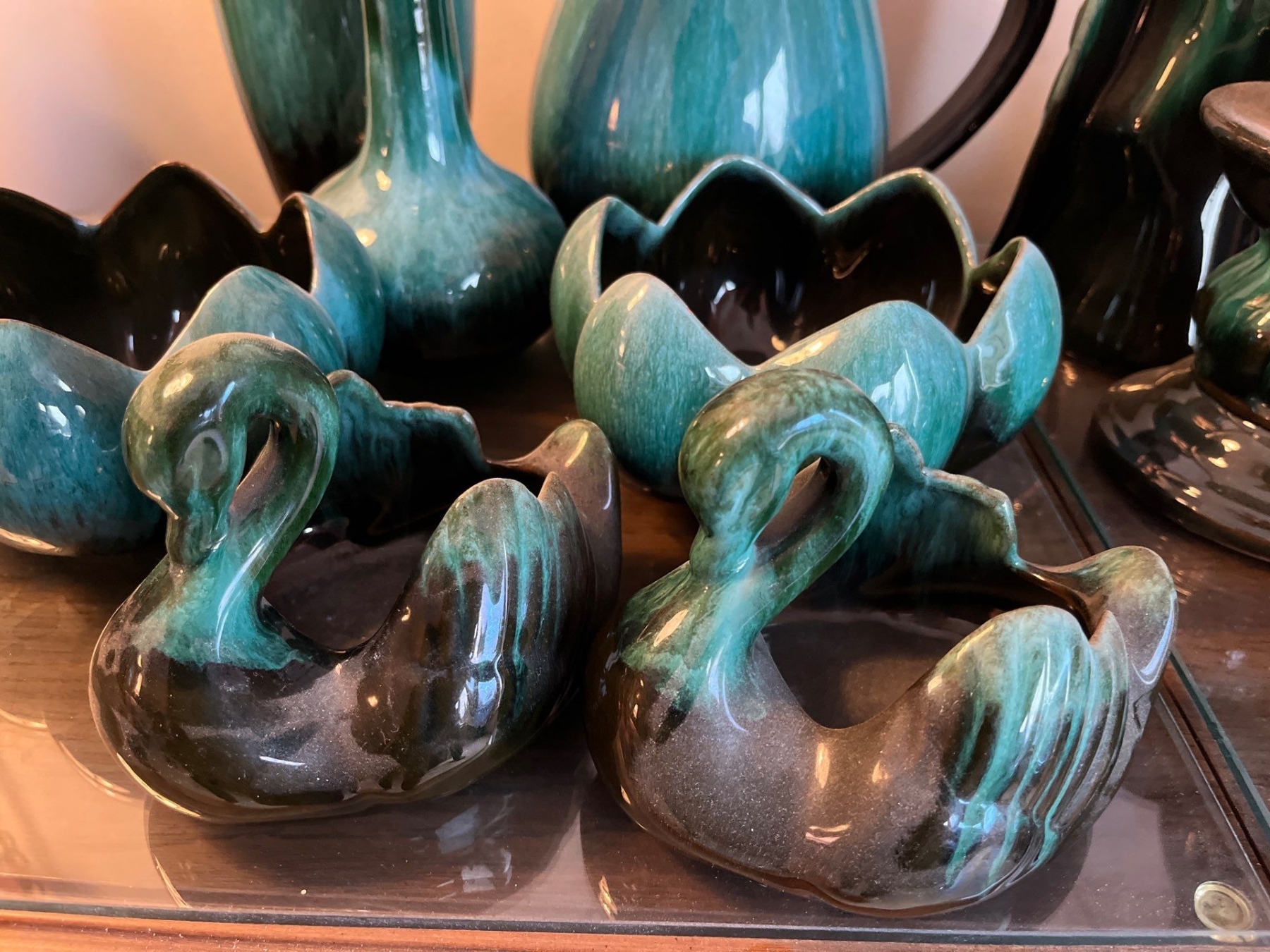 vintage mid-century modern Blue Mountain Pottery two tall water jugs, one vase, two candy dishes, and two small swans