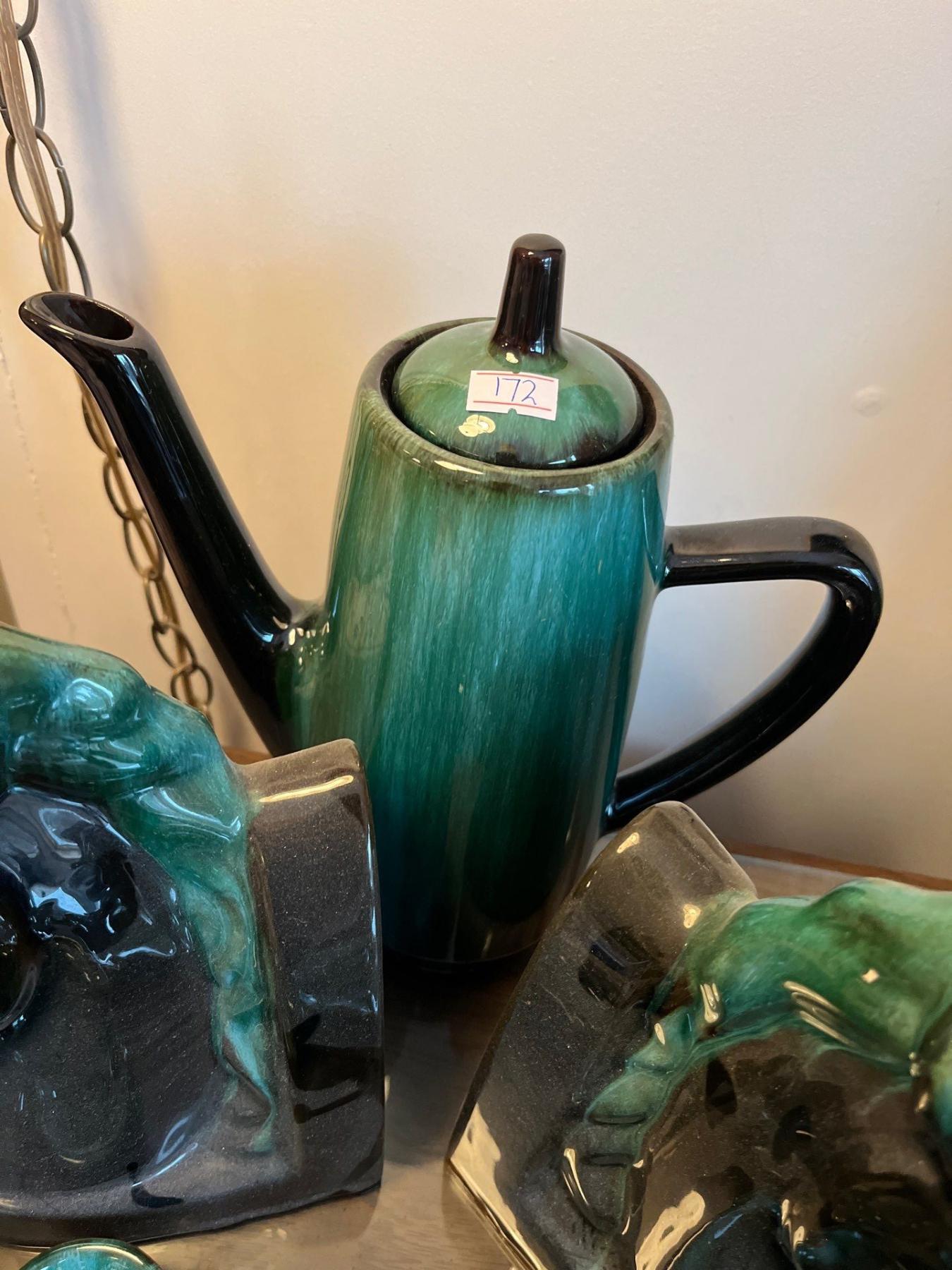 vintage mid-century modern Blue Mountain Pottery with two horse, bookends, teapot, two candy dishes,