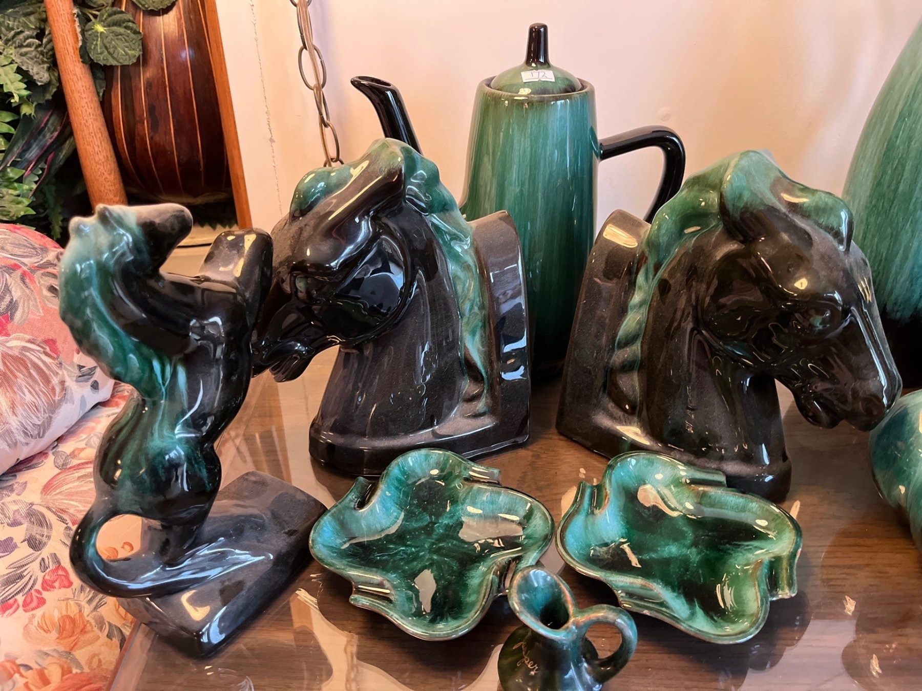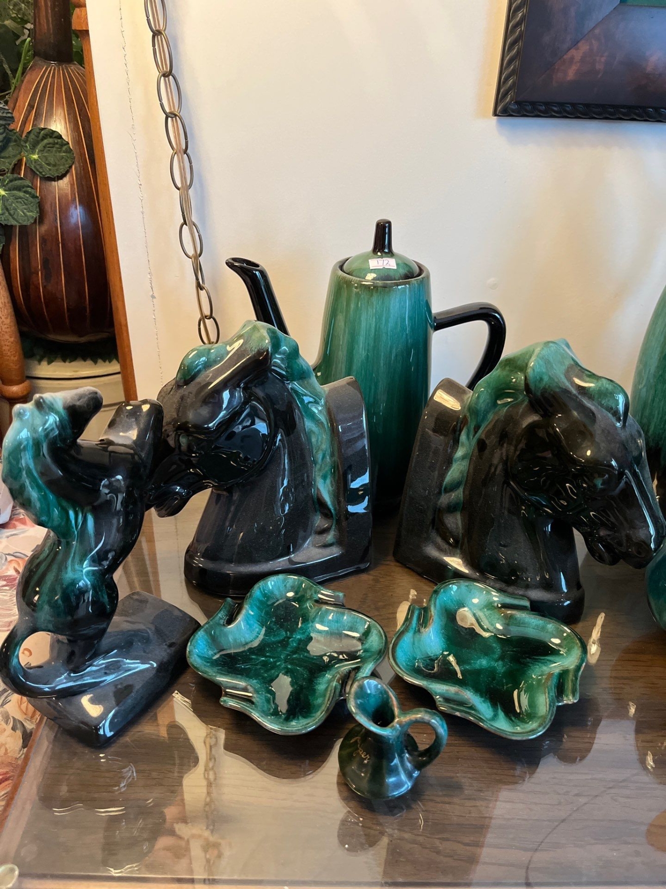 vintage mid-century modern Blue Mountain Pottery with two horse, bookends, teapot, two candy dishes, and one small vase