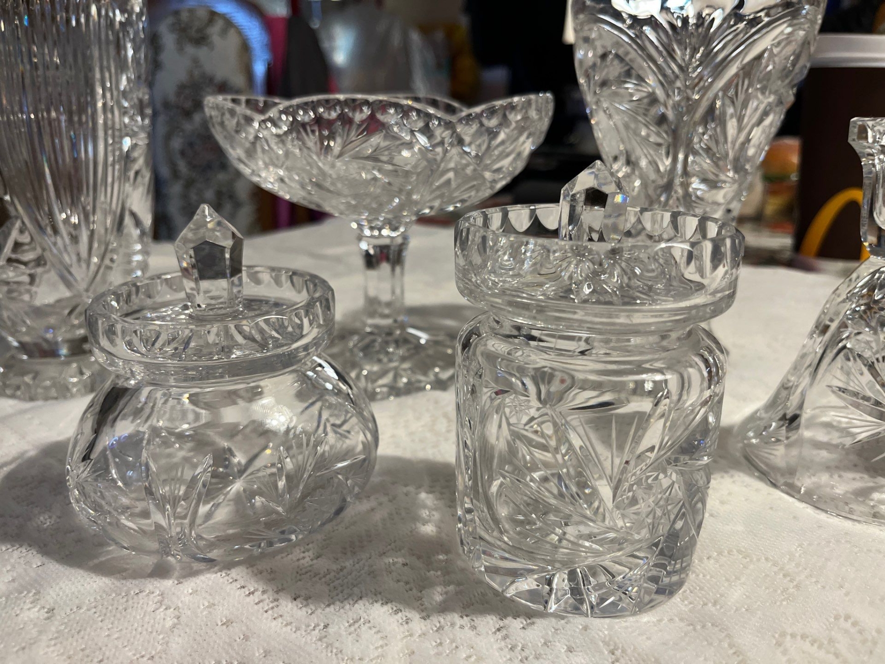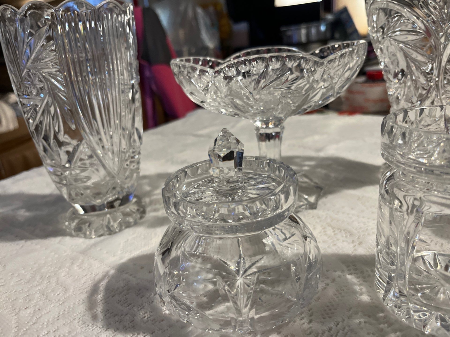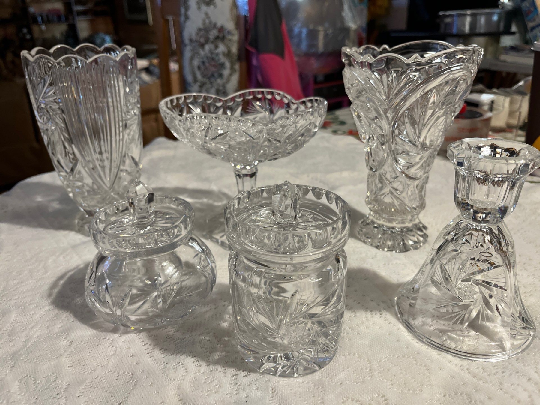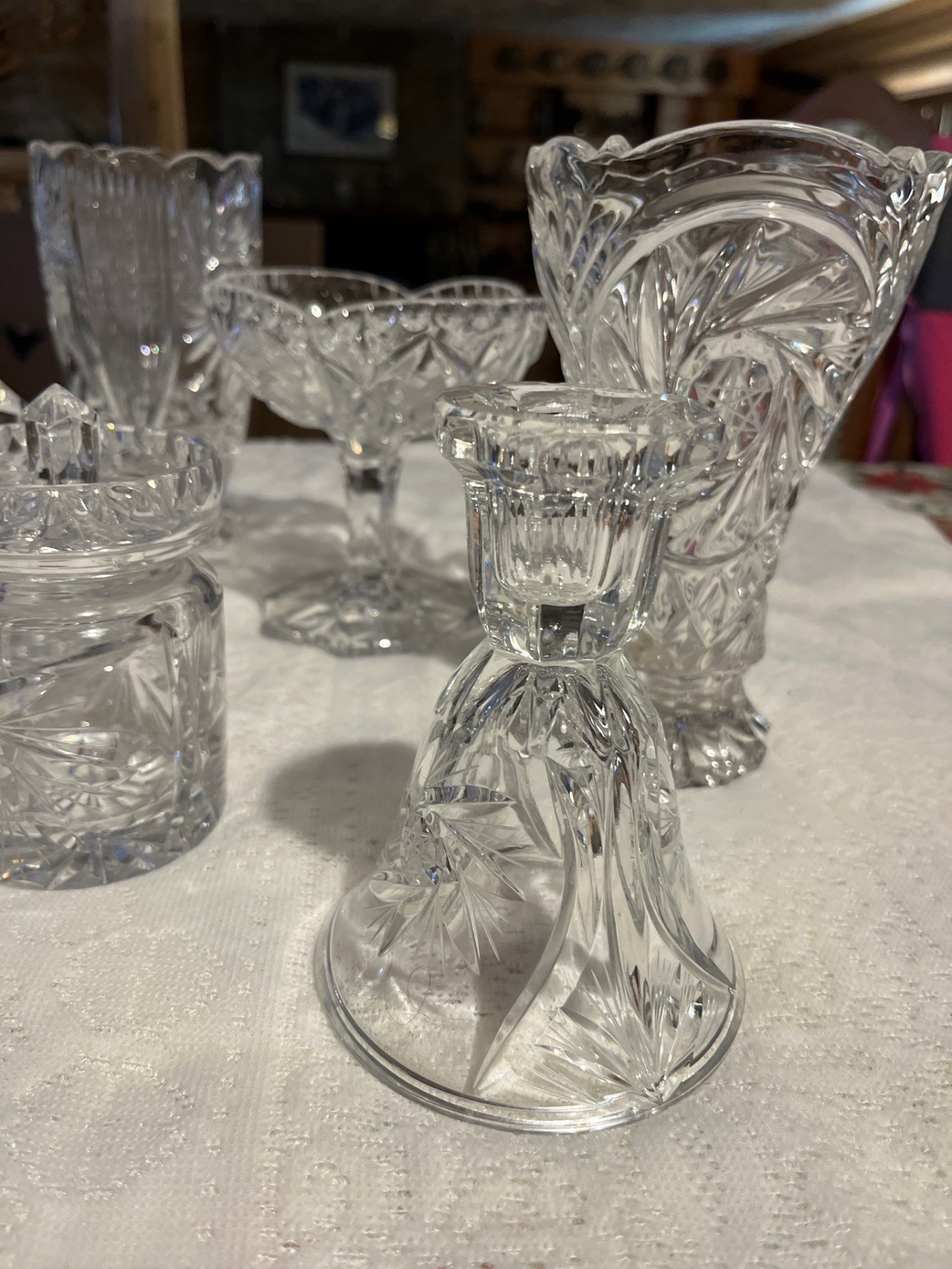 vintage pinwheel, crystal sugar, bowl, creamer, two vases, candy dish, and a candle holder