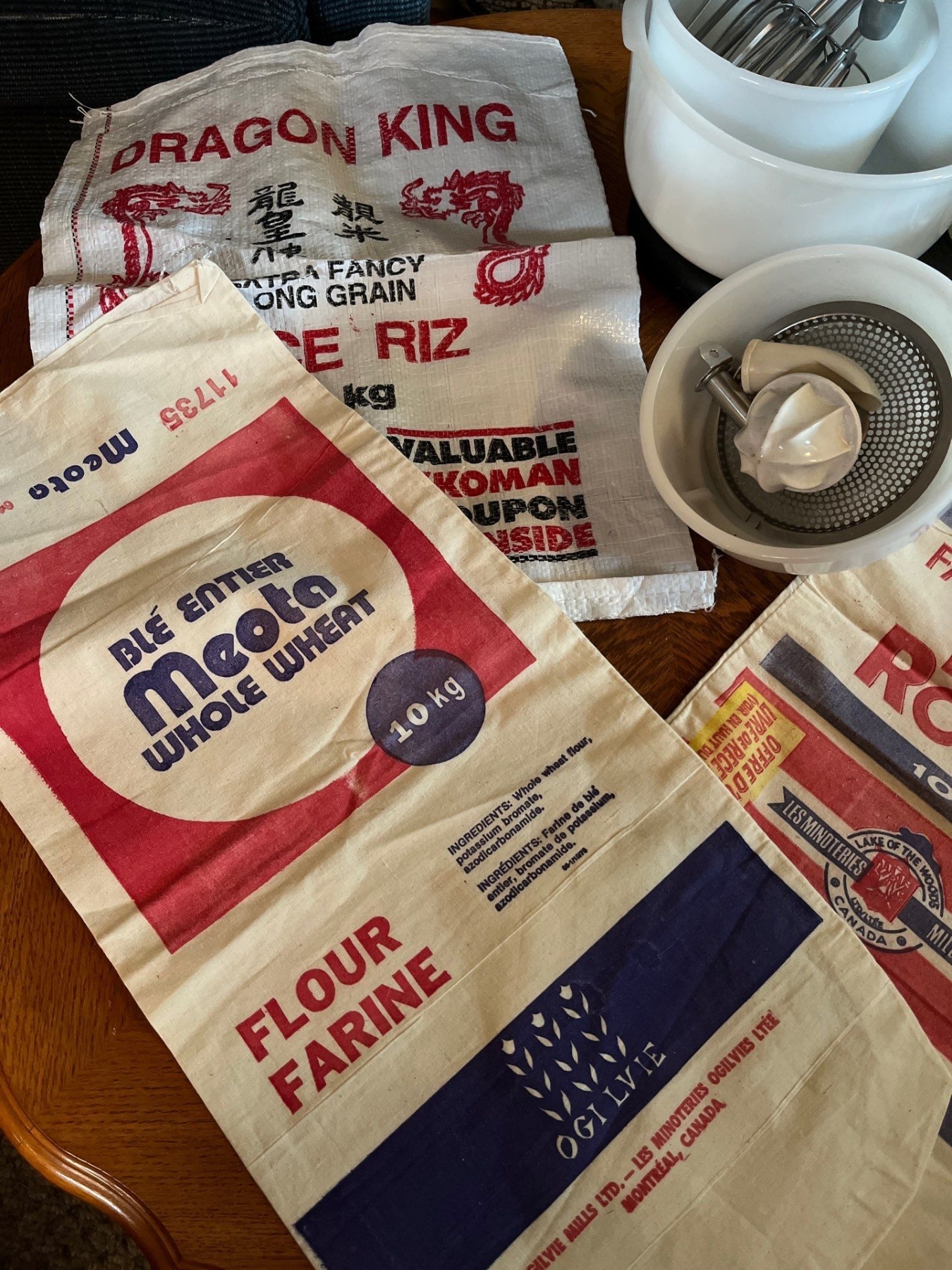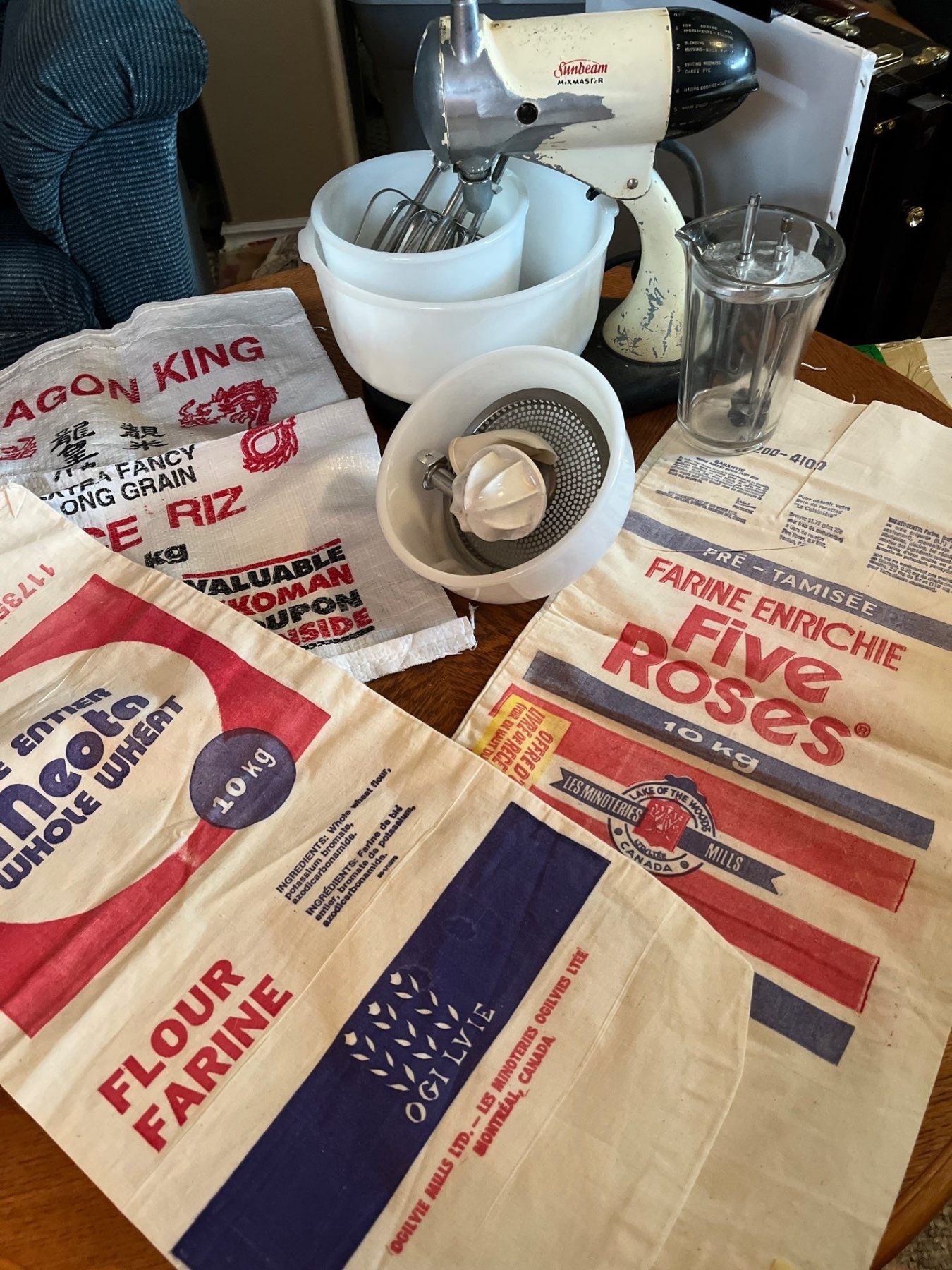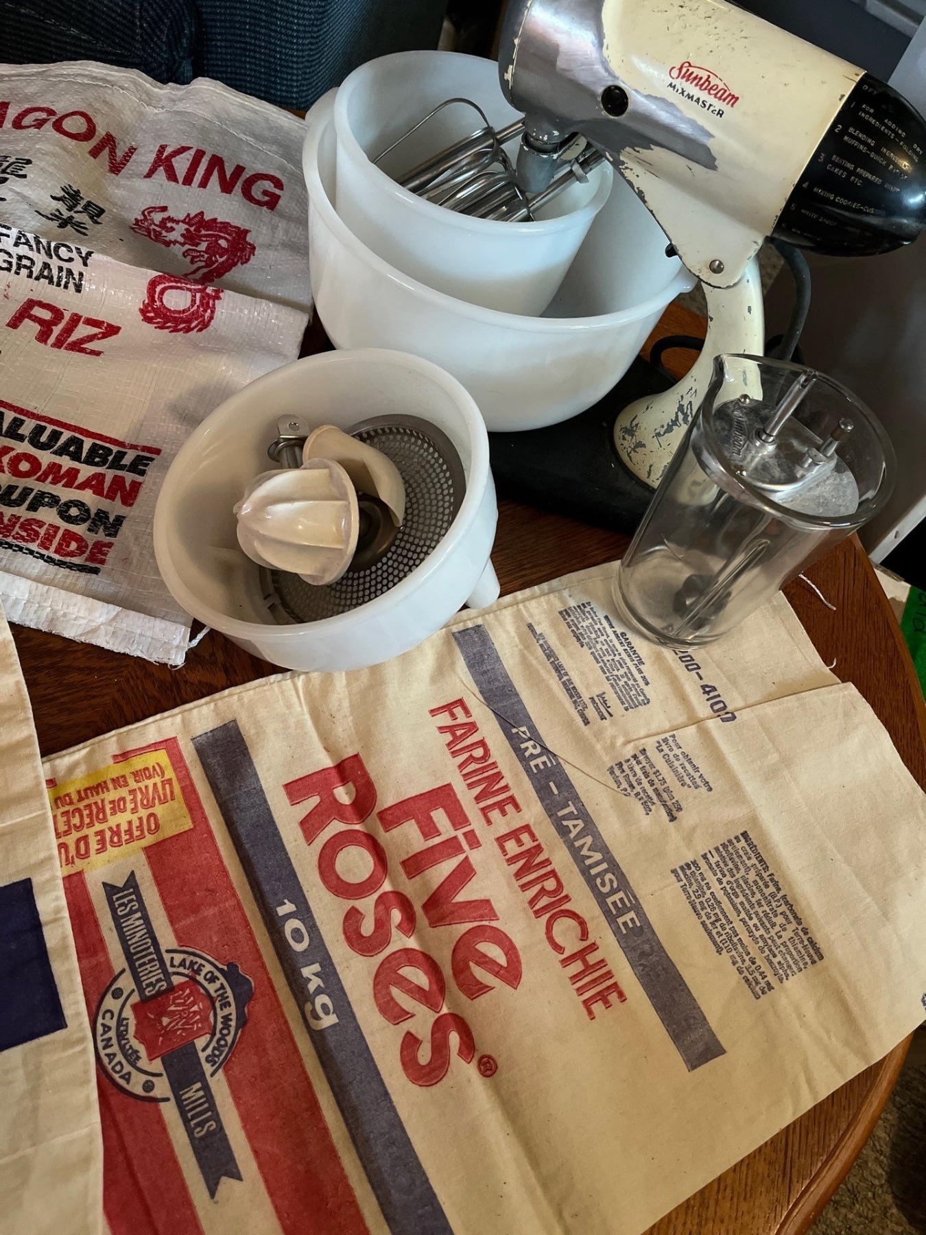 vintage sunbeam mixmaster with Pyrex bowls and two vintage flour sacks