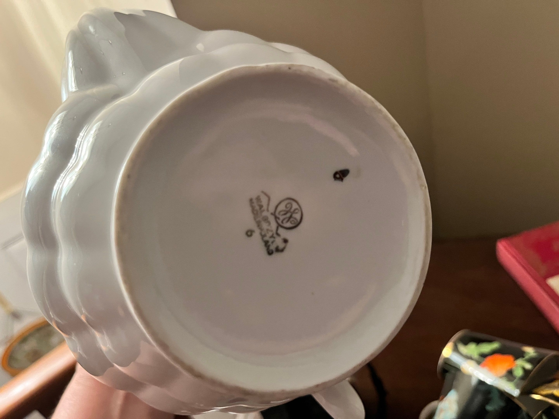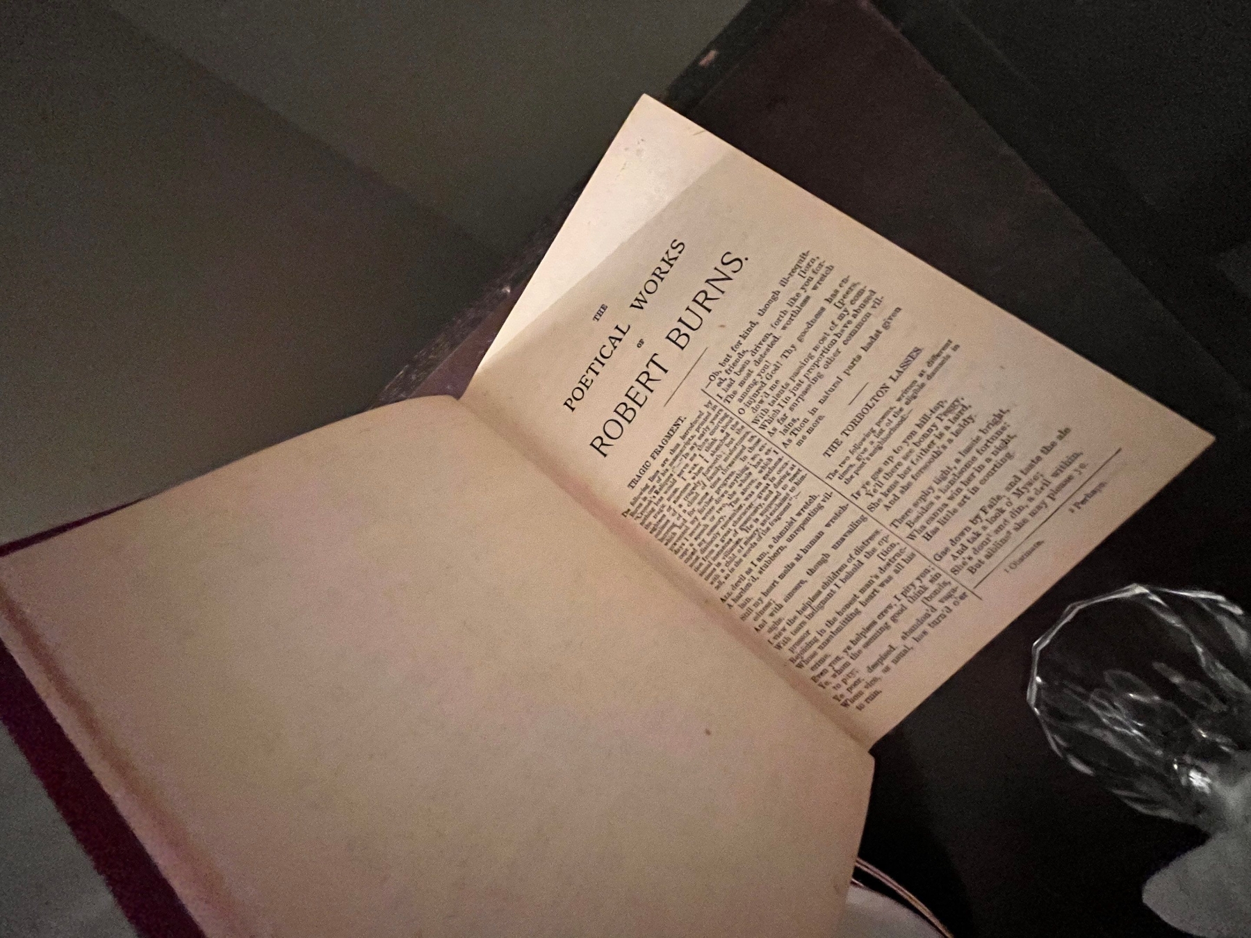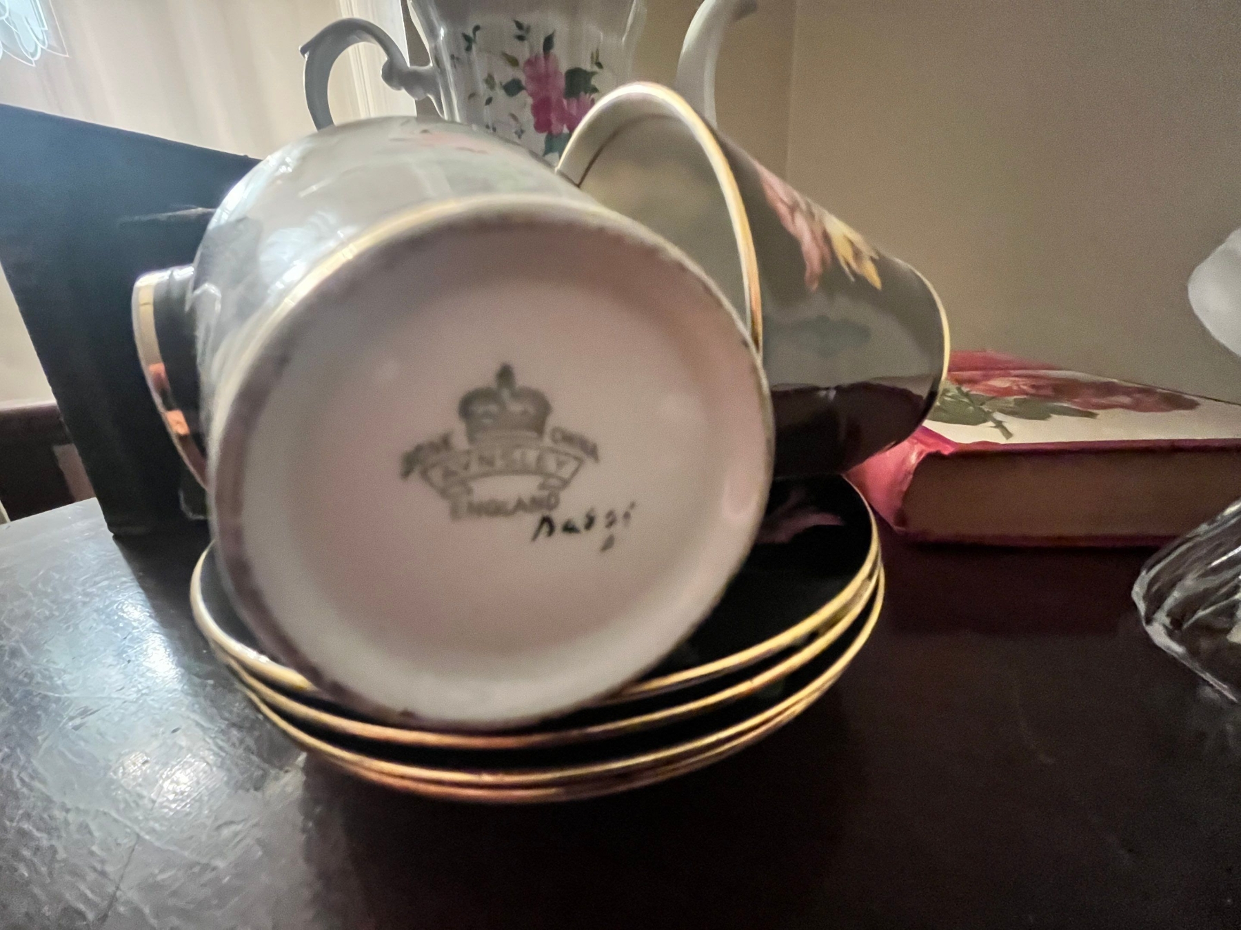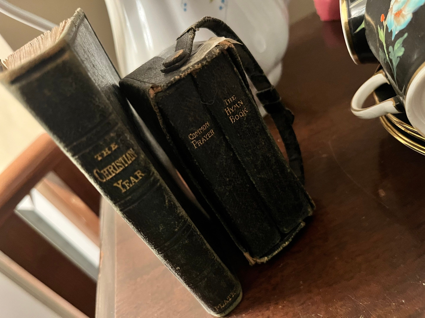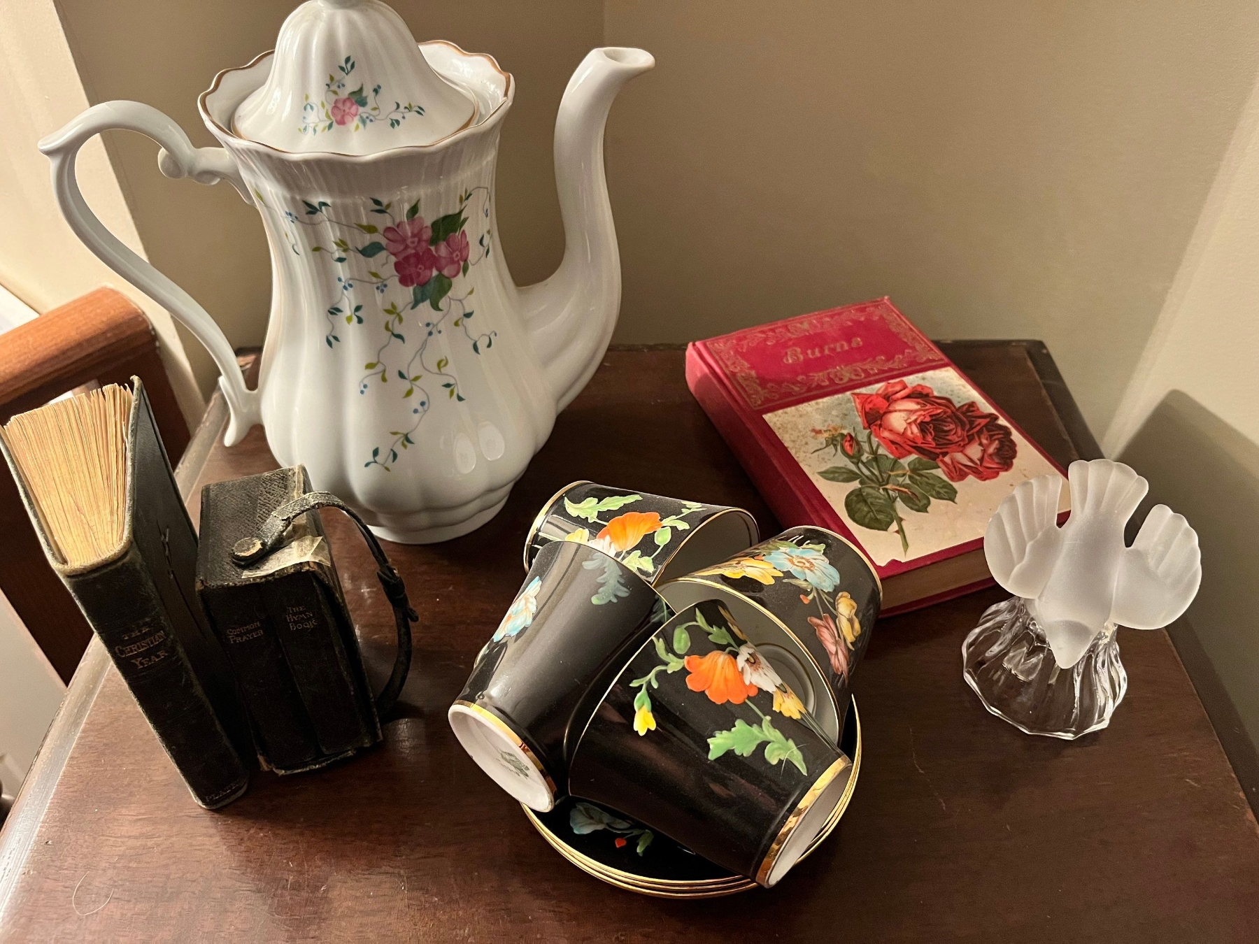 Vintage teapot with two small vintage leather bound bibles, and set of for tea, cups, and saucer and small book labelled BURNS