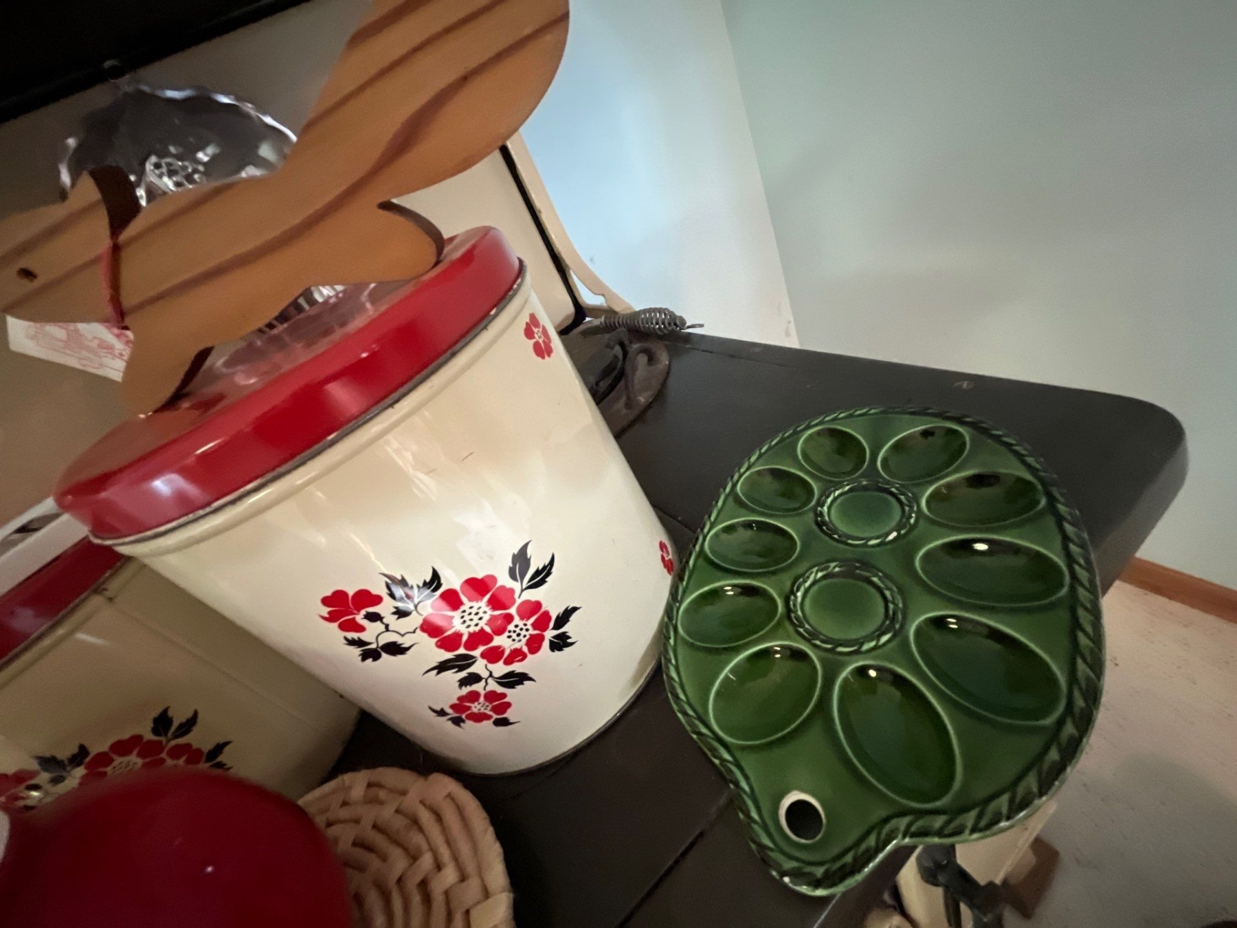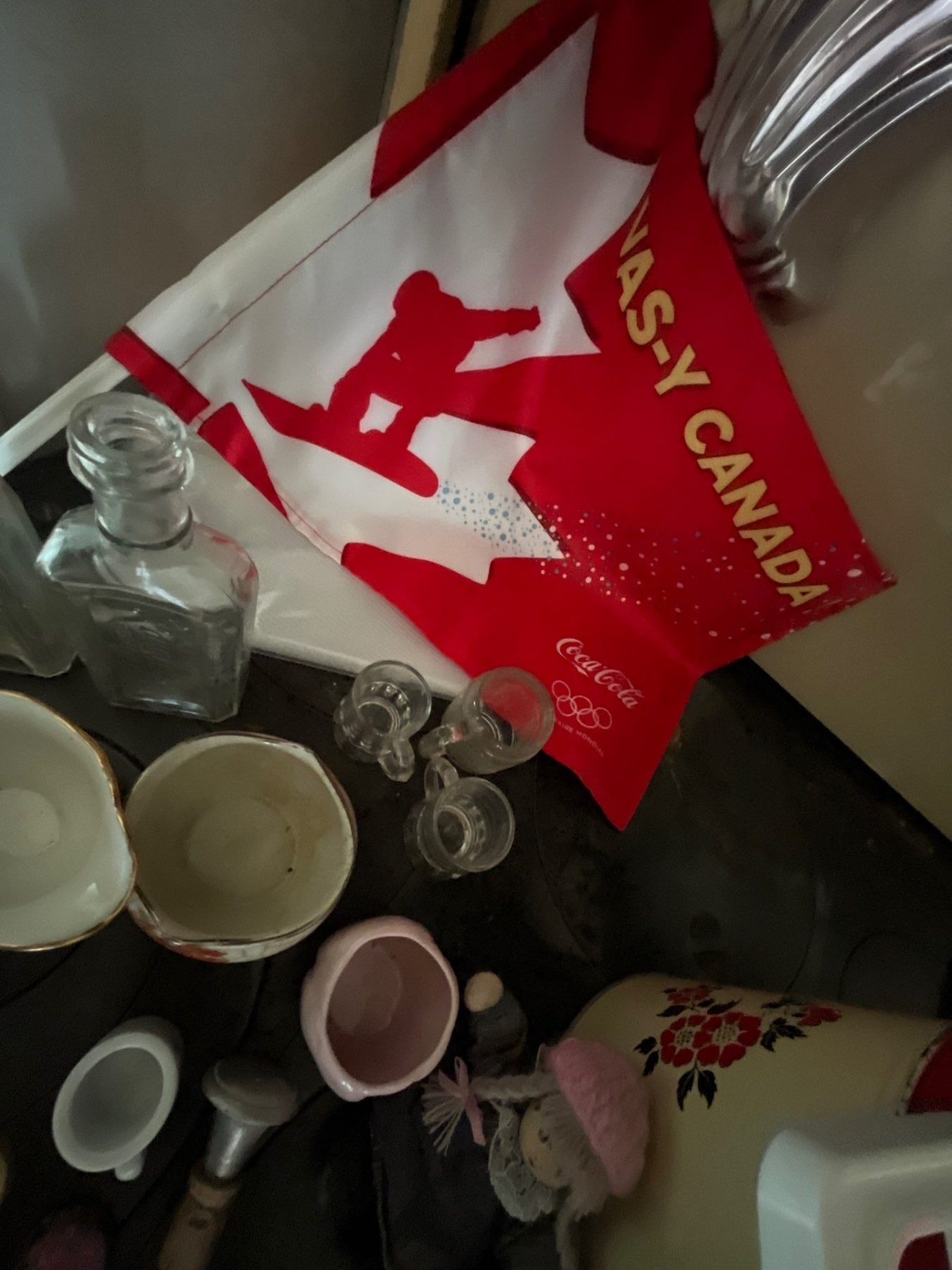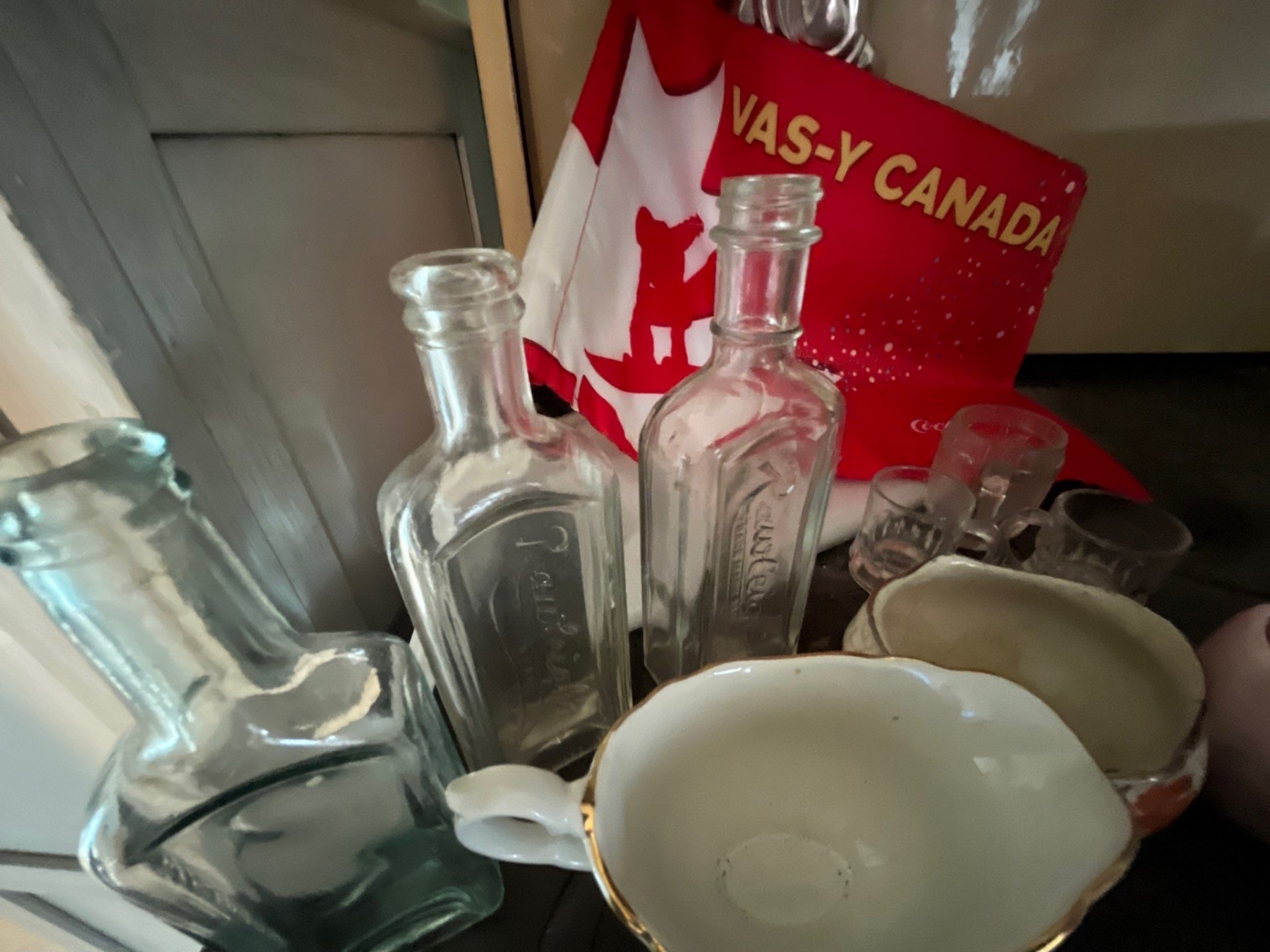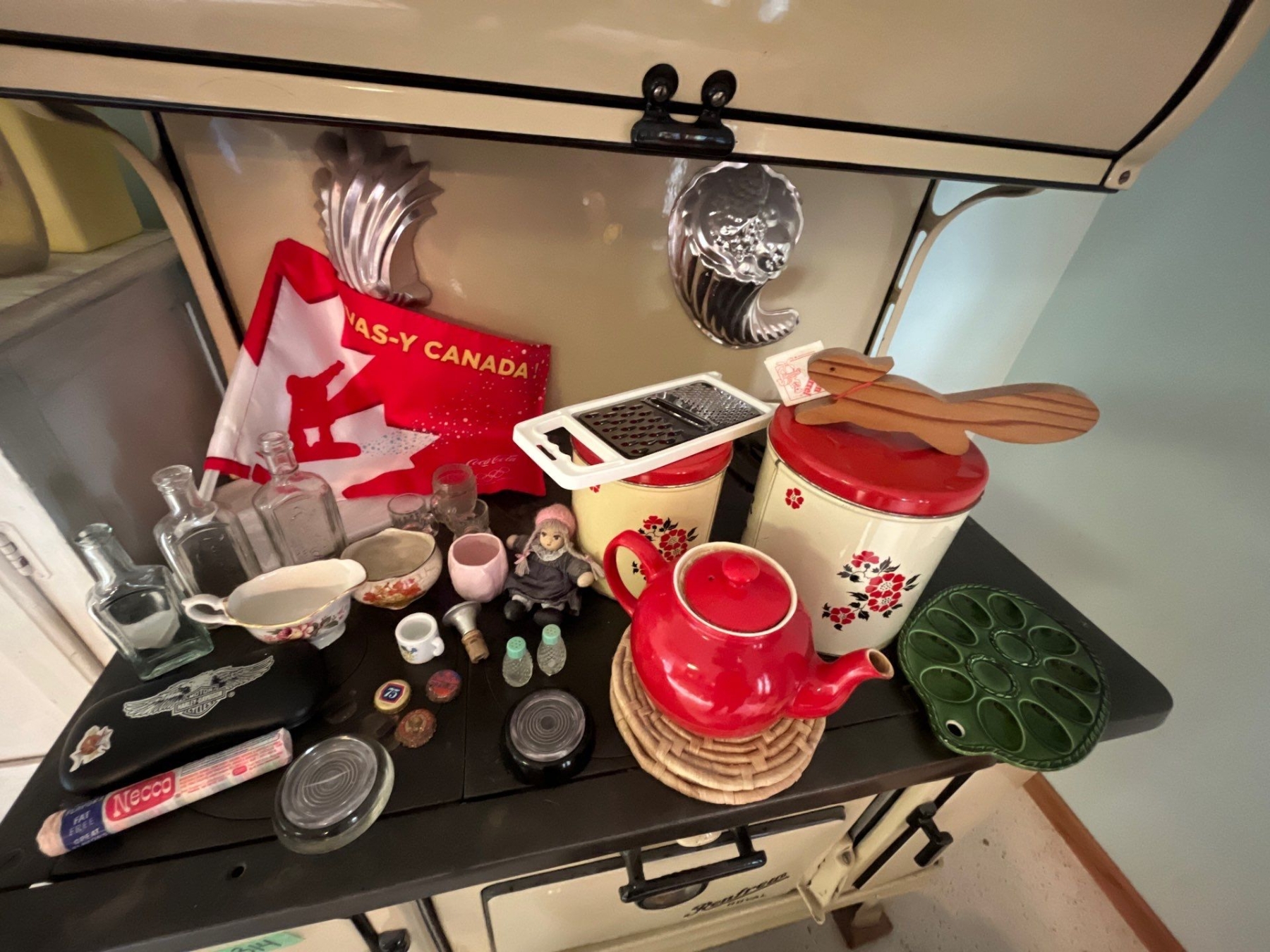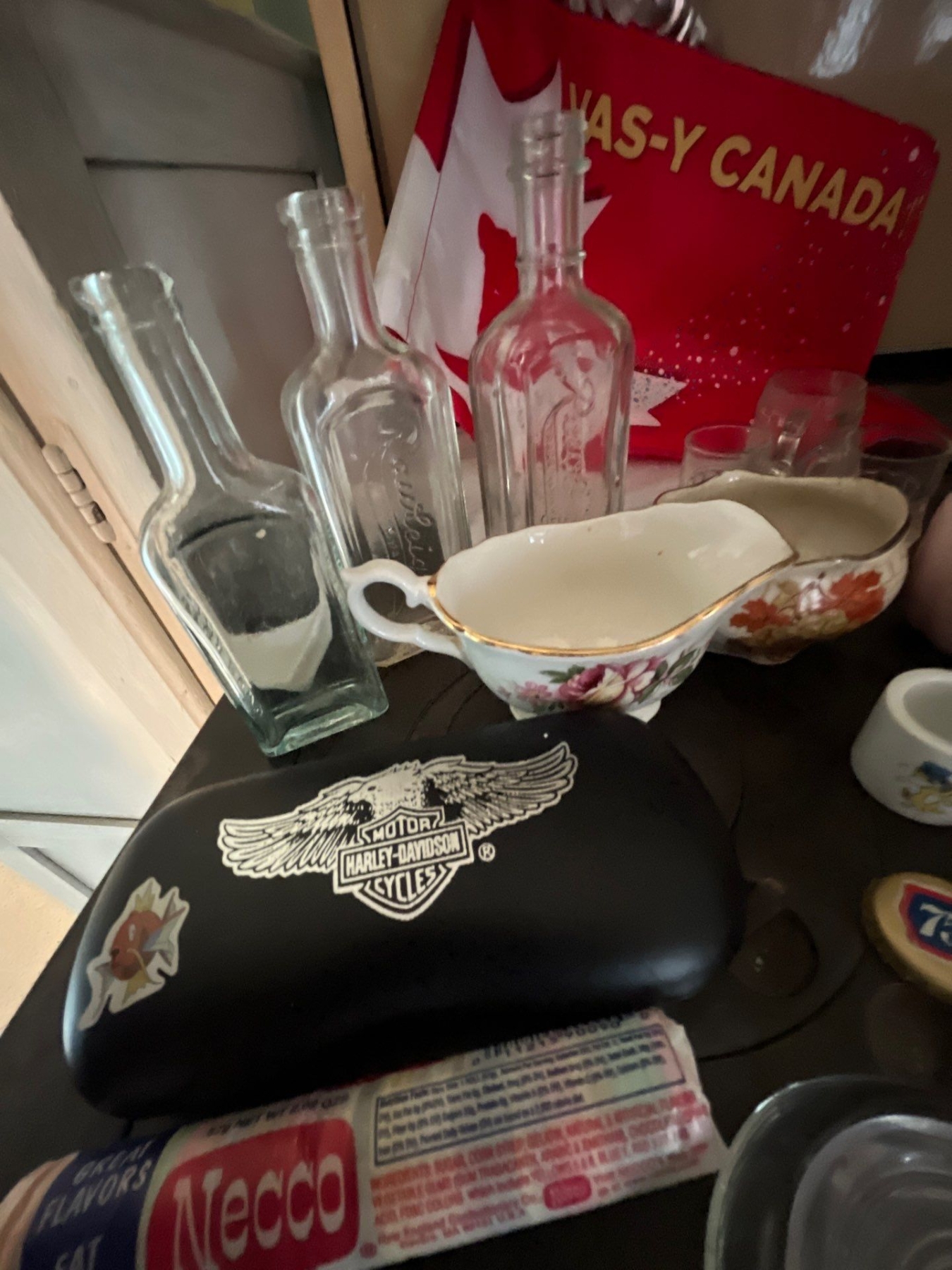 vintage tins, beautiful, handmade, red teapot vintage medicine bottles, Harley Davidson glass case v