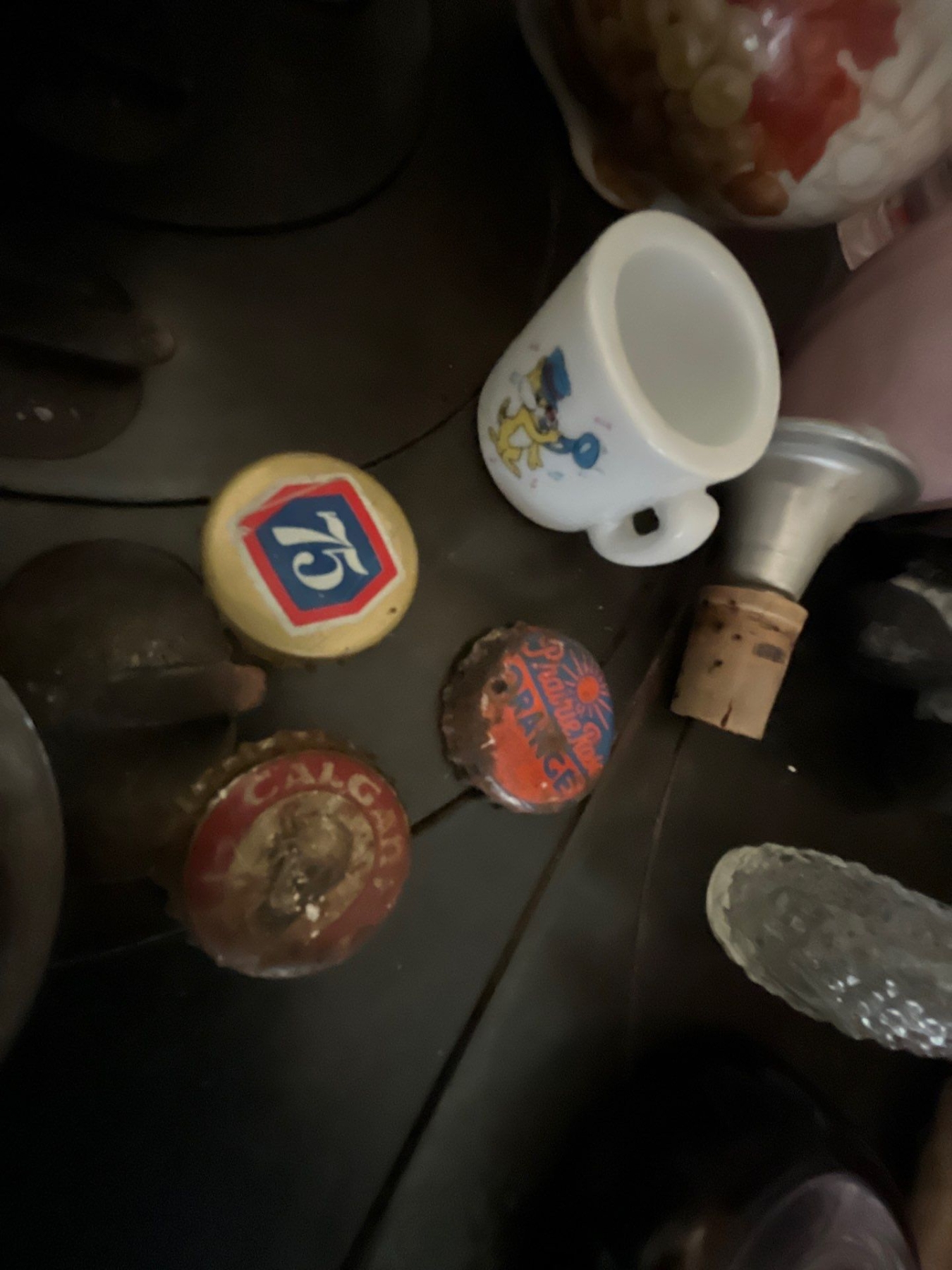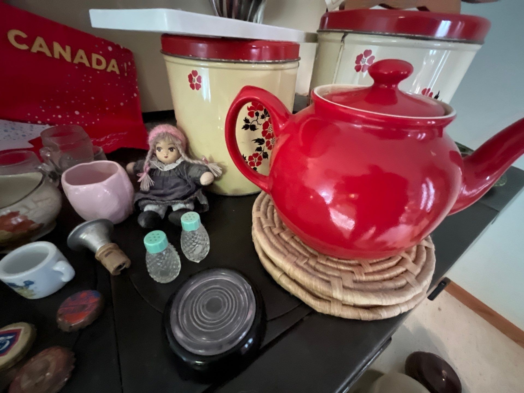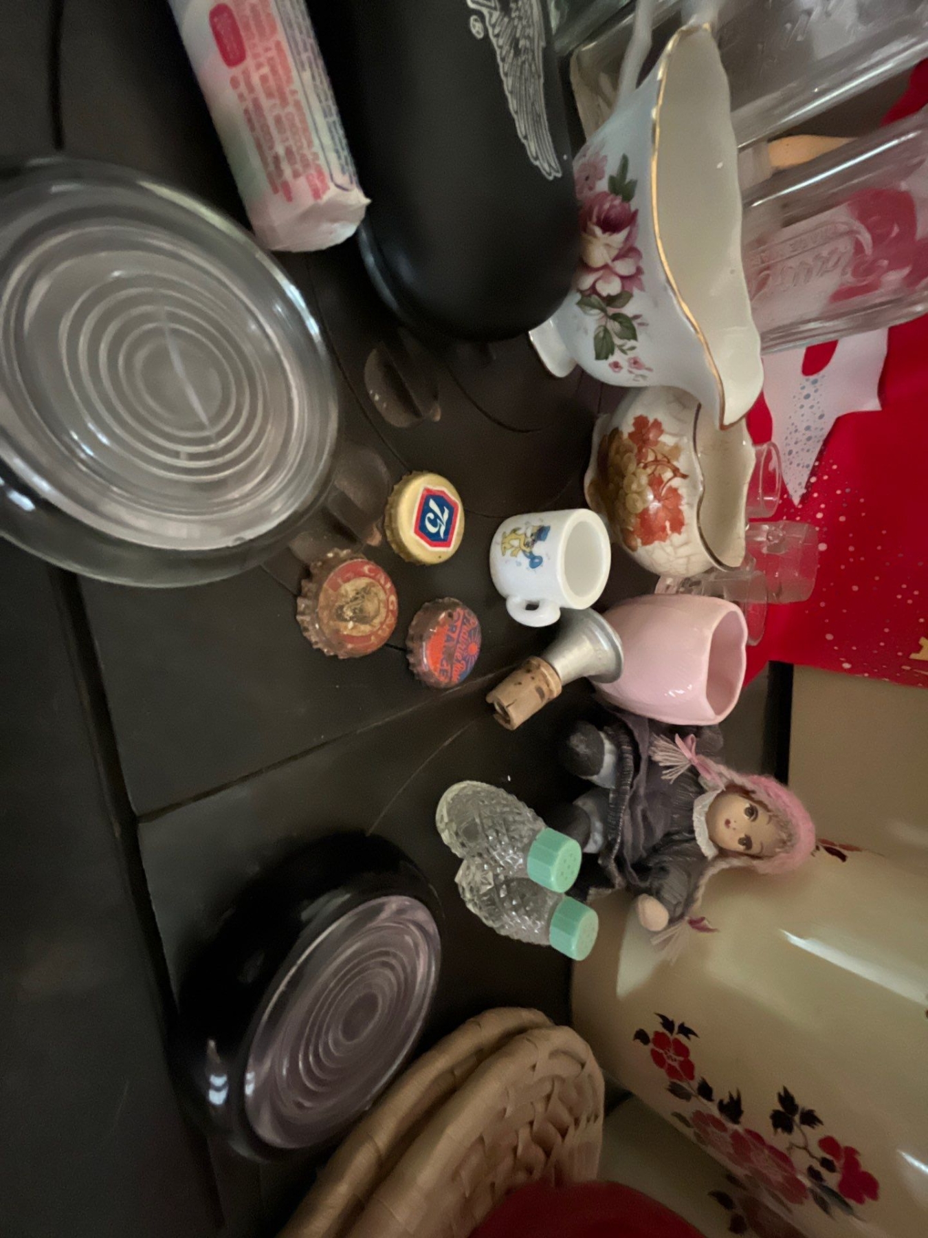 vintage tins, beautiful, handmade, red teapot vintage medicine bottles, Harley Davidson glass case vintage bottle caps with a vintage baby blue, small salt and pepper shaker