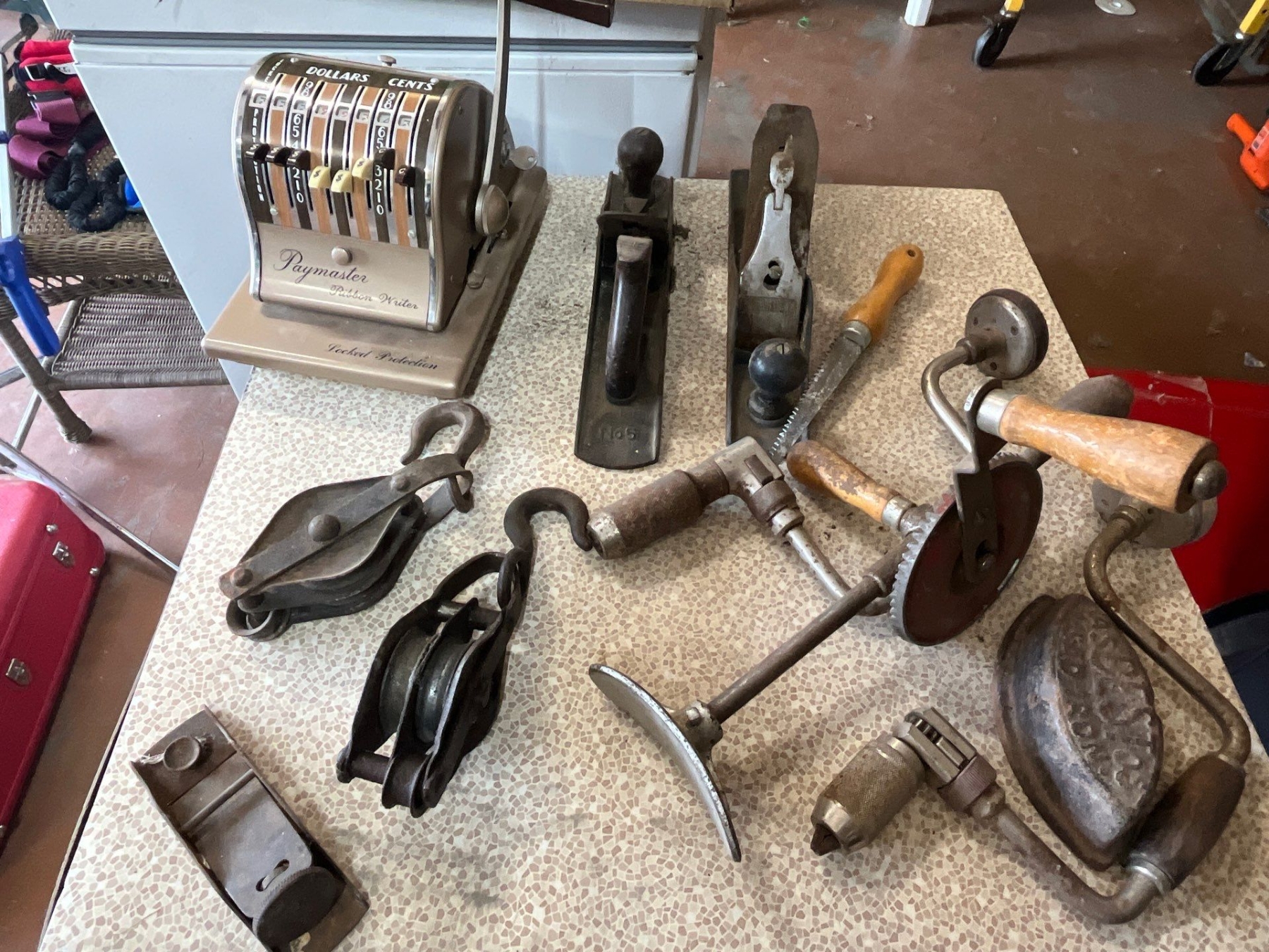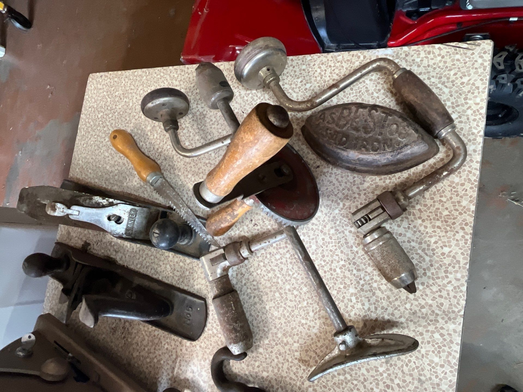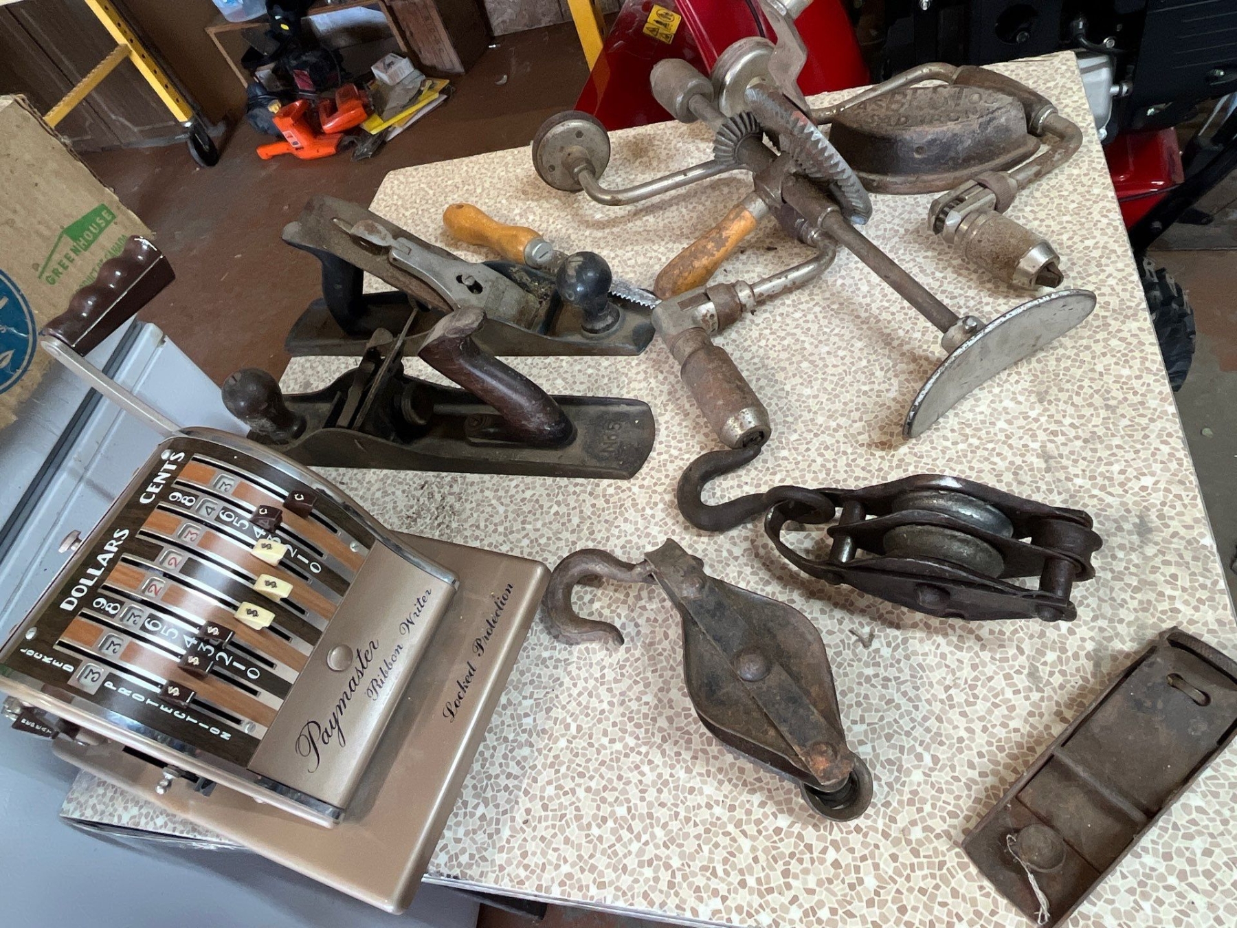 vintage tools with antique pulleys a number five Stanley wood, planer, and antique hand drills