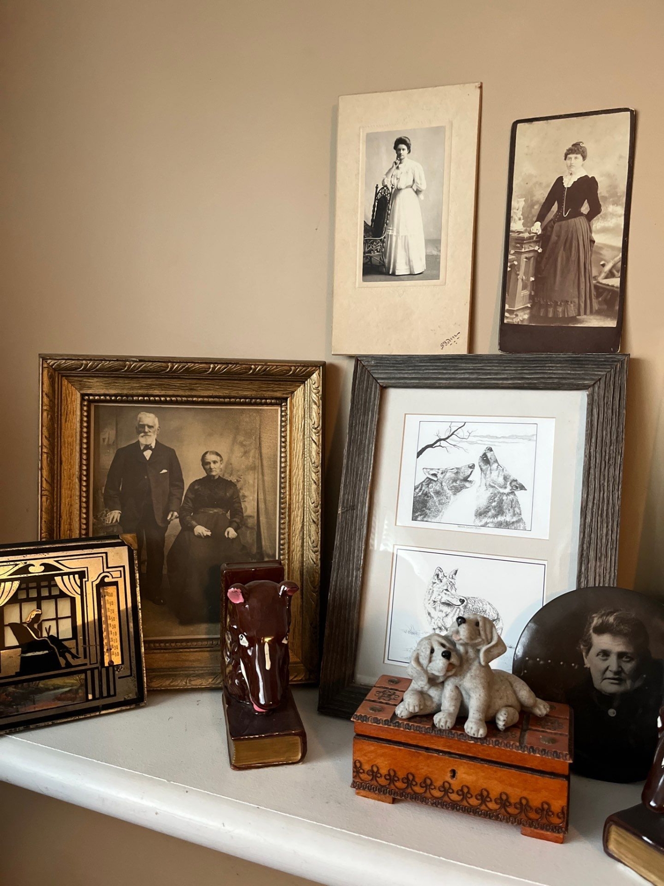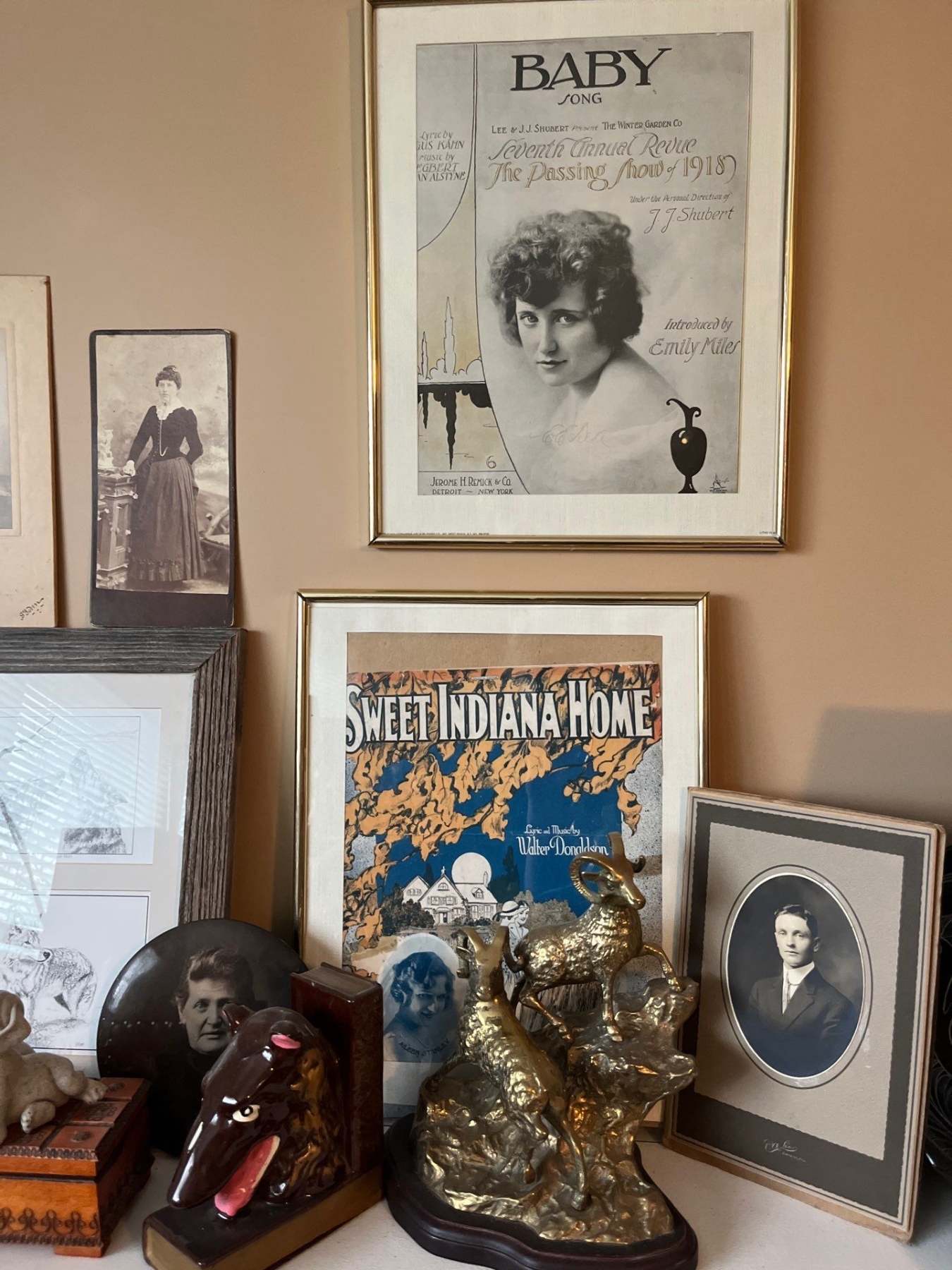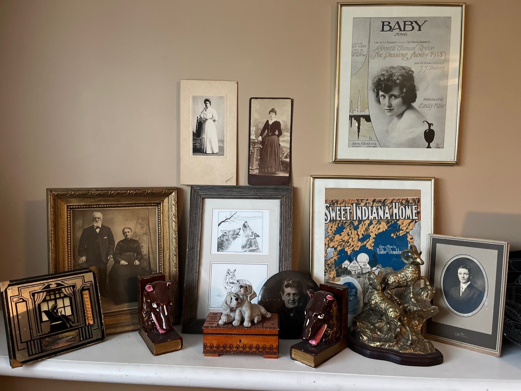 vintage wolf book ends a beautiful brass ram sculpture, cool antique pictures and two early 1900s music posters framed