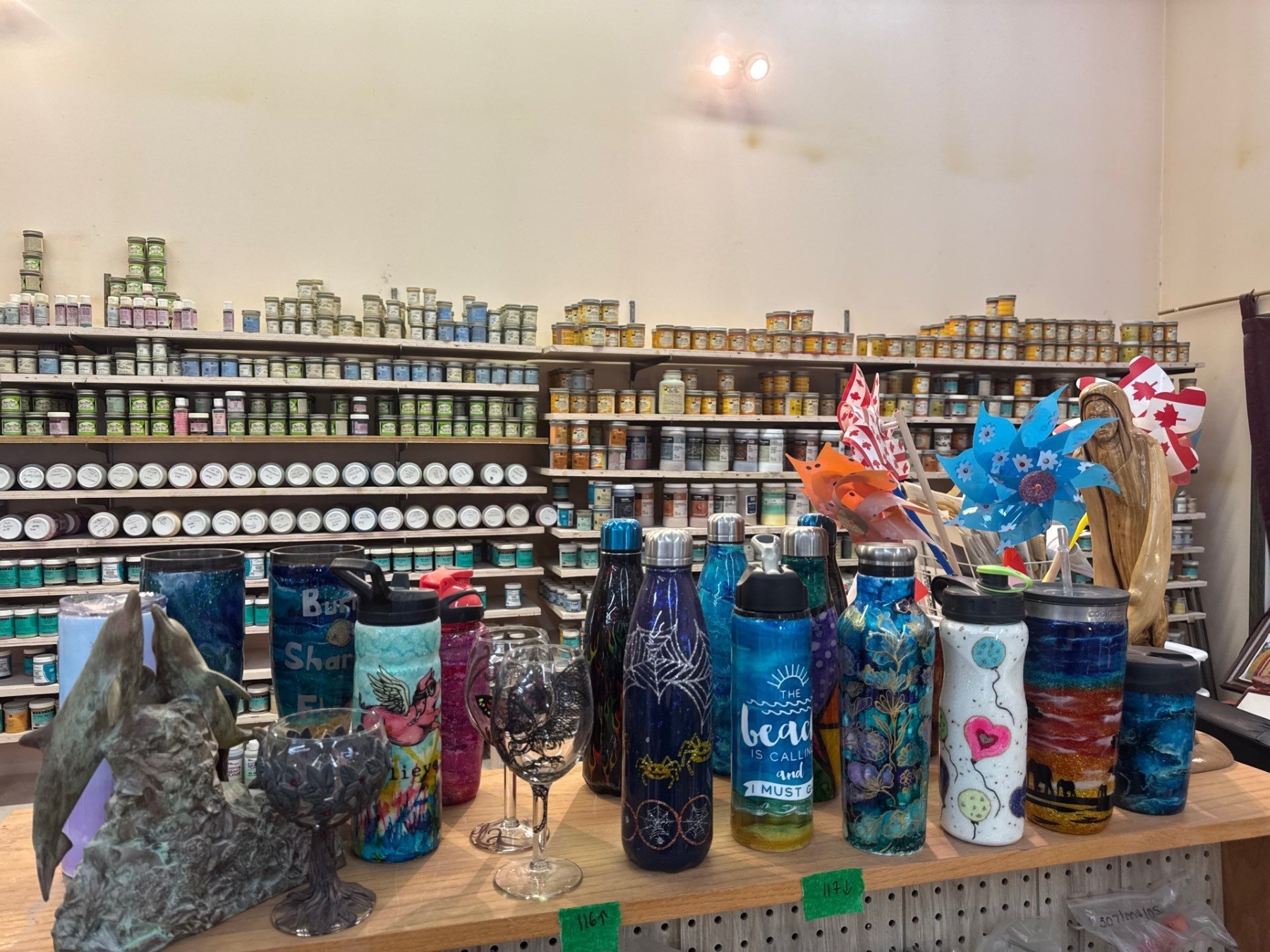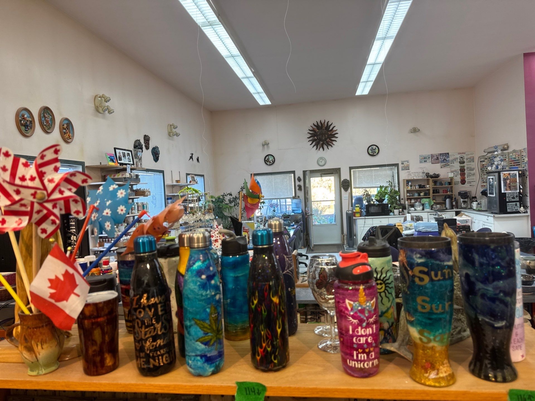 water jugs, insulated mugs, glassware, statues, dolphin statue